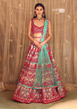 Featuring a blue pink brocade base lehenga with a belt and embroidered net dupatta.