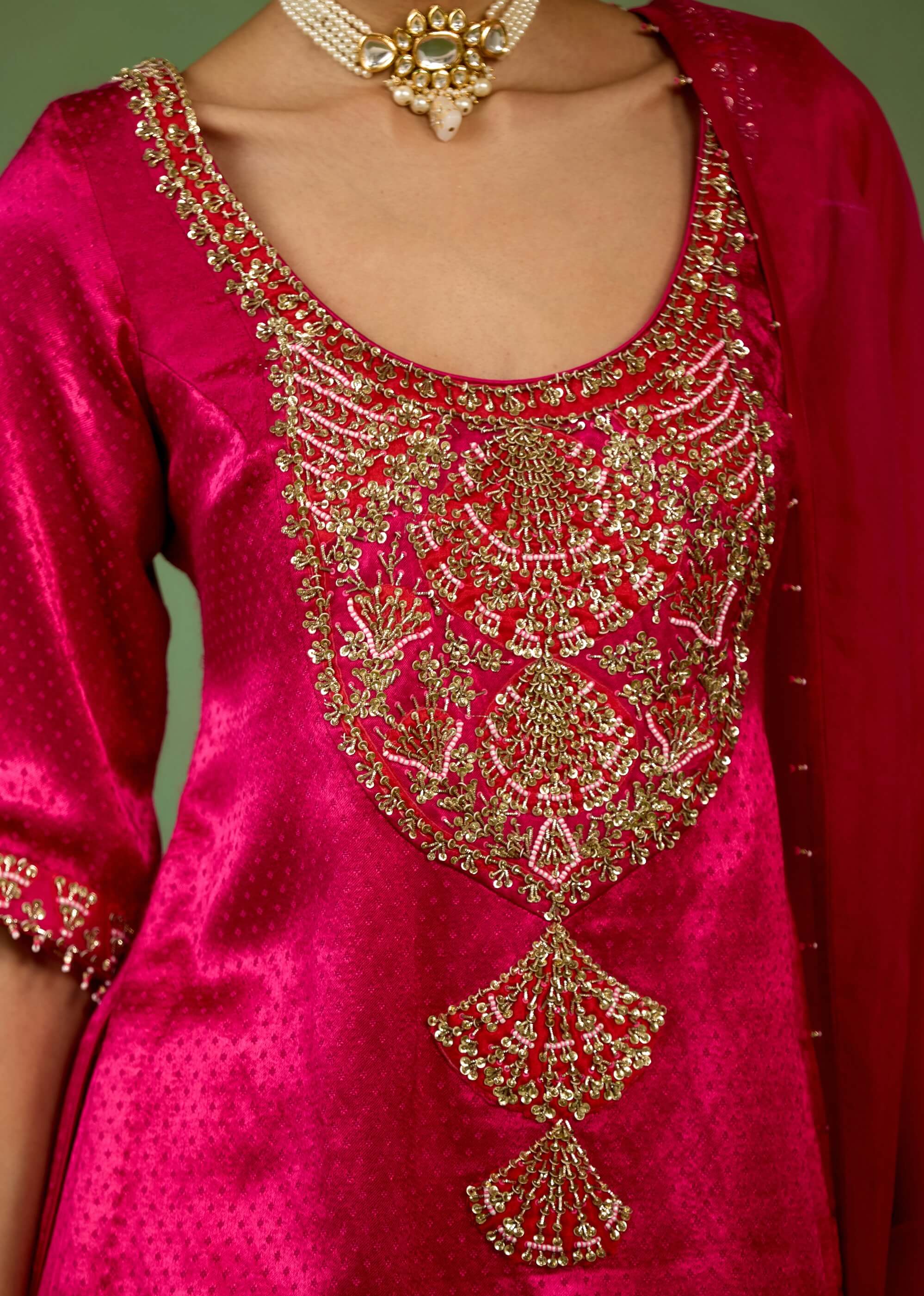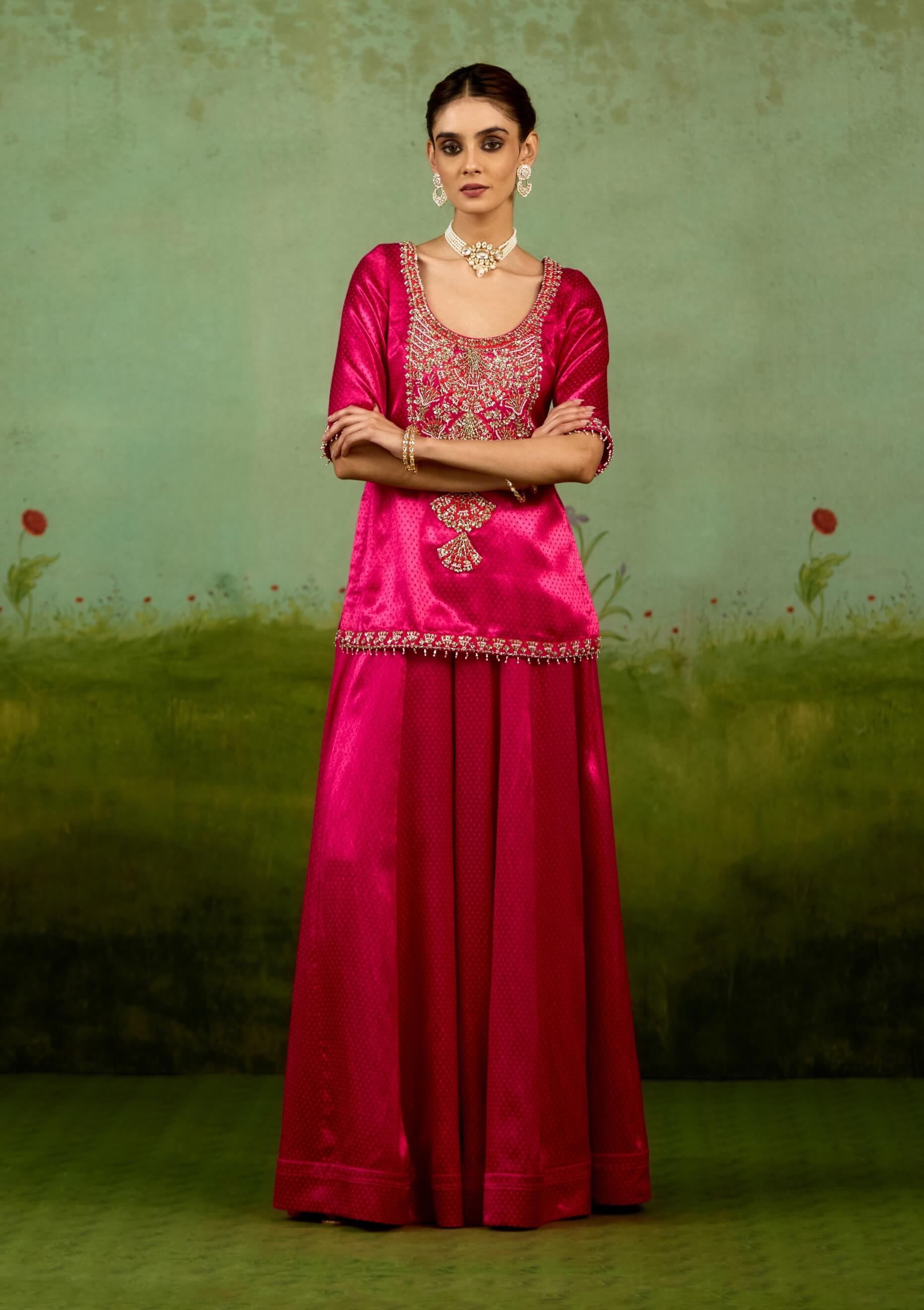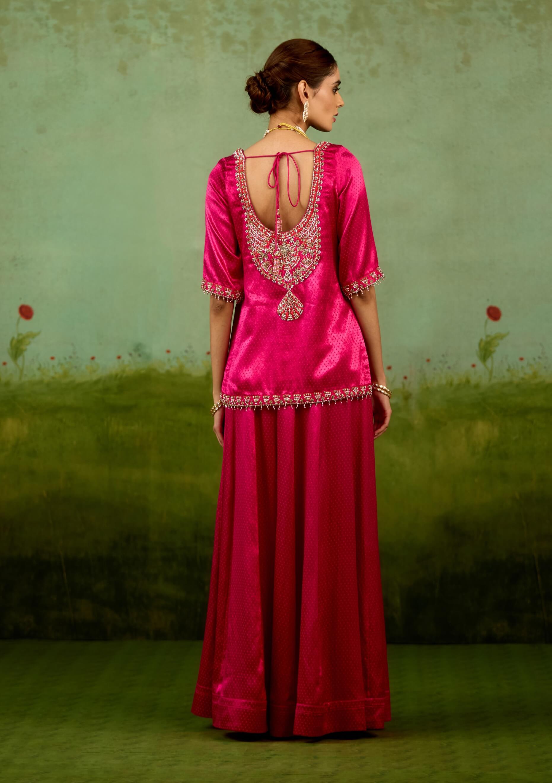 A celebration of colour and craftsmanship. This mushru silk ensemble features intricate zardozi embroidery across the top and sharara, finished with an airy organza dupatta. Designed for festive soirées, wedding celebrations, and statement occasions.