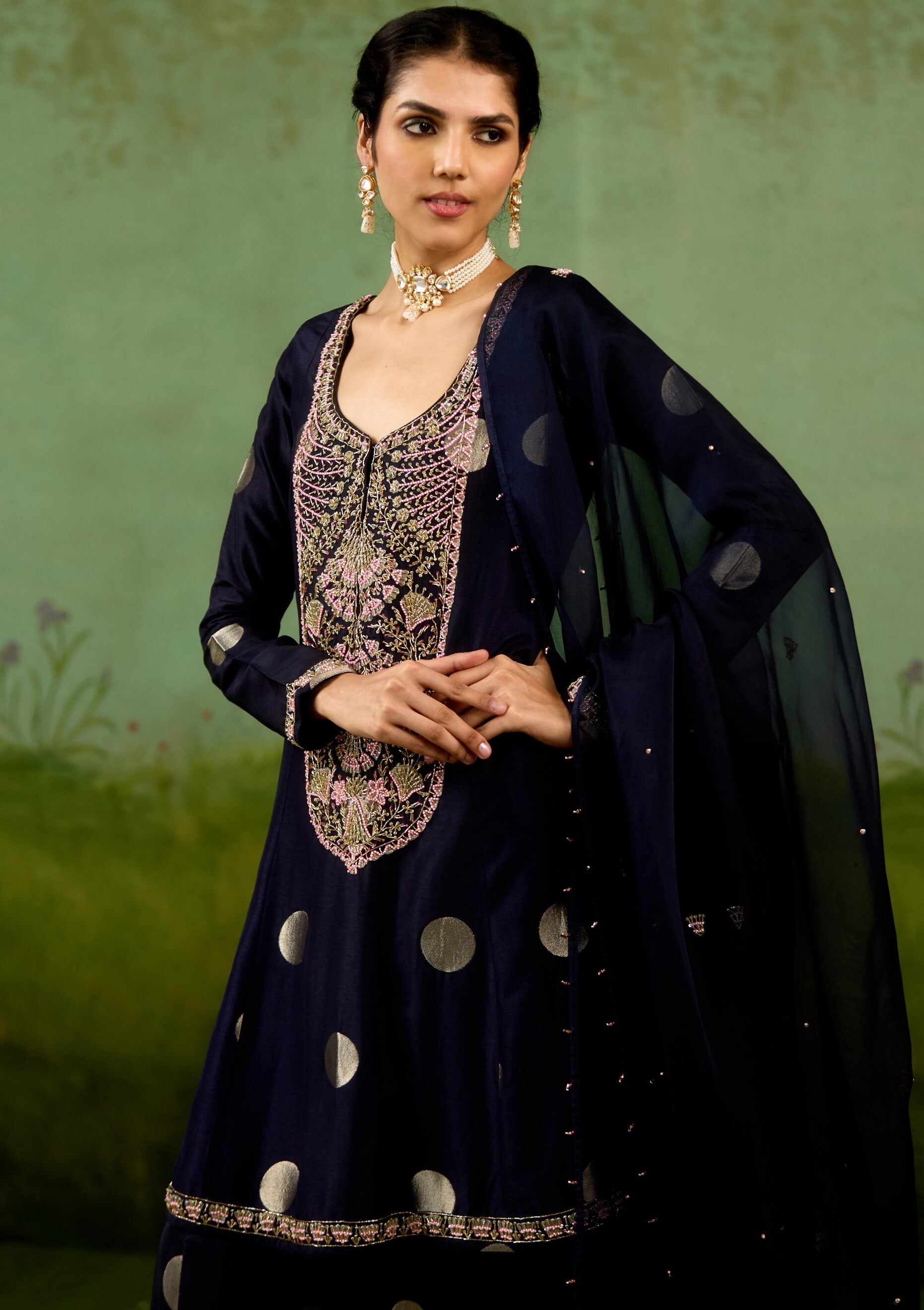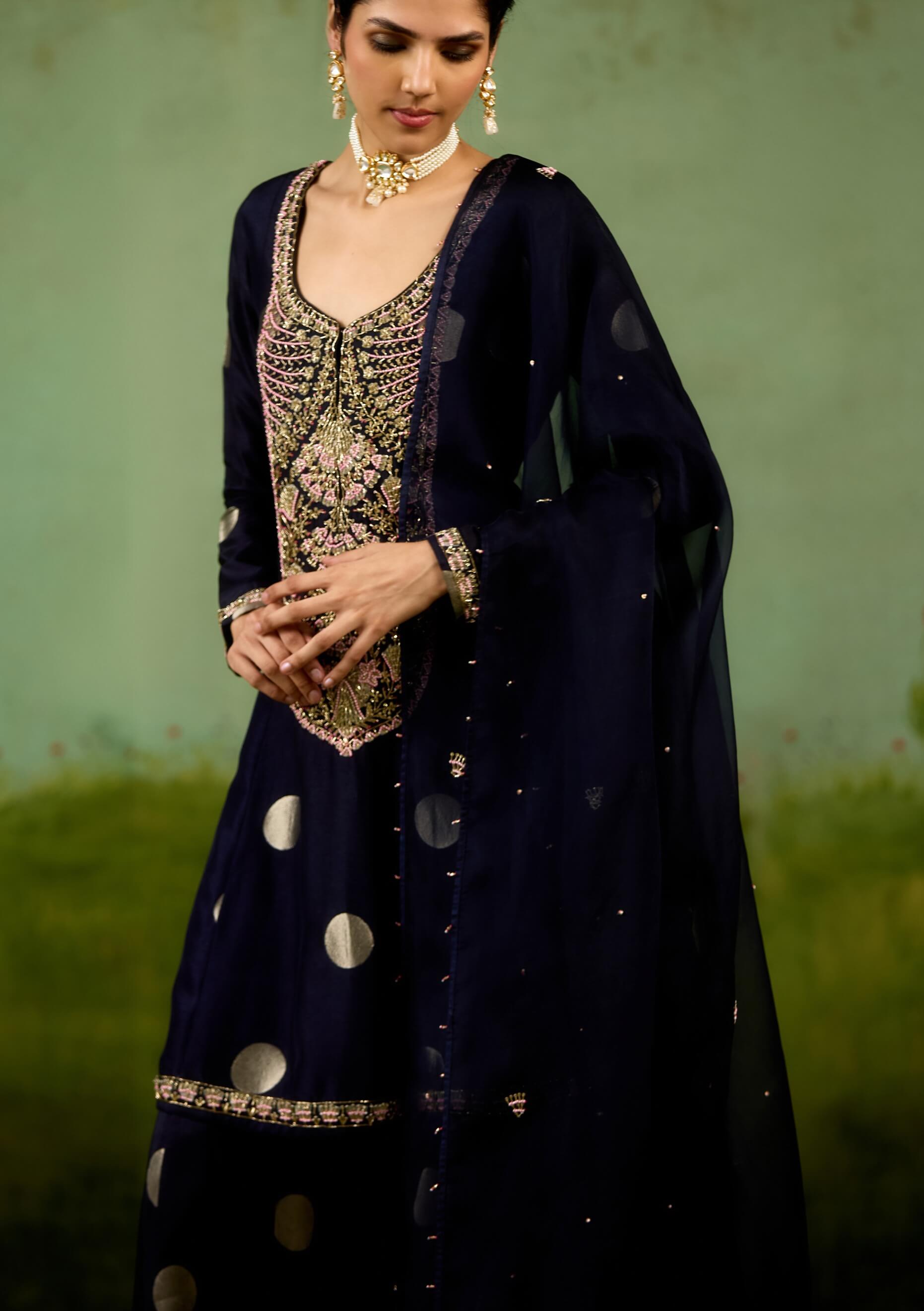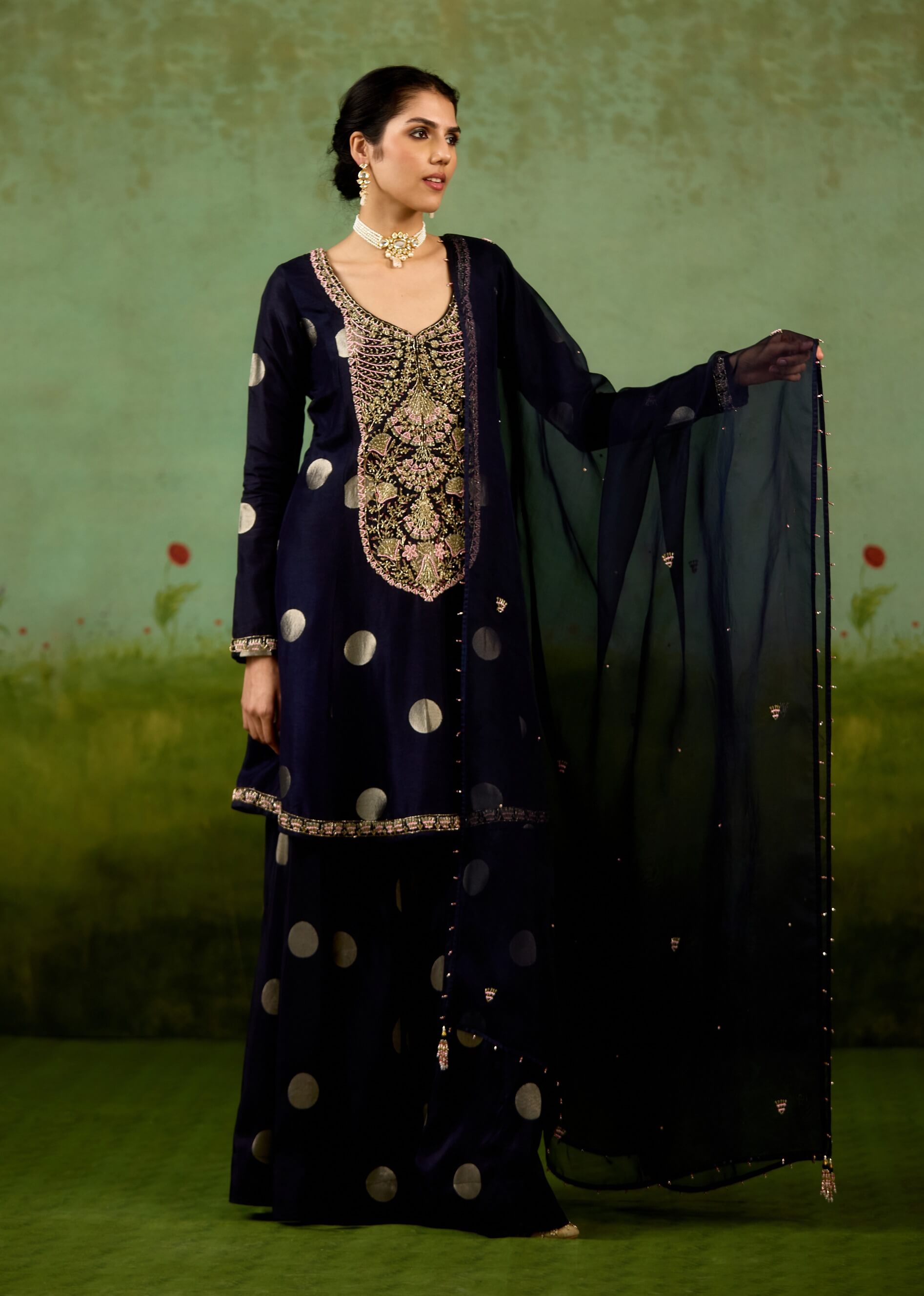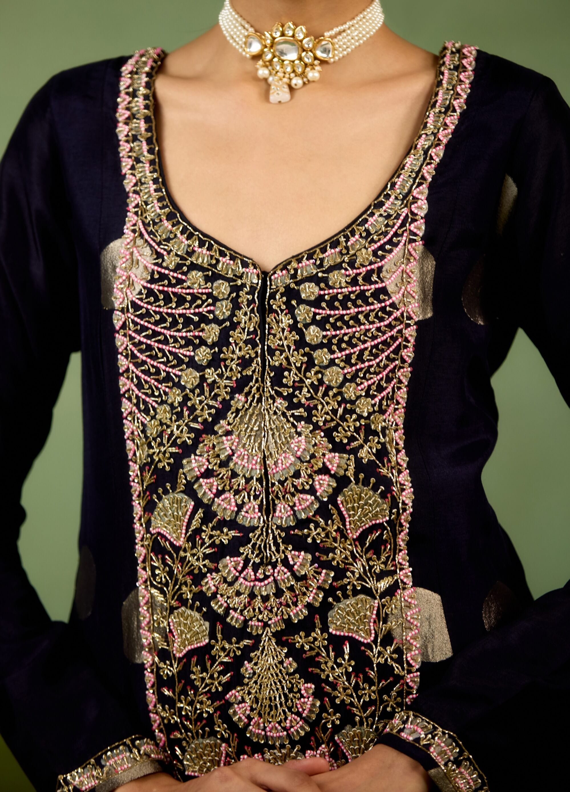 Midnight allure personified. This zardozi-embroidered silk brocade kurta with flared sharara and organza dupatta embodies refined craftsmanship. Perfect for receptions, festive dinners, or cocktail celebrations.