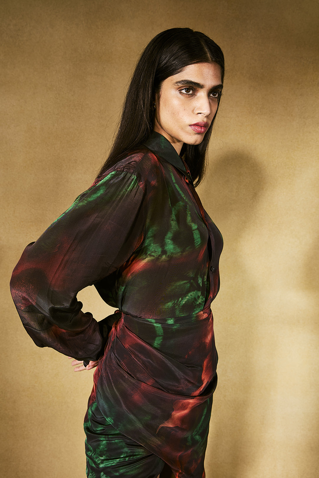 Featuring an abstract flame print, this printed shirt and slit skirt set brings bold energy to fluid fabric, offering movement, ease, and a modern silhouette suited for festive and contemporary settings.