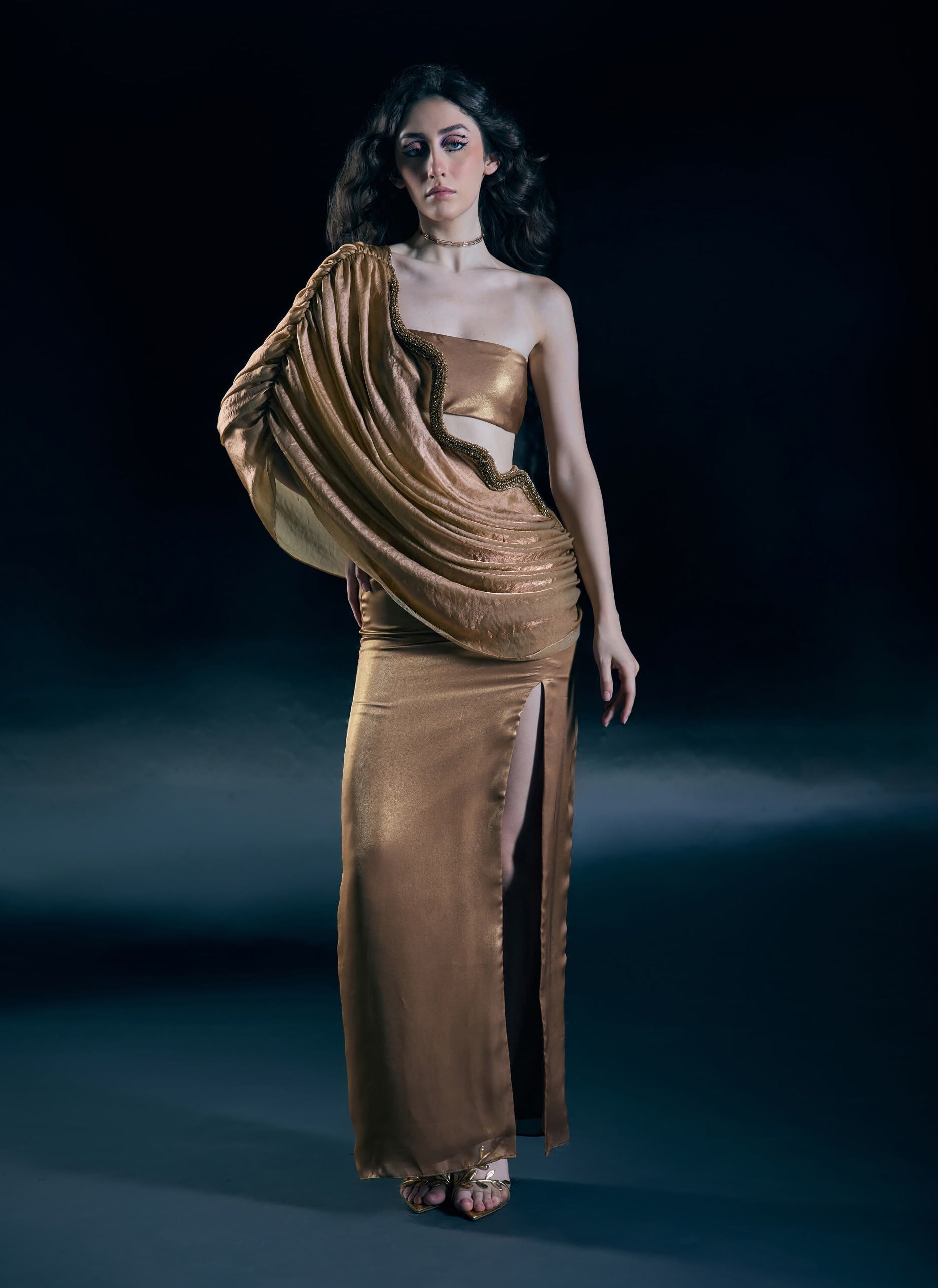 Radiating golden luminosity, this solar-gold co-ord set pairs a sleek tube top with an A-line skirt, accented by a draped dupatta embroidered in serpentine motifs.