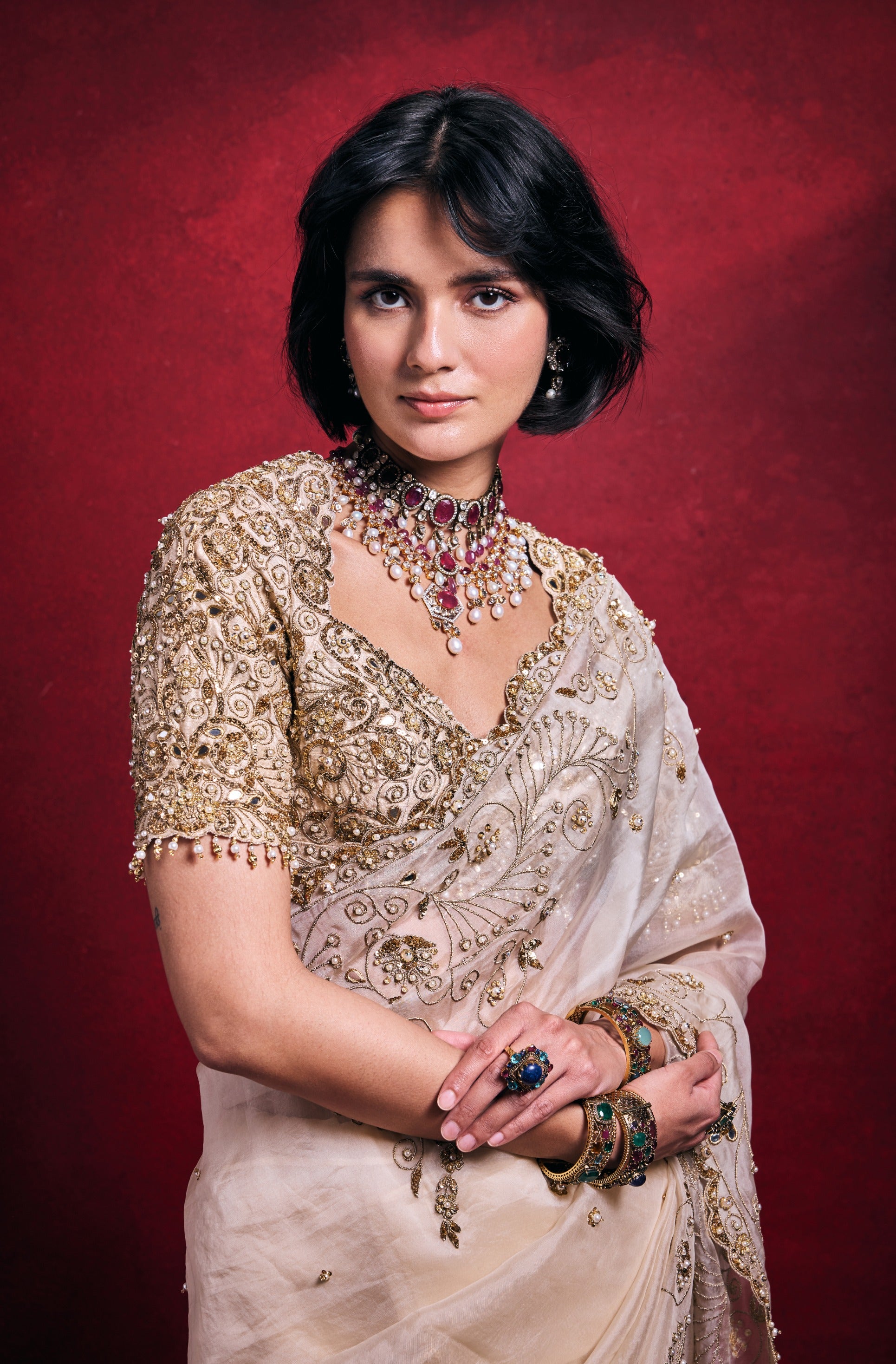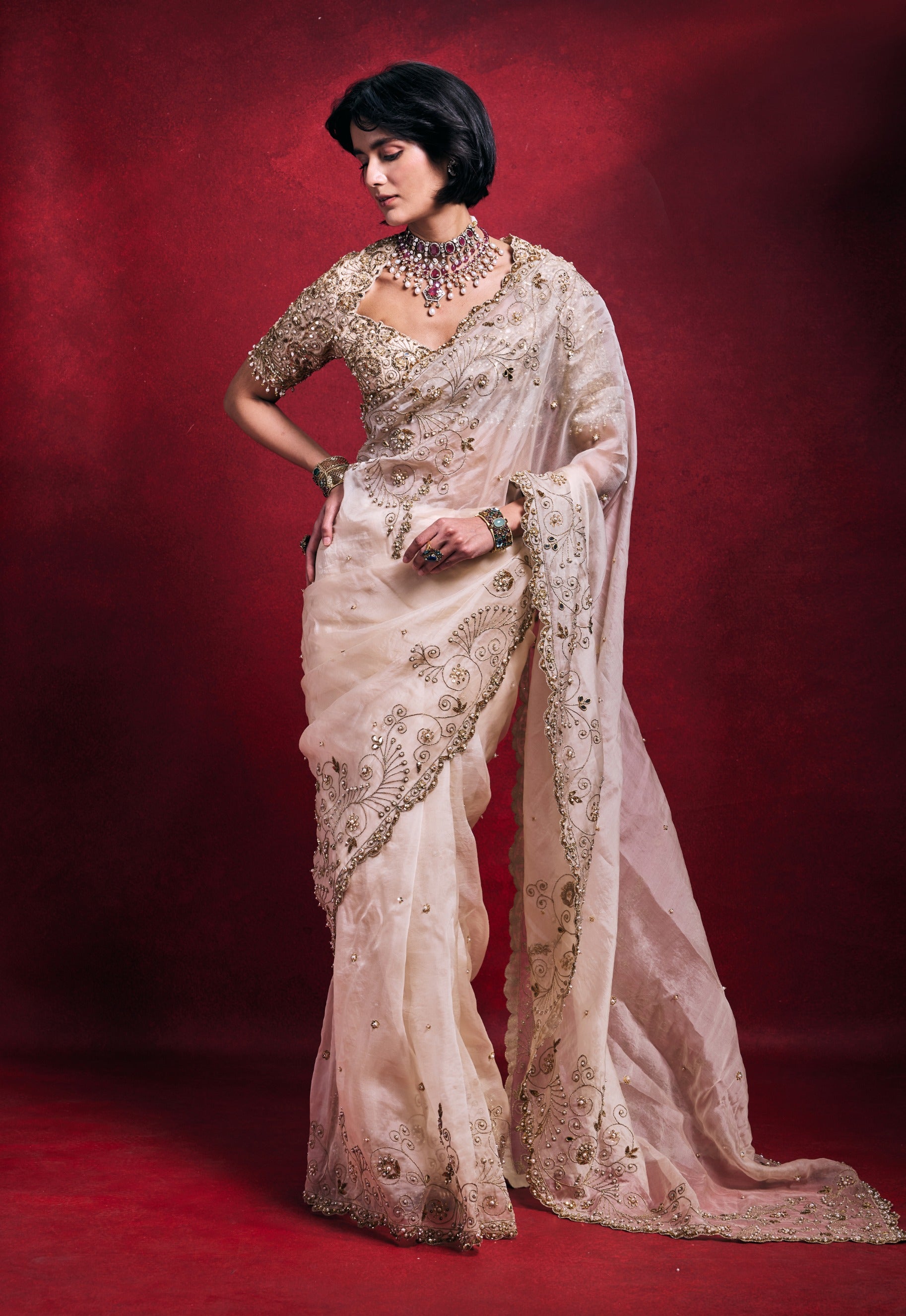 Timeless and luminous, this cream sari in tissue and organza features a soft sheen and graceful drape. Intricate stone, resham, mirror, pearl, sequin, dori, sadi, poth and zari embroidery adds elegance, making it perfect for weddings and festive occasions.