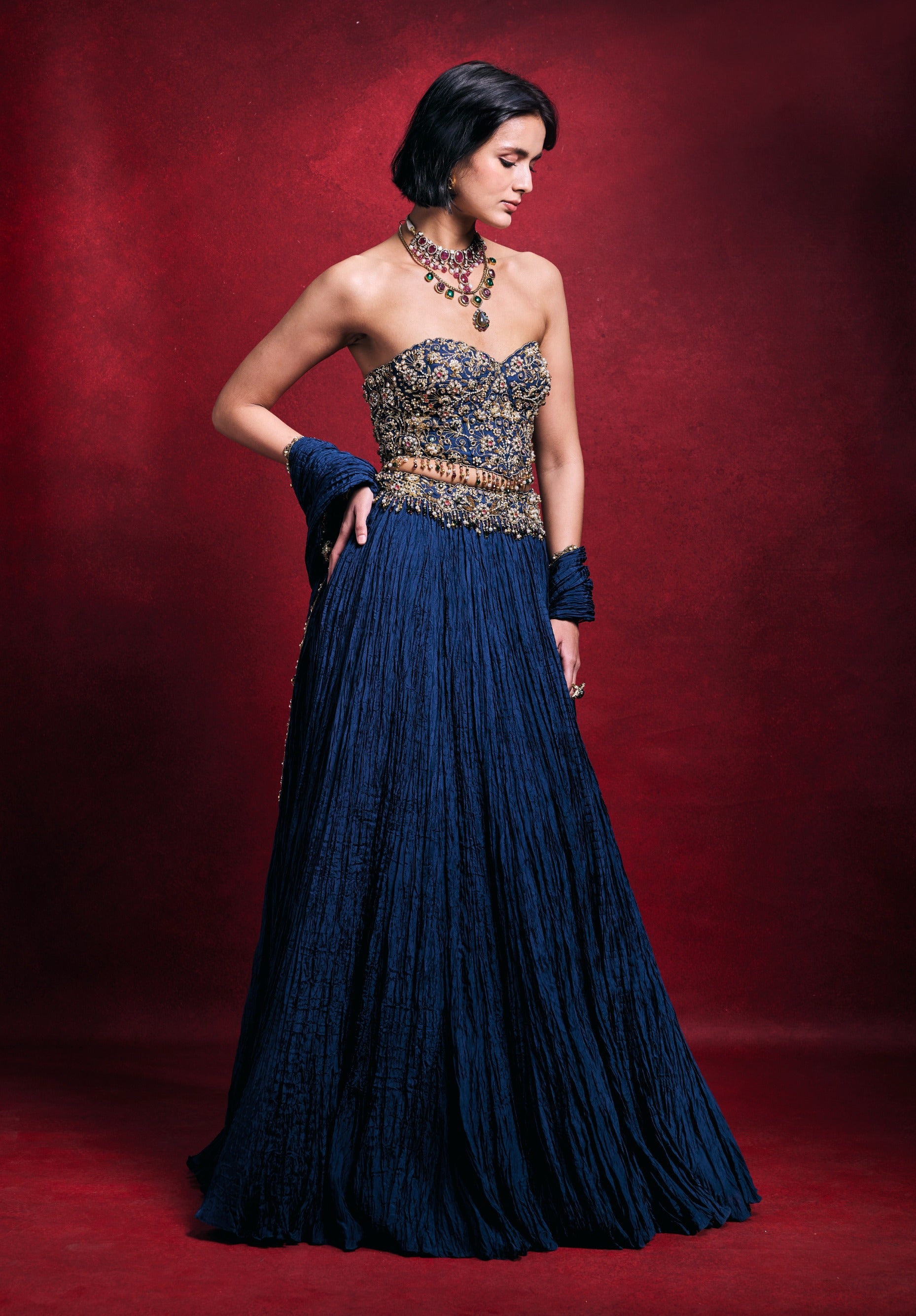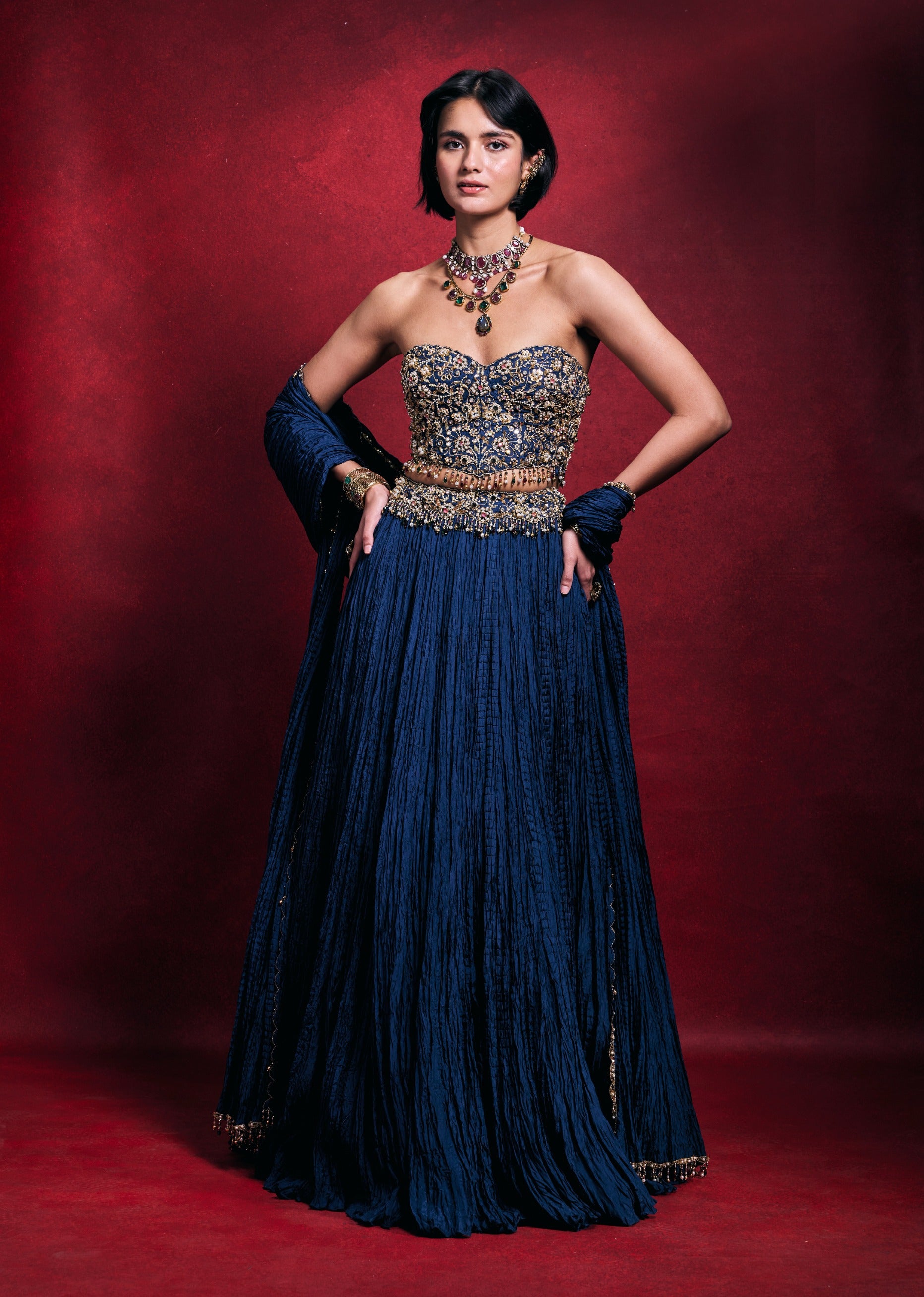 Rich and regal in royal blue, this habutai silk ensemble features a textured skirt and a statement embroidered bodice. Intricate stone, mirror, pearl, sequin, dori, sadi, nakshi, zari and patra work create a striking look for evening celebrations.