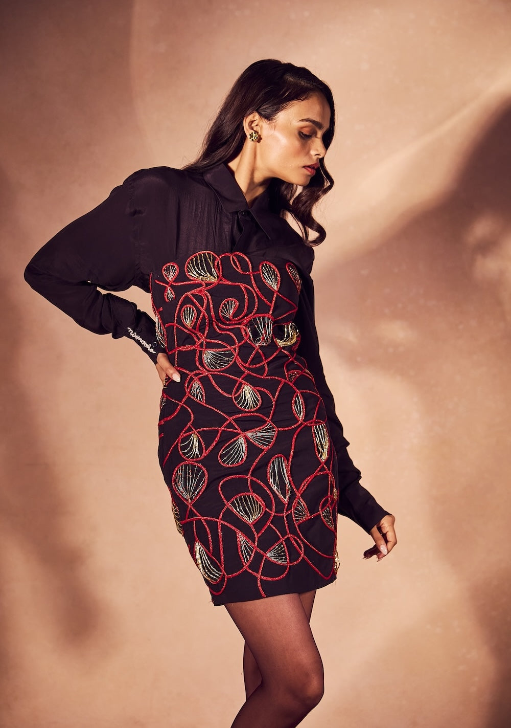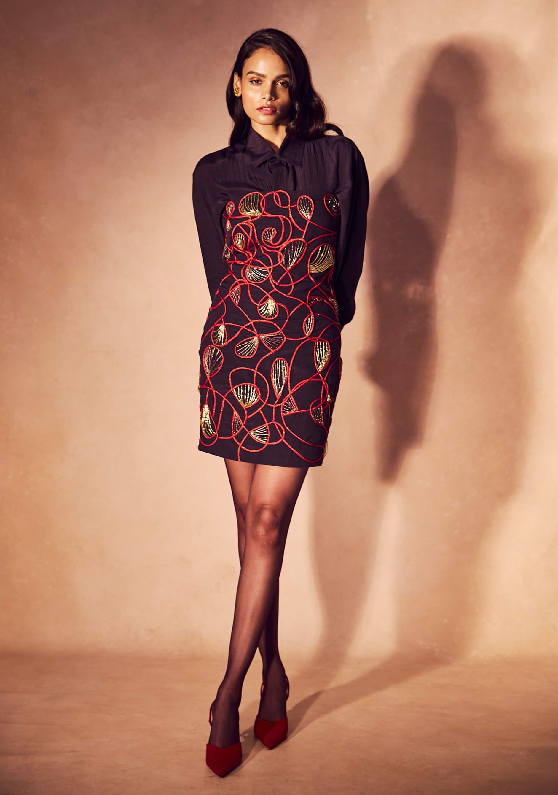Built for evening impact, this deep plum layered set combines a sheer shirt base with a sculpted corset dress, highlighted by abstract flame cording and molten gold embroidery.
