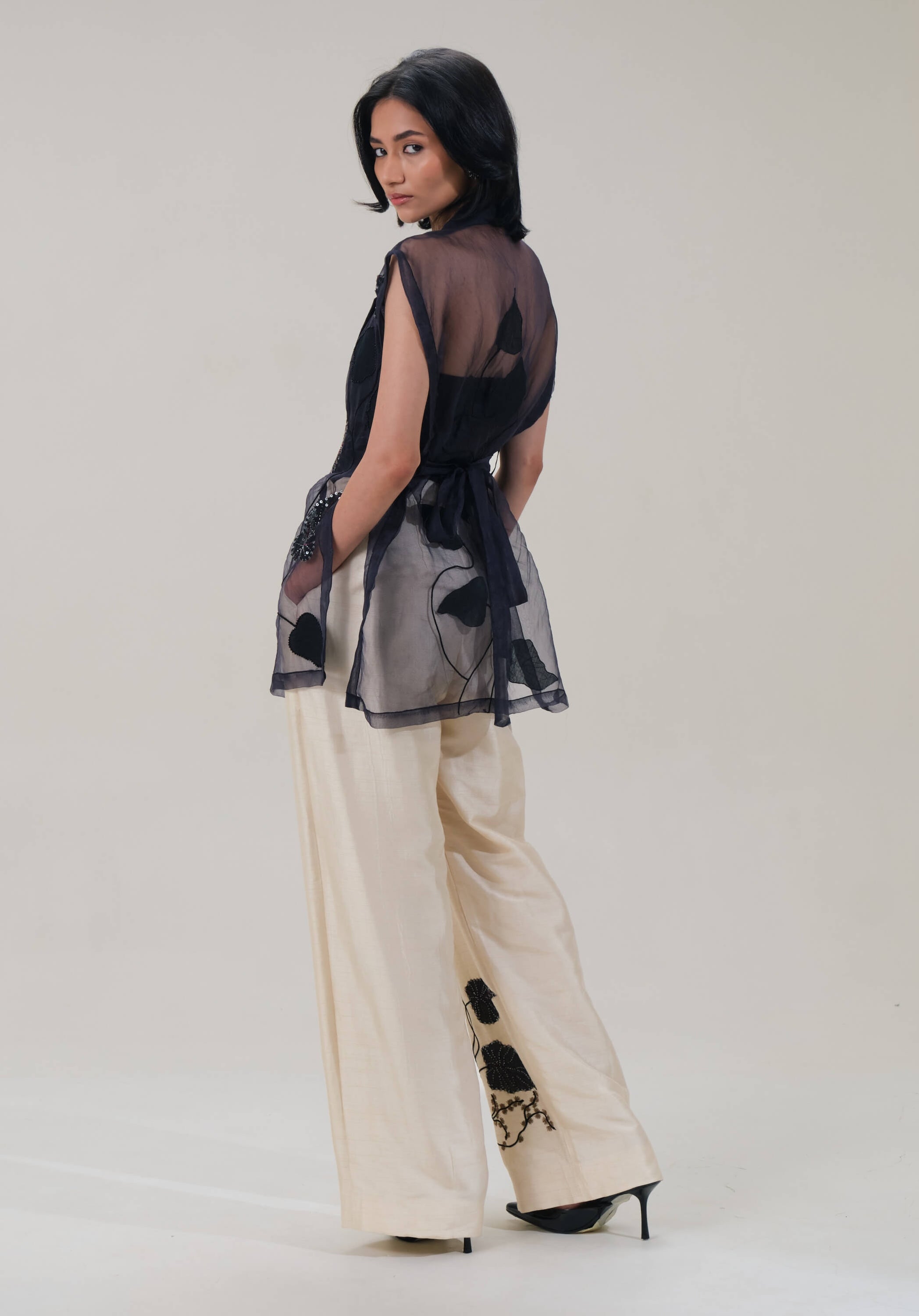 This co-ord set combines flat silk and sheer organza to create a luminous, layered look. Botanical embroidery and sequin appliqué add depth and texture, balancing modern elegance with artisanal craftsmanship.