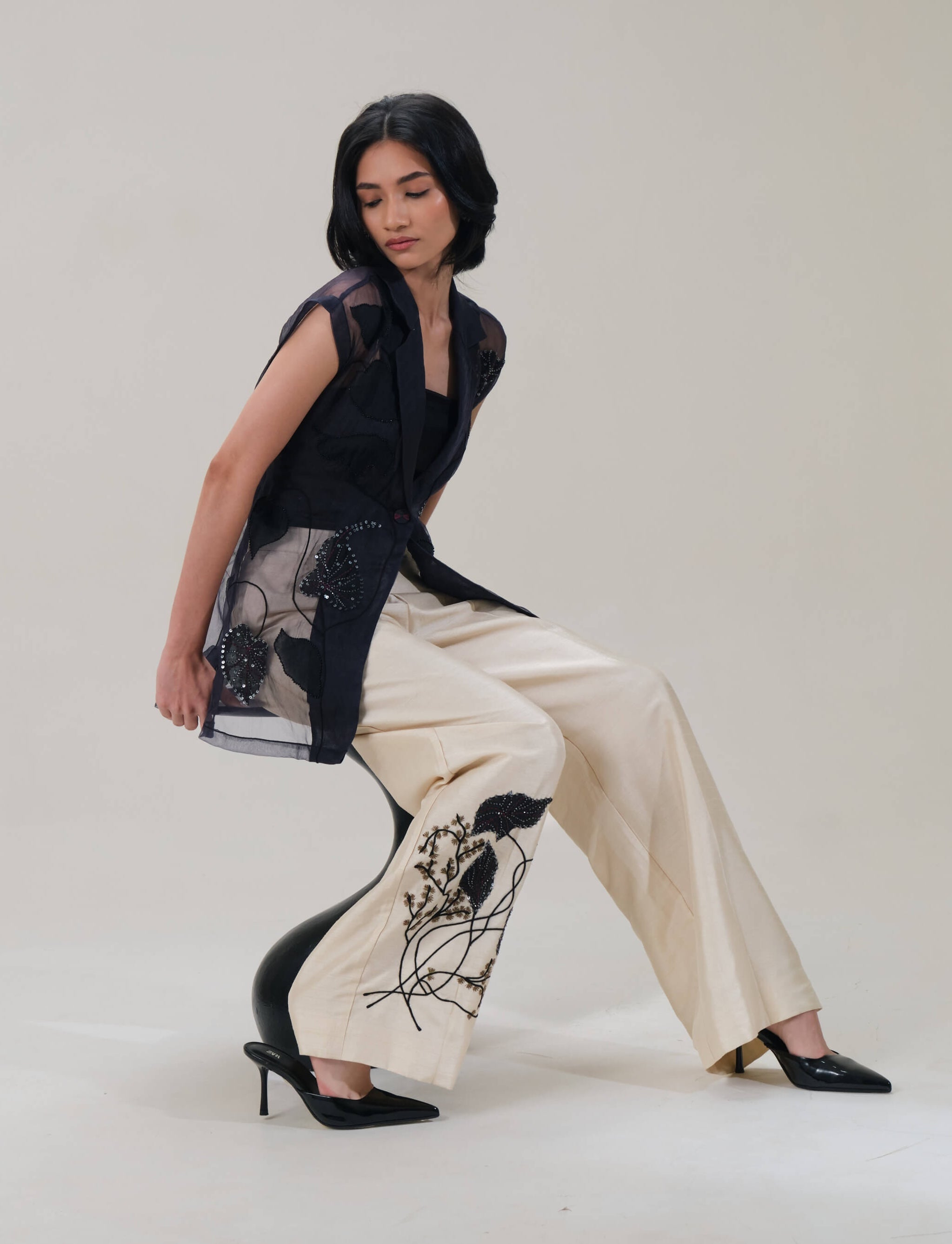 Lumière black shirt and beige pants