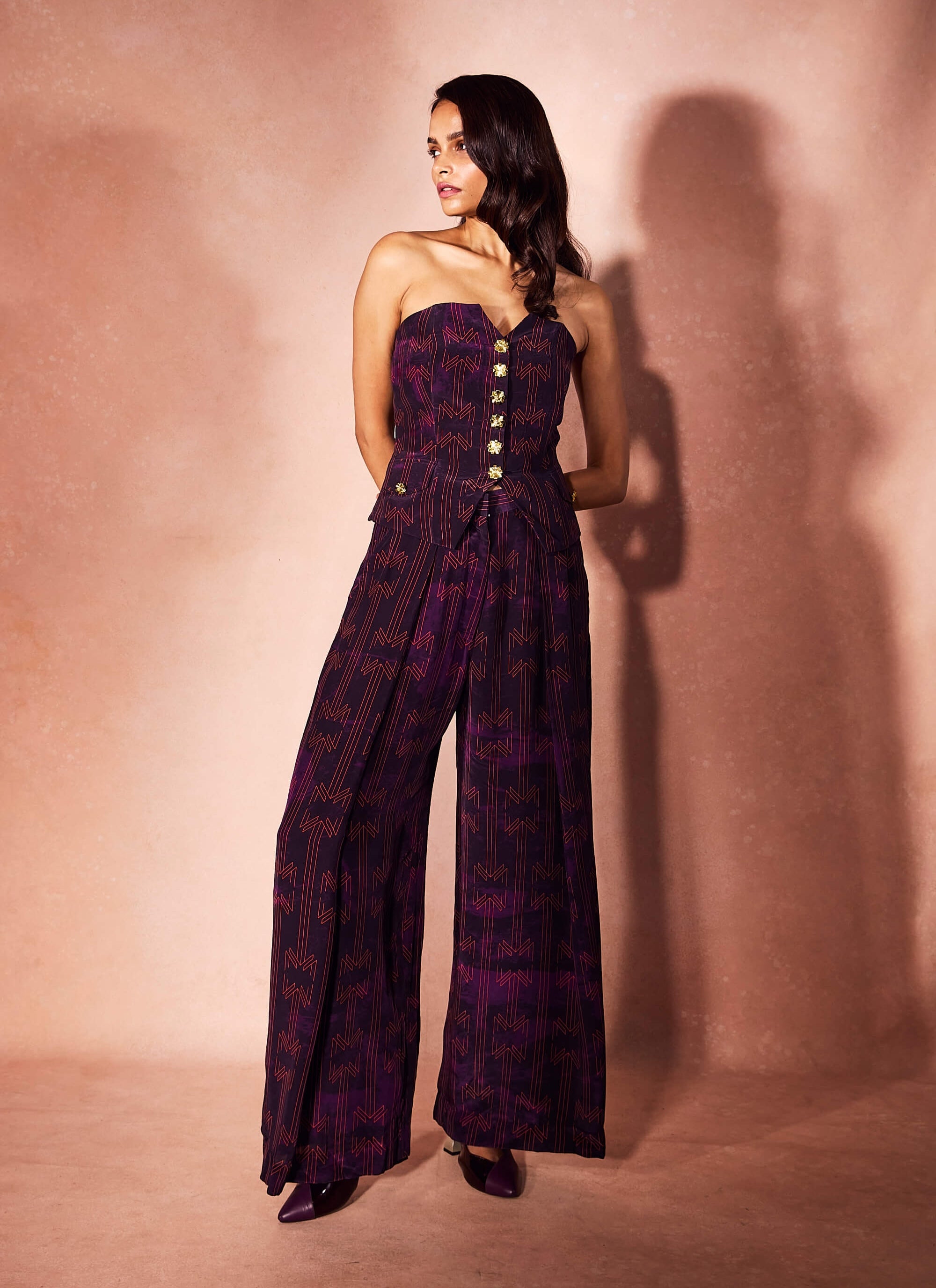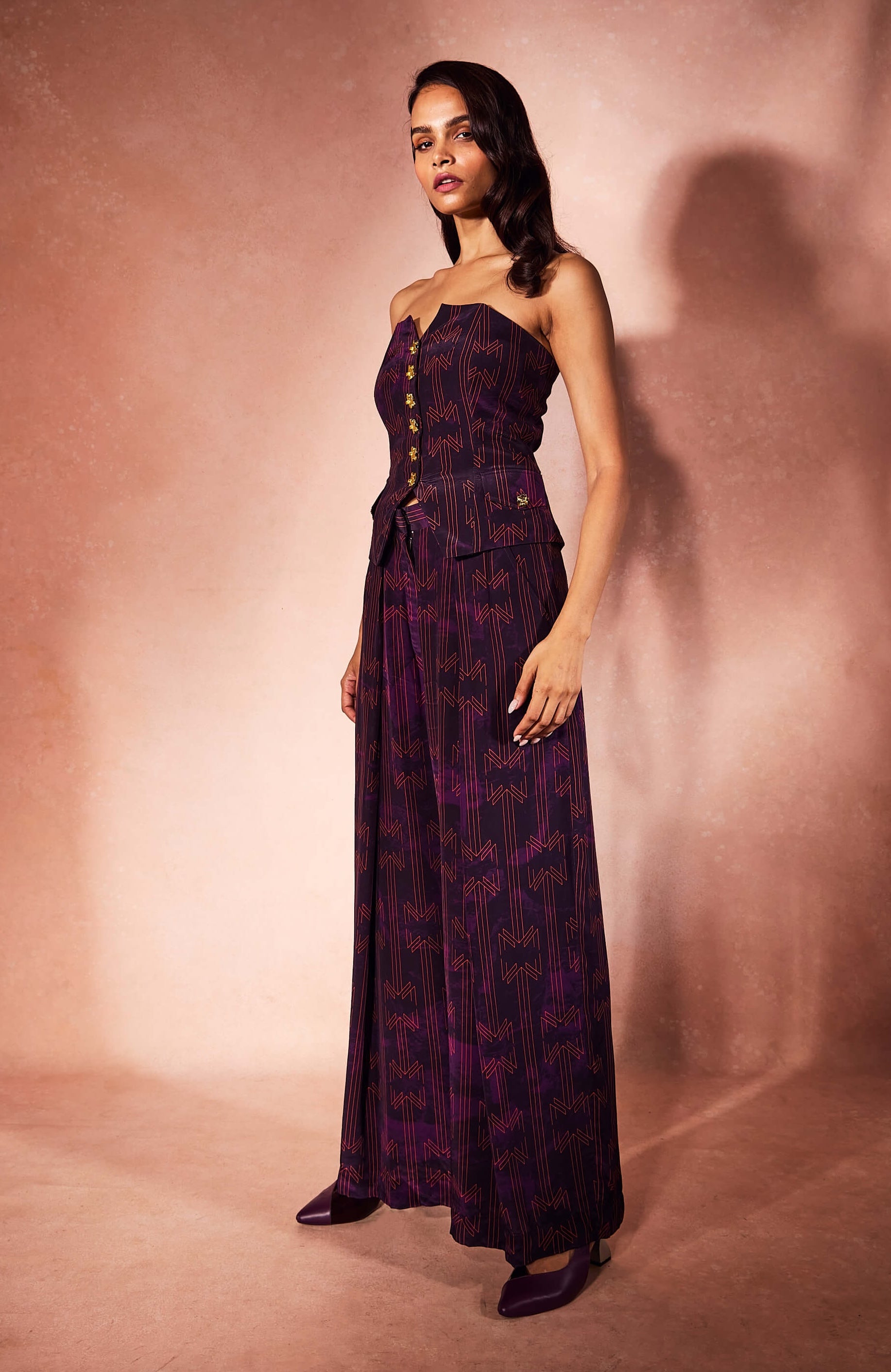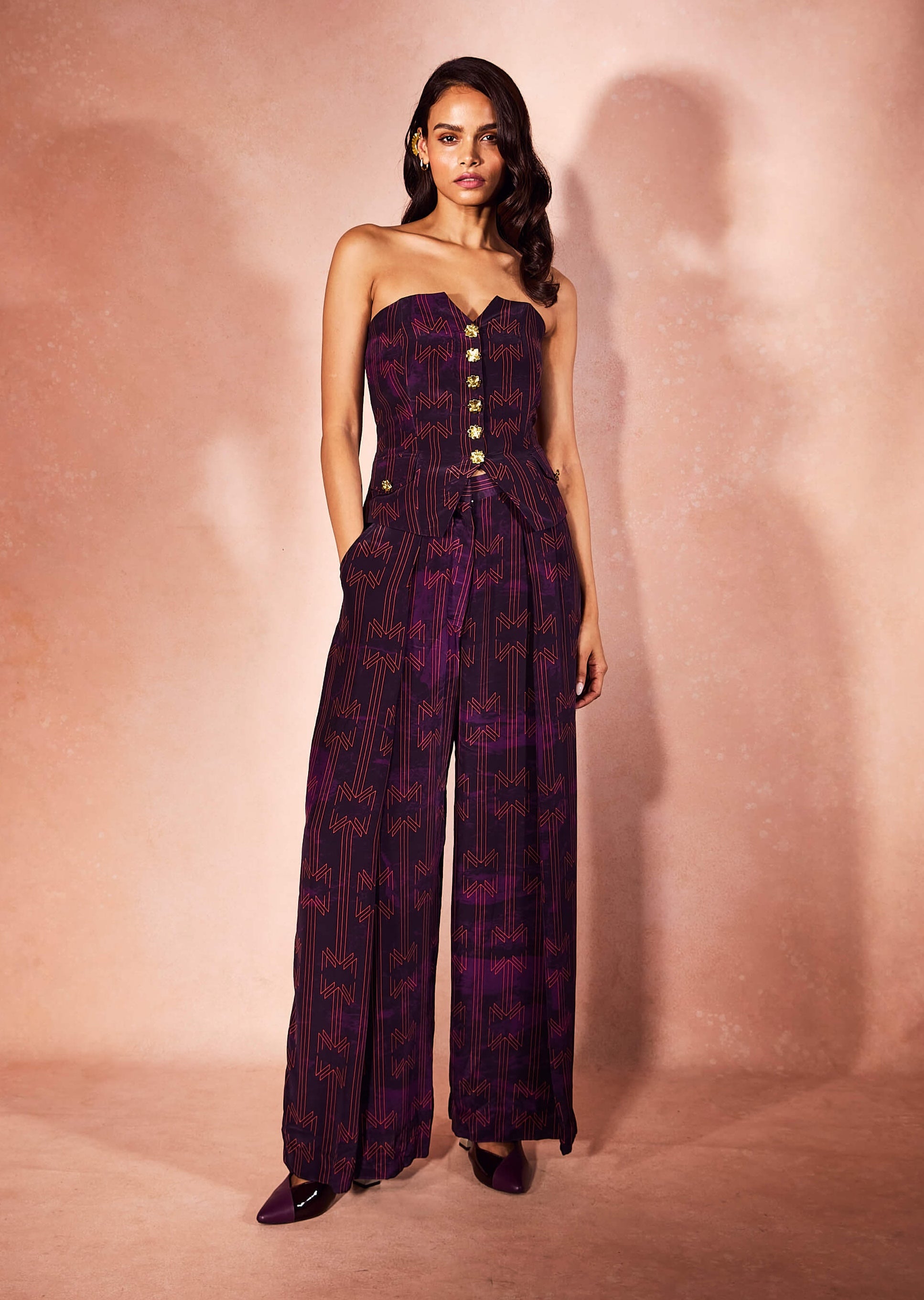 Signature monogram detailing defines this deep plum crepe set, featuring a structured corset-style vest and wide-leg pants that balance sharp tailoring with fluid ease.