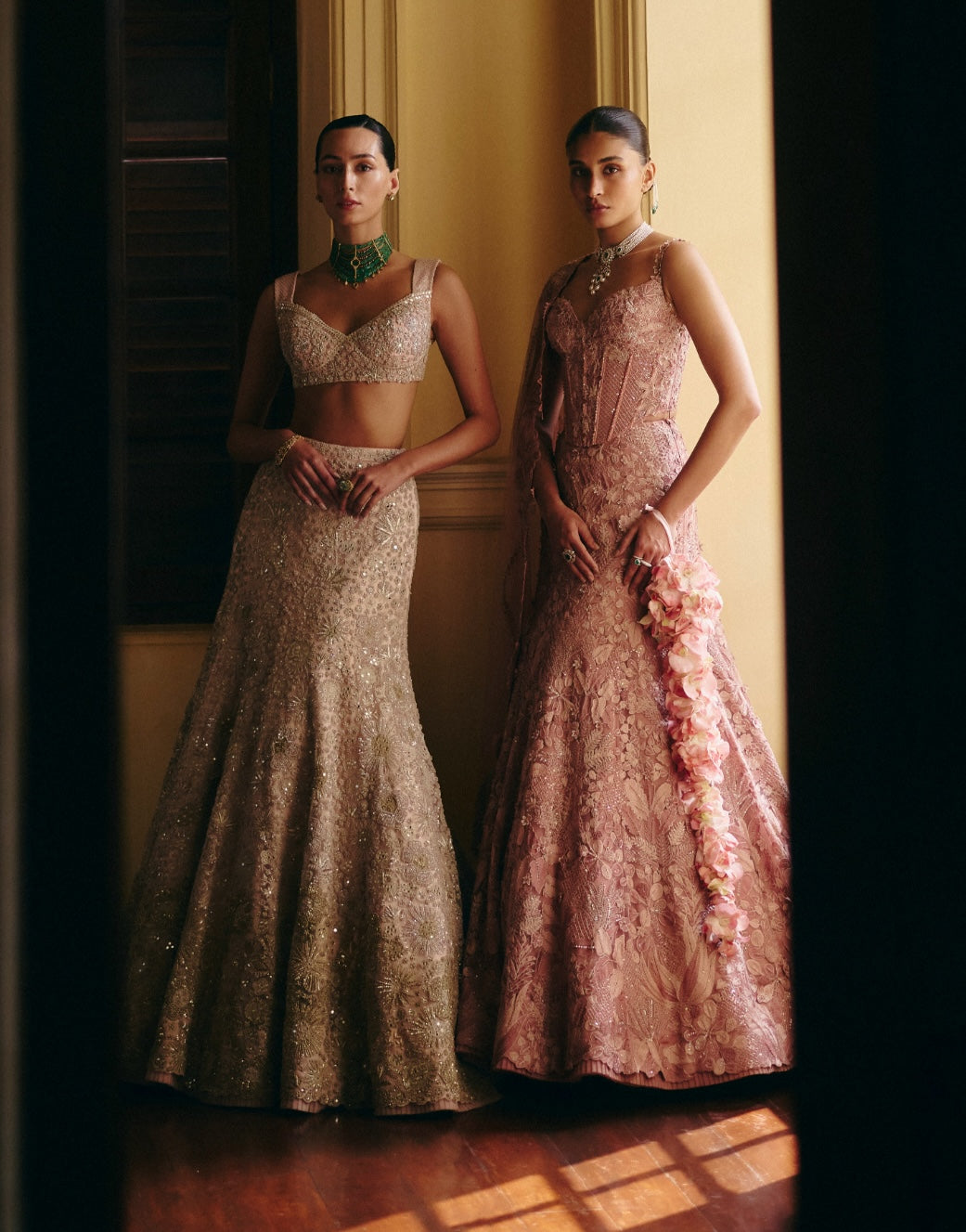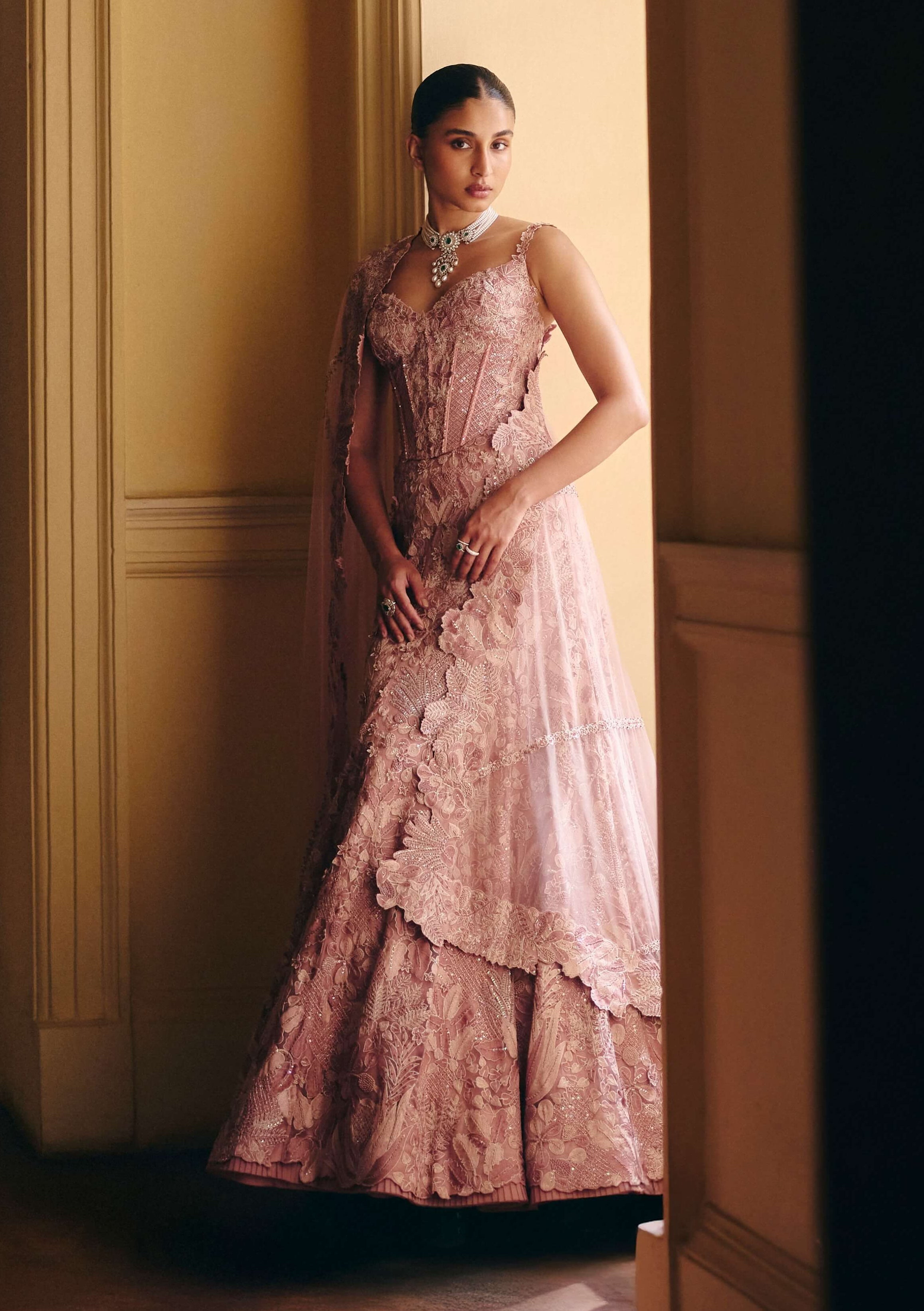 Refined romance meets modern structure in this muted pink lehenga set crafted in airy tulle. The dual-tone slim skirt is enriched with leaf embroidery and paired with an appliqué and checks embroidered corset and dupatta. An exquisite choice for engagement soirées, festive celebrations, or wedding functions.