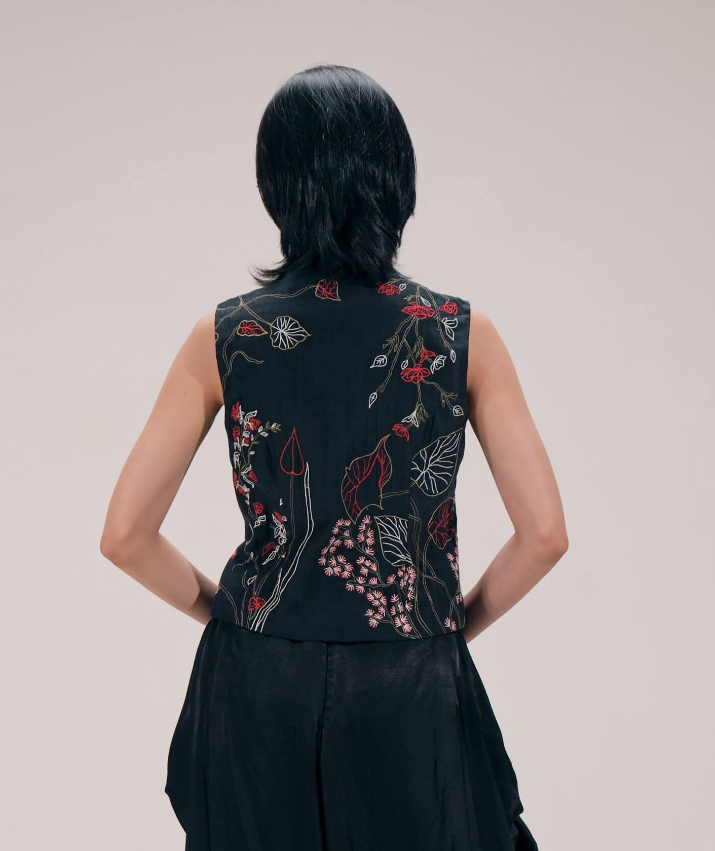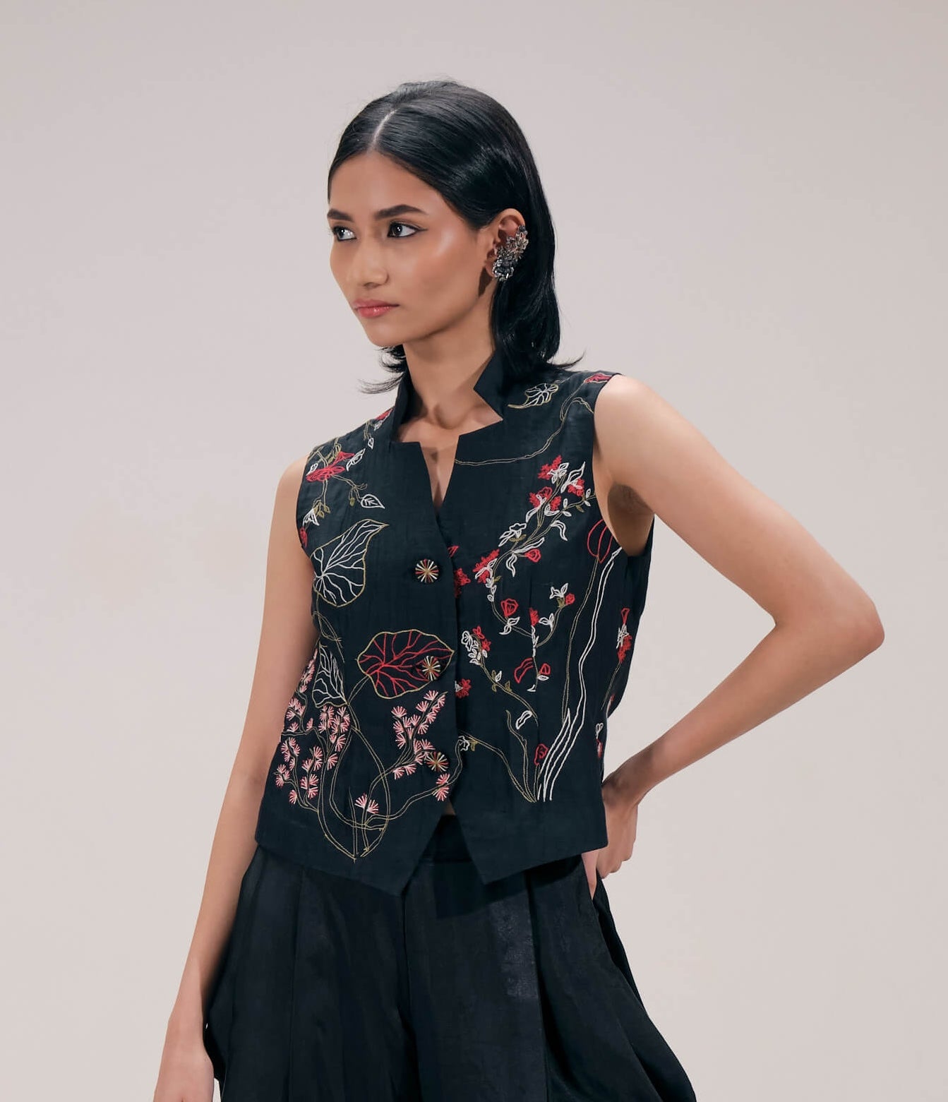 This Chanderi waistcoat is adorned with delicate floral and botanical embroidery, celebrating nature-inspired artistry. The structured sleeveless silhouette balances comfort and sophistication, making it ideal for festive layering.