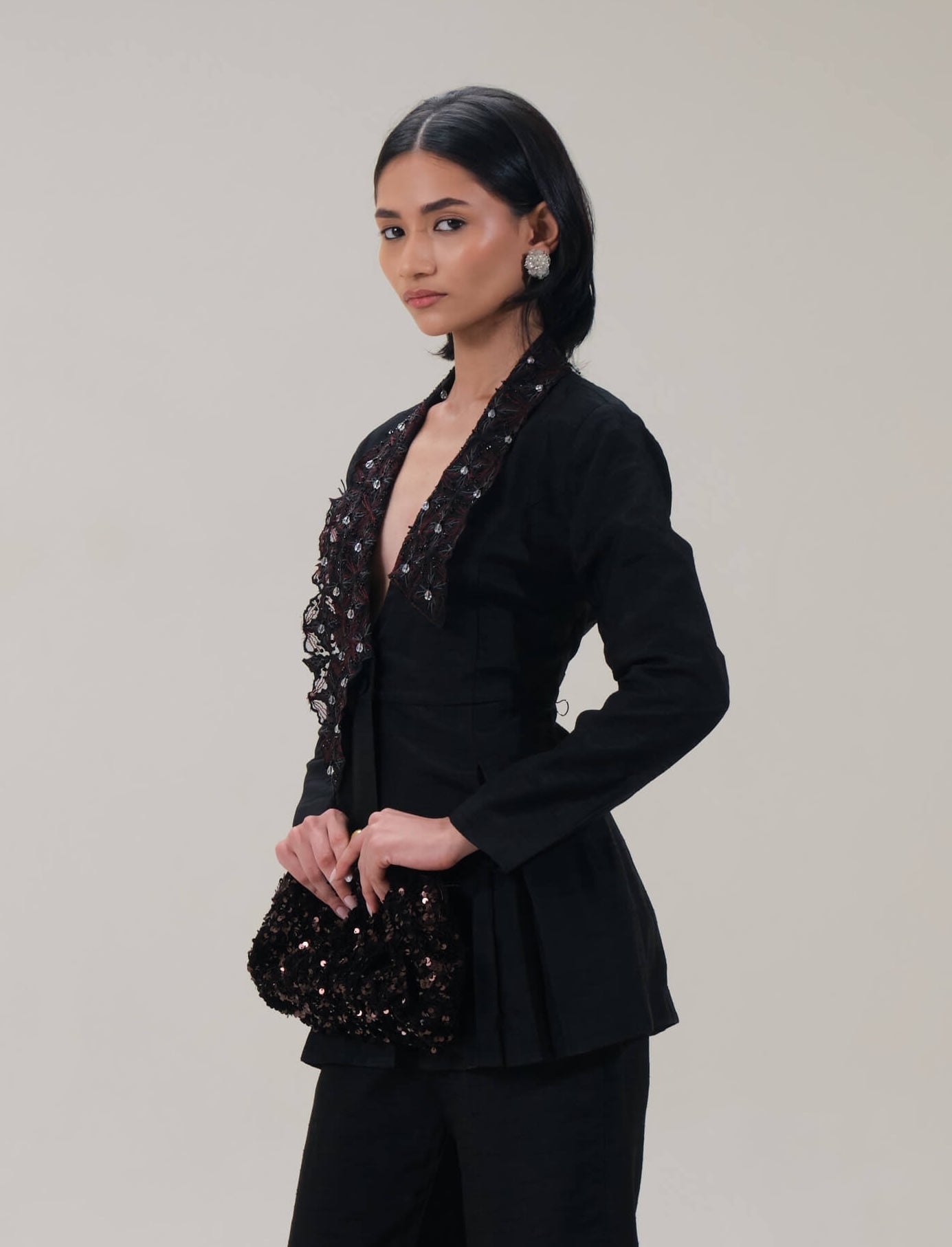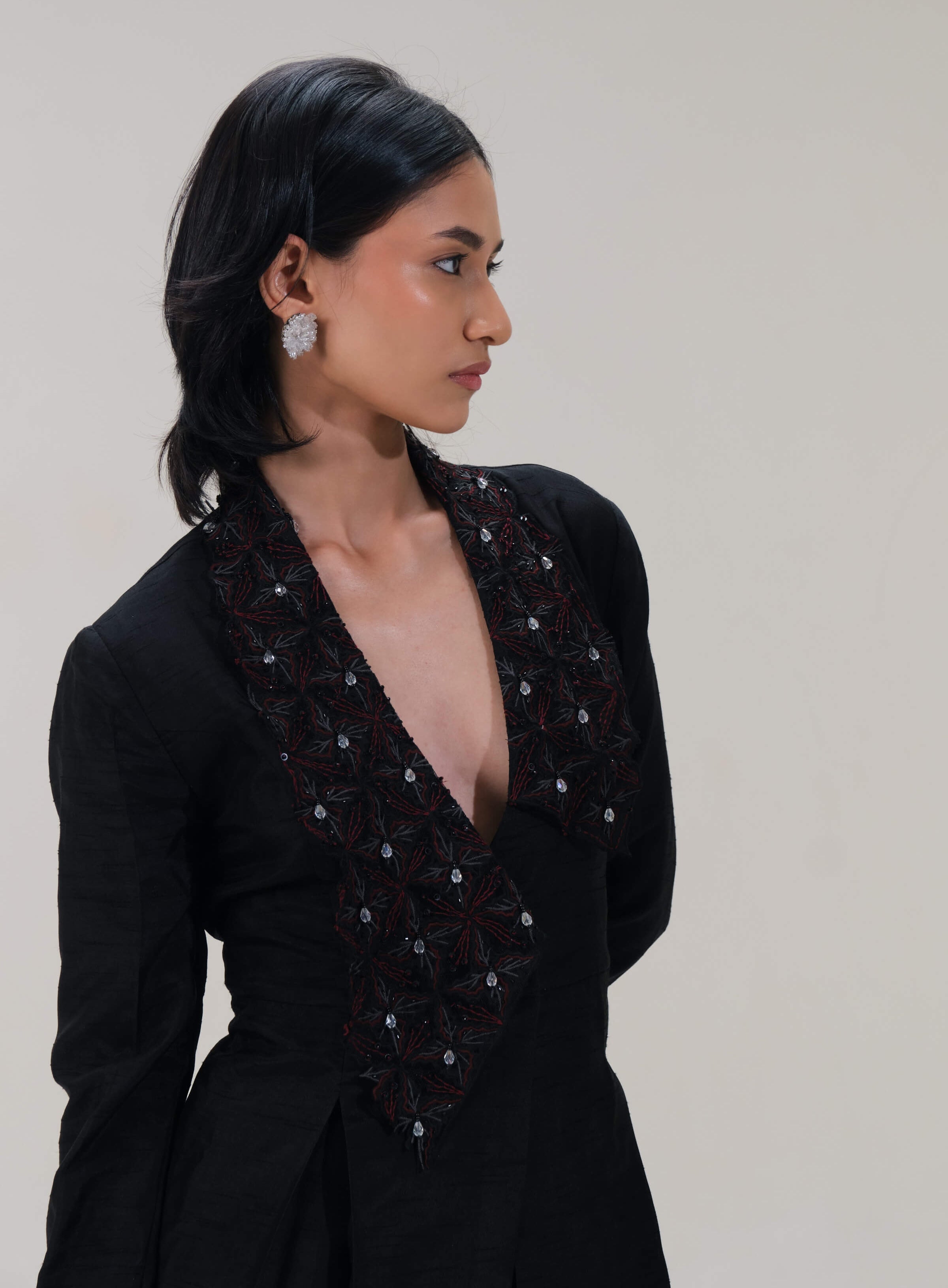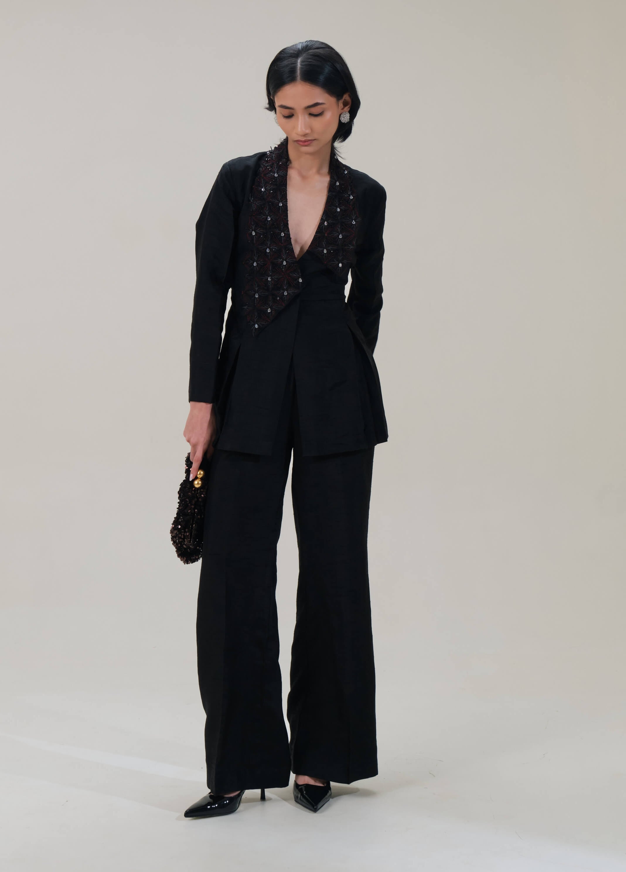 This flat silk co-ord set features a structured jacket with a deep V-front and intricate tonal embellishment paired with mid-rise boot-cut pants. Clean tailoring and fluid movement create a polished silhouette ideal for cocktail evenings and festive occasions.