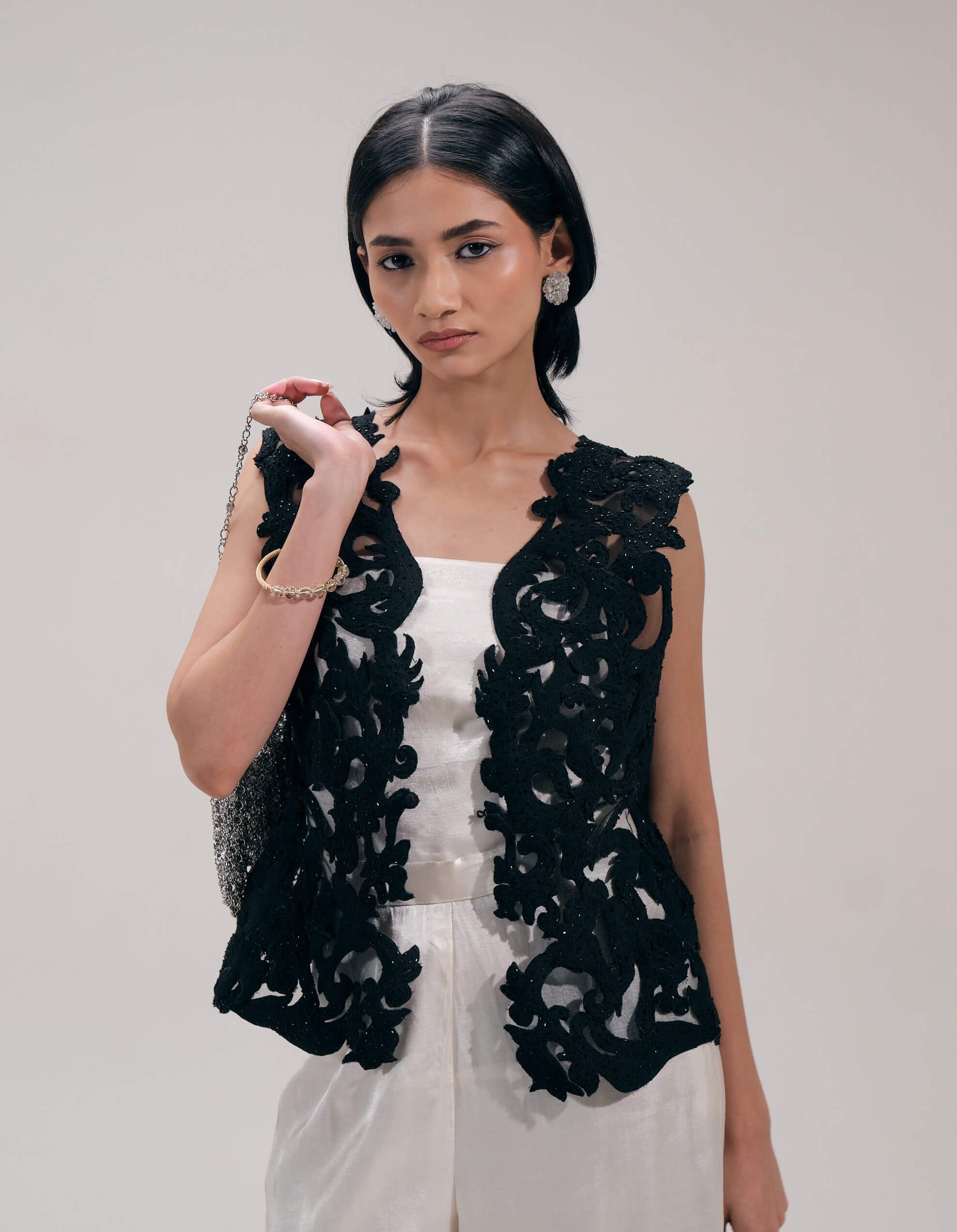 Crafted in fine net fabric, this open-front jacket features intricate cutwork detailing that plays with texture and transparency. Lightweight and dramatic, it adds modern edge and depth to contemporary ensembles.