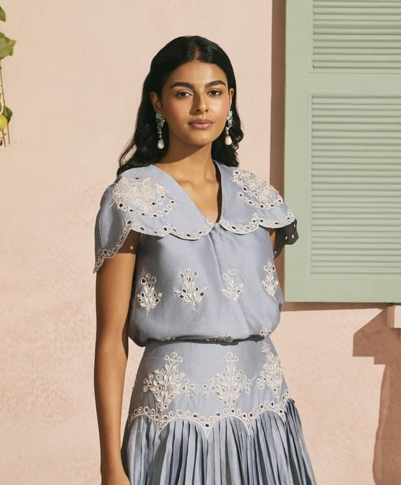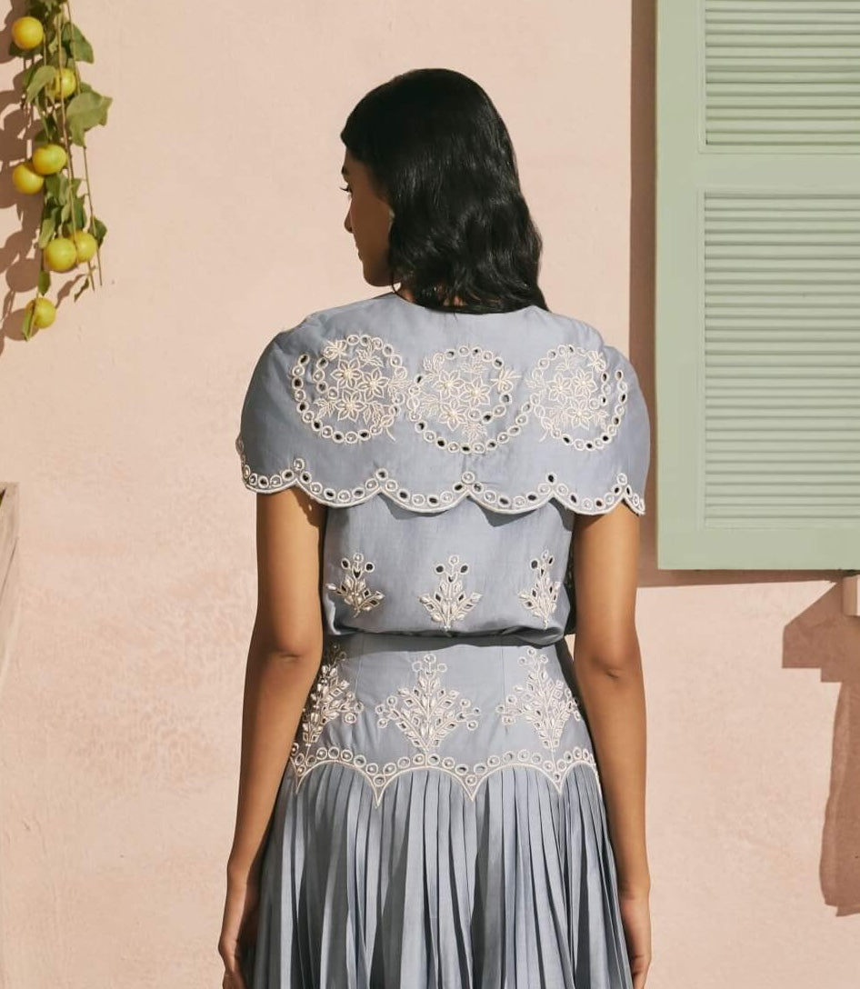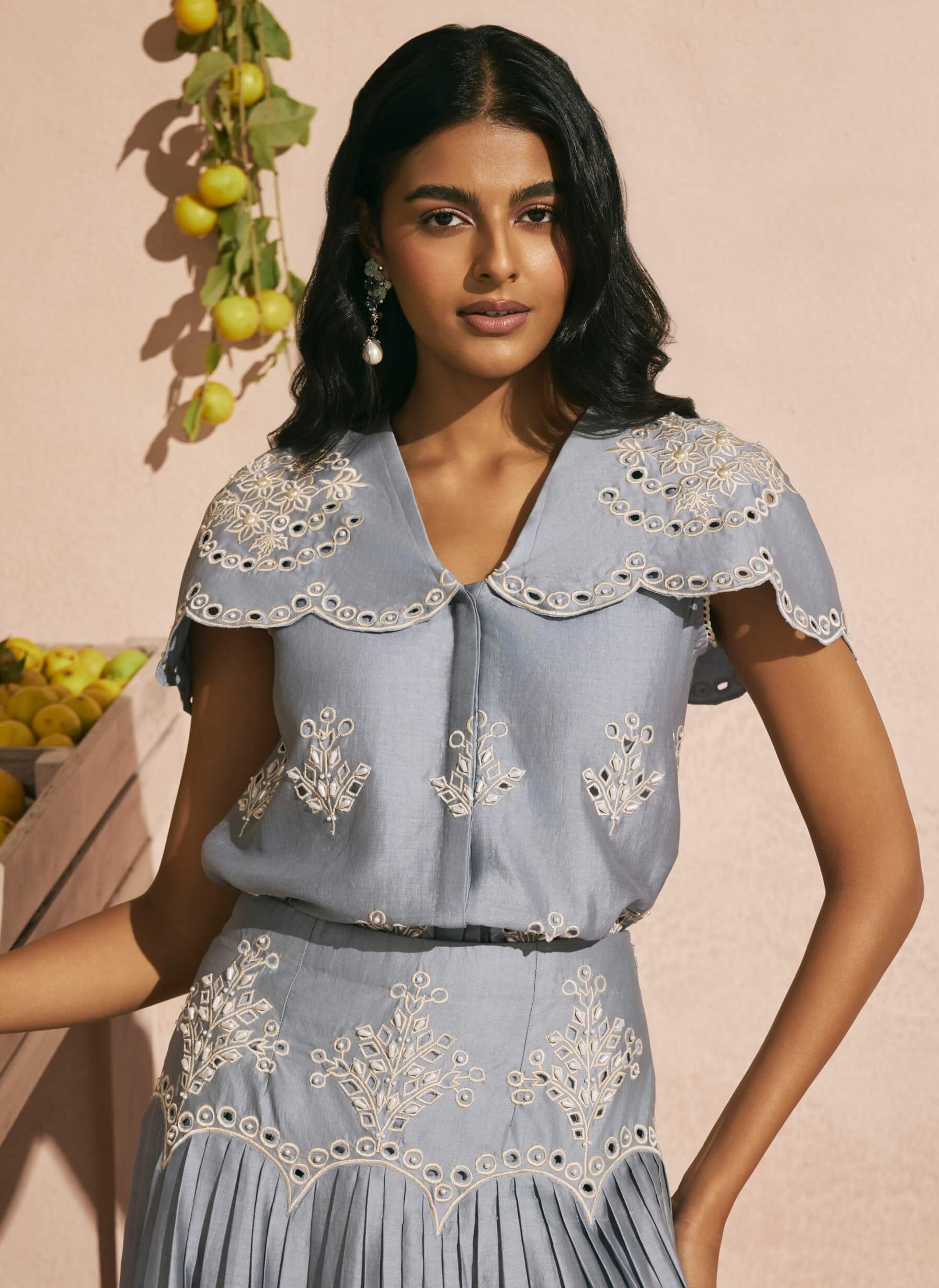 Fresh and contemporary, this powder blue shirt features contrast cutwork with beadwork accents and a refined collar detail. The structured silhouette blends modern style with elegance. Perfect for festive brunches, daytime celebrations, and stylish events.