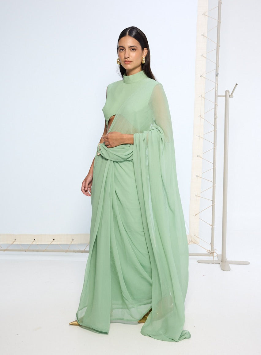A refreshing twist on contemporary draping. This pale green pure chiffon sari comes with a gold hardware brooch at the waist, doubling as a functional accessory and a chic statement. Perfect for pre-wedding brunches, haldi ceremonies, or summer celebrations, its lightness ensures effortless grace.
