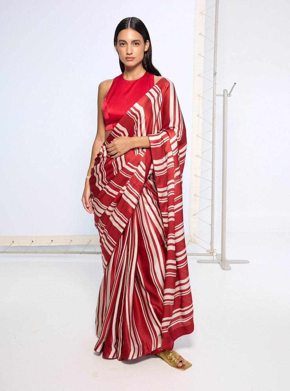 An ode to timeless stripes with a contemporary flair. This red pure satin silk sari features bold white stripes and a lustrous finish that exudes sophistication. Perfect for evening receptions or celebratory gatherings, it pairs beautifully with minimalist jewelry for a statement look.