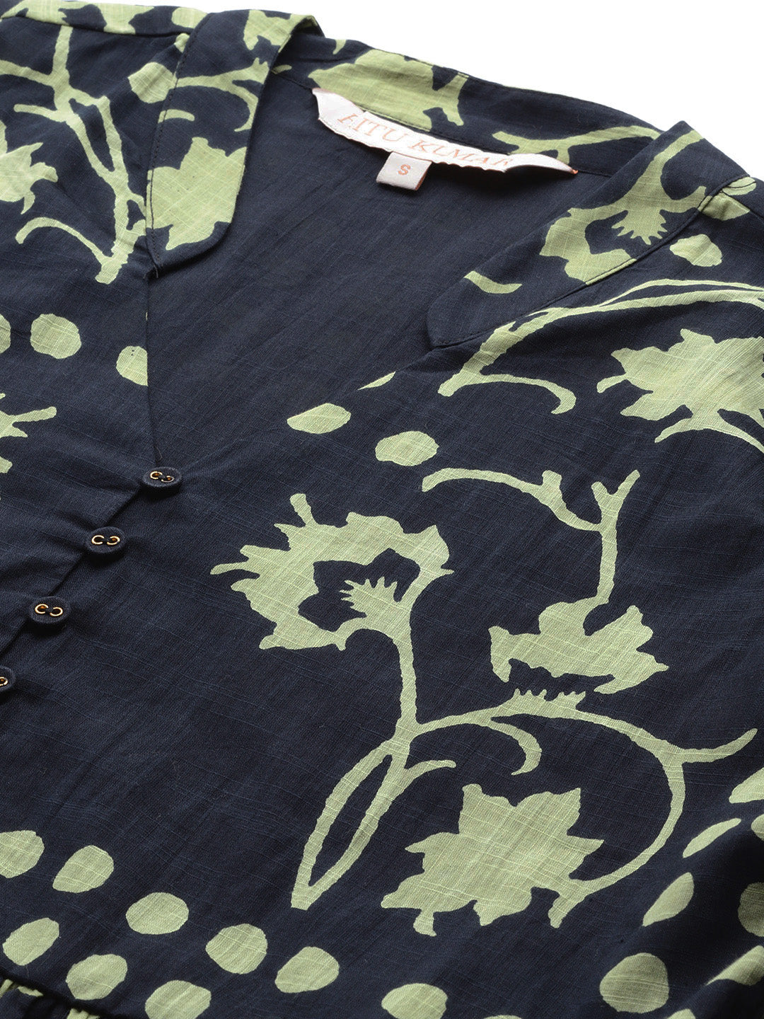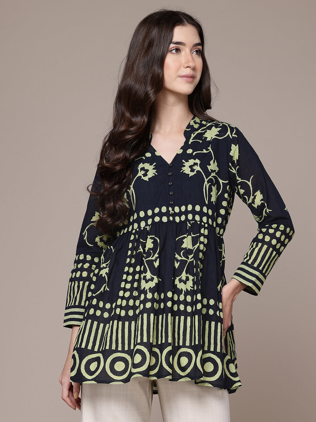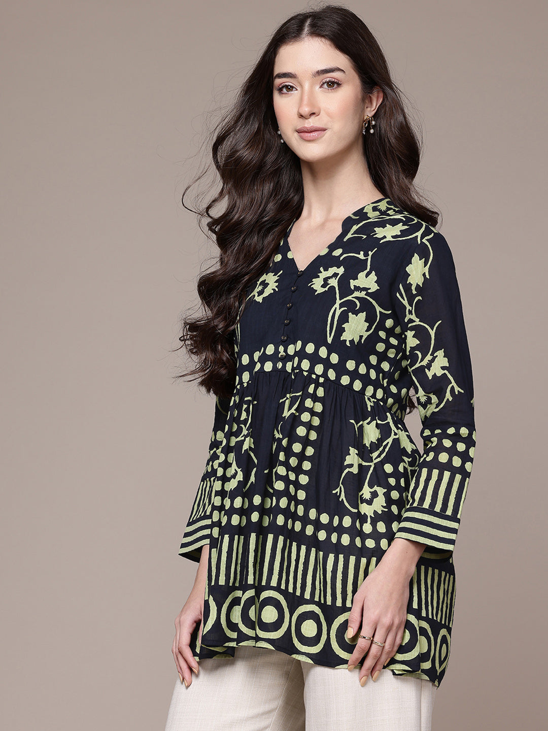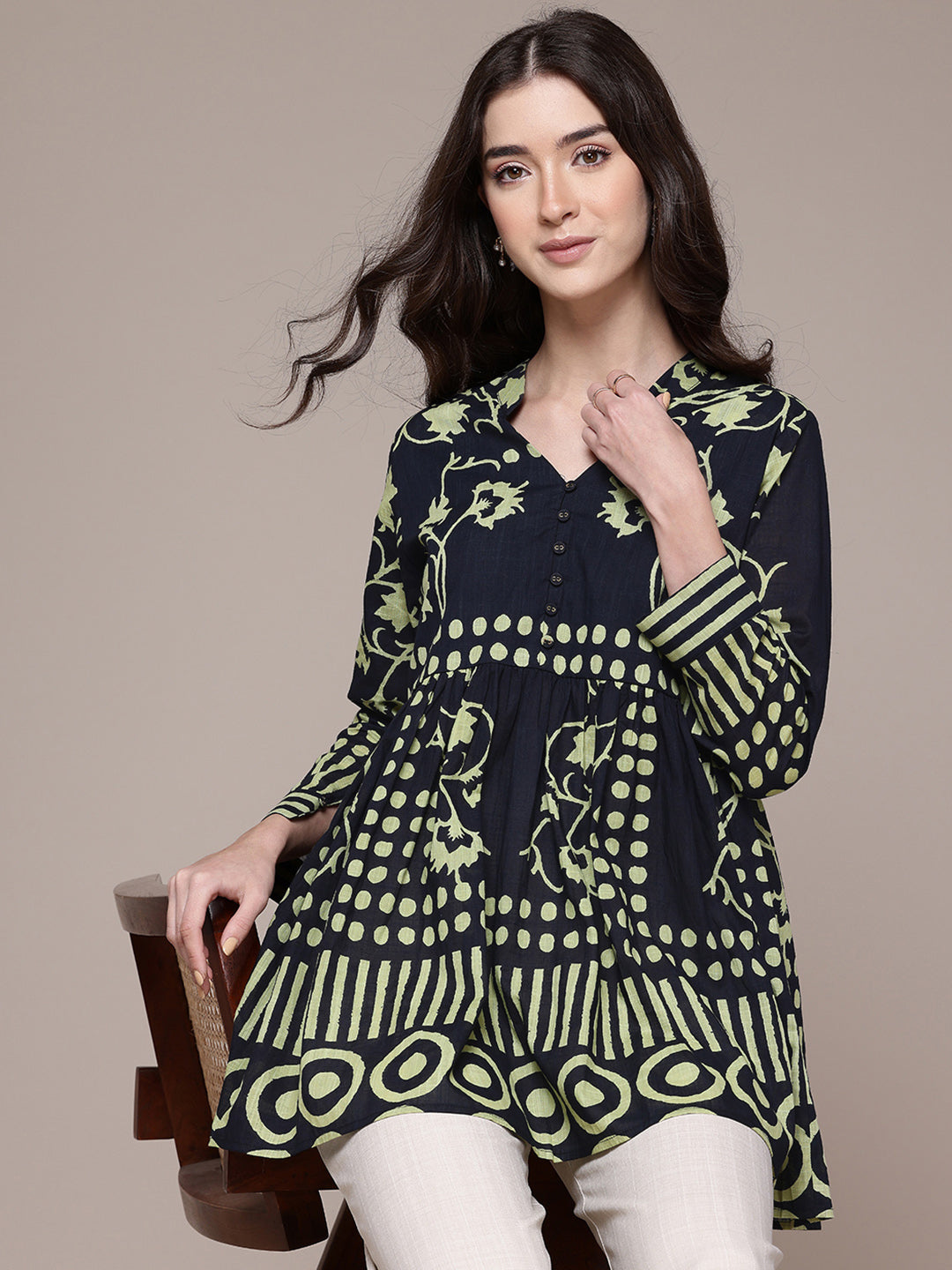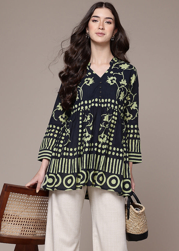 Graphic yet graceful, this black geometric shirt brings bold pattern play into focus. The 3/4th sleeves and band collar make it a modern essential, ideal for creative offices or after-hours gatherings. Style it with straight pants or a midi skirt for effortless sophistication.