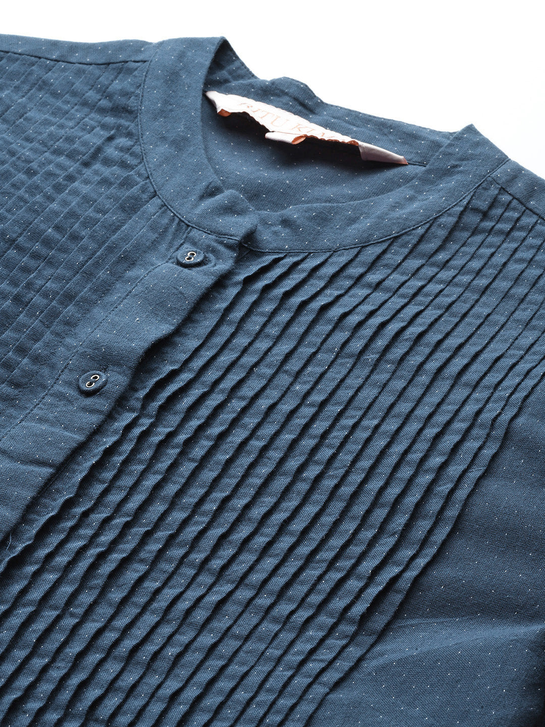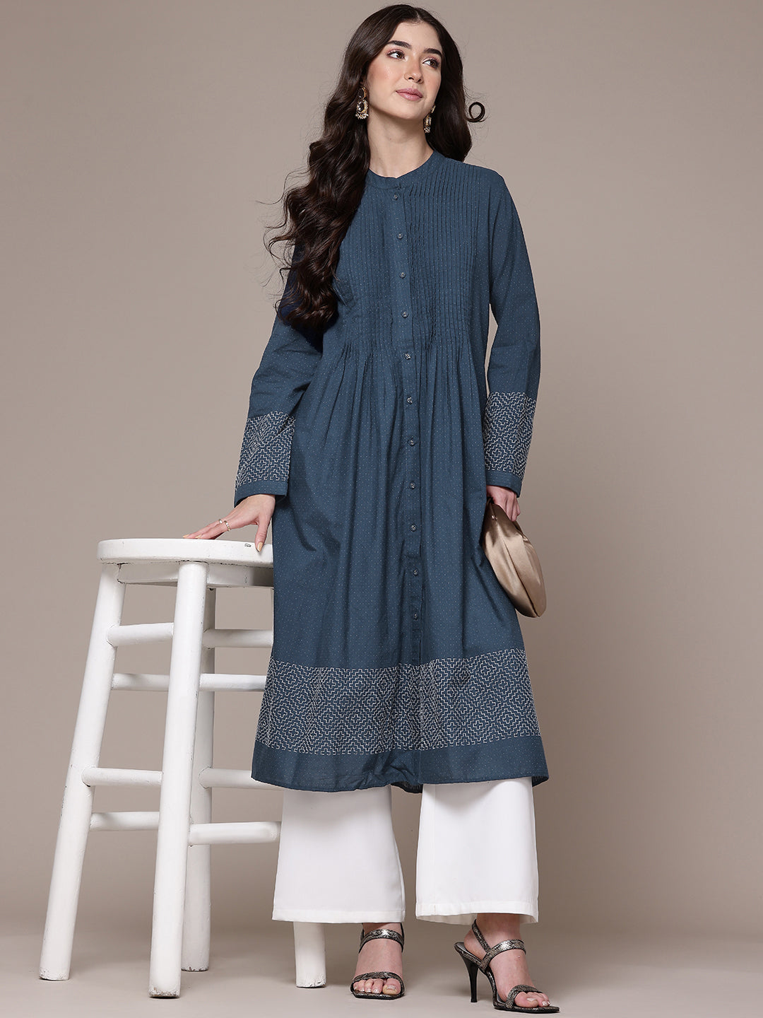 Tailored in a soft hue, this blue calf-length kurta captures quiet sophistication. The A-line silhouette and band collar offer a polished yet relaxed charm. Ideal for workwear or semi-formal occasions, pair it with nude sandals and subtle jewelry for a modern Indian aesthetic.