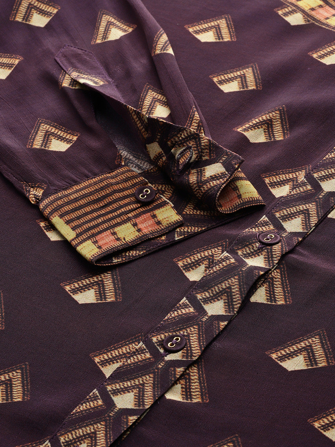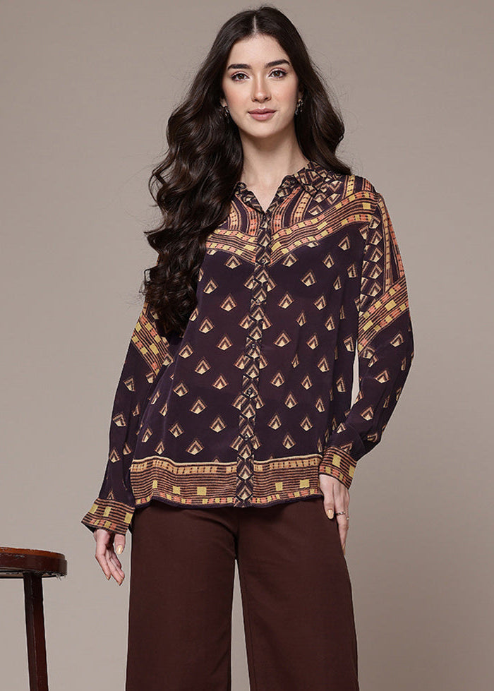 Crafted for the modern muse, this brown geometric shirt is designed for comfort and sophistication. The straight cut and shirt collar offer structure, making it perfect for workdays or city strolls.