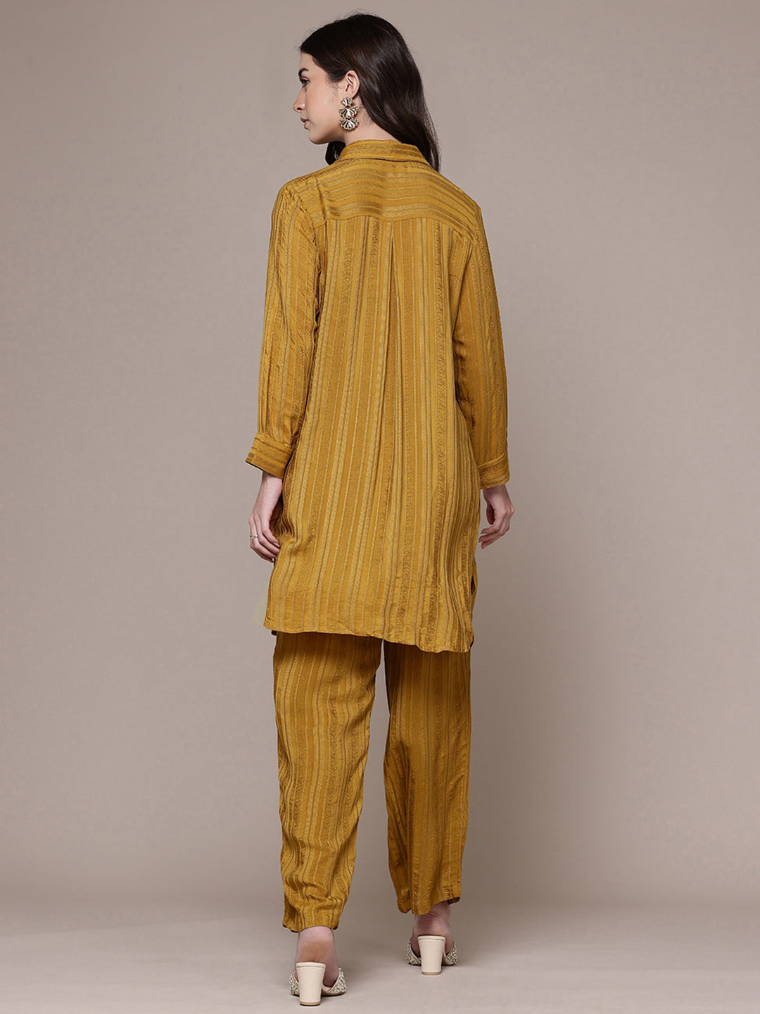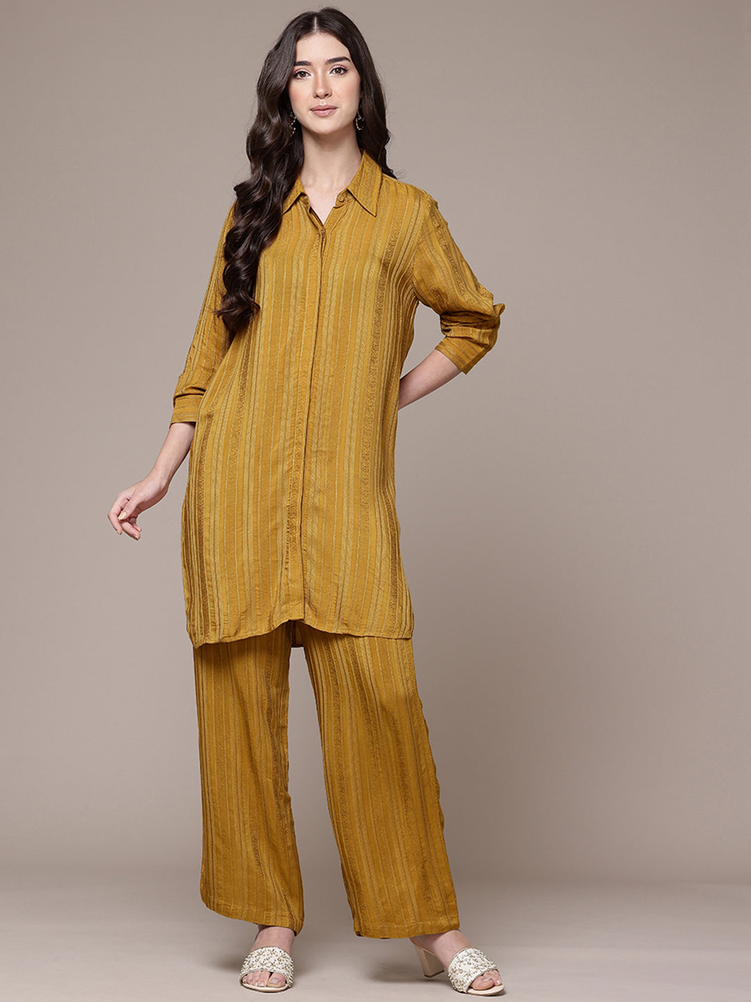 A burst of sunshine and style, this yellow shirt and palazzo set is made for those who love breezy sophistication. The structured shirt collar and relaxed silhouette bring modern flair to everyday dressing. Ideal for vacation days or casual brunches, it’s best styled with bold accessories.