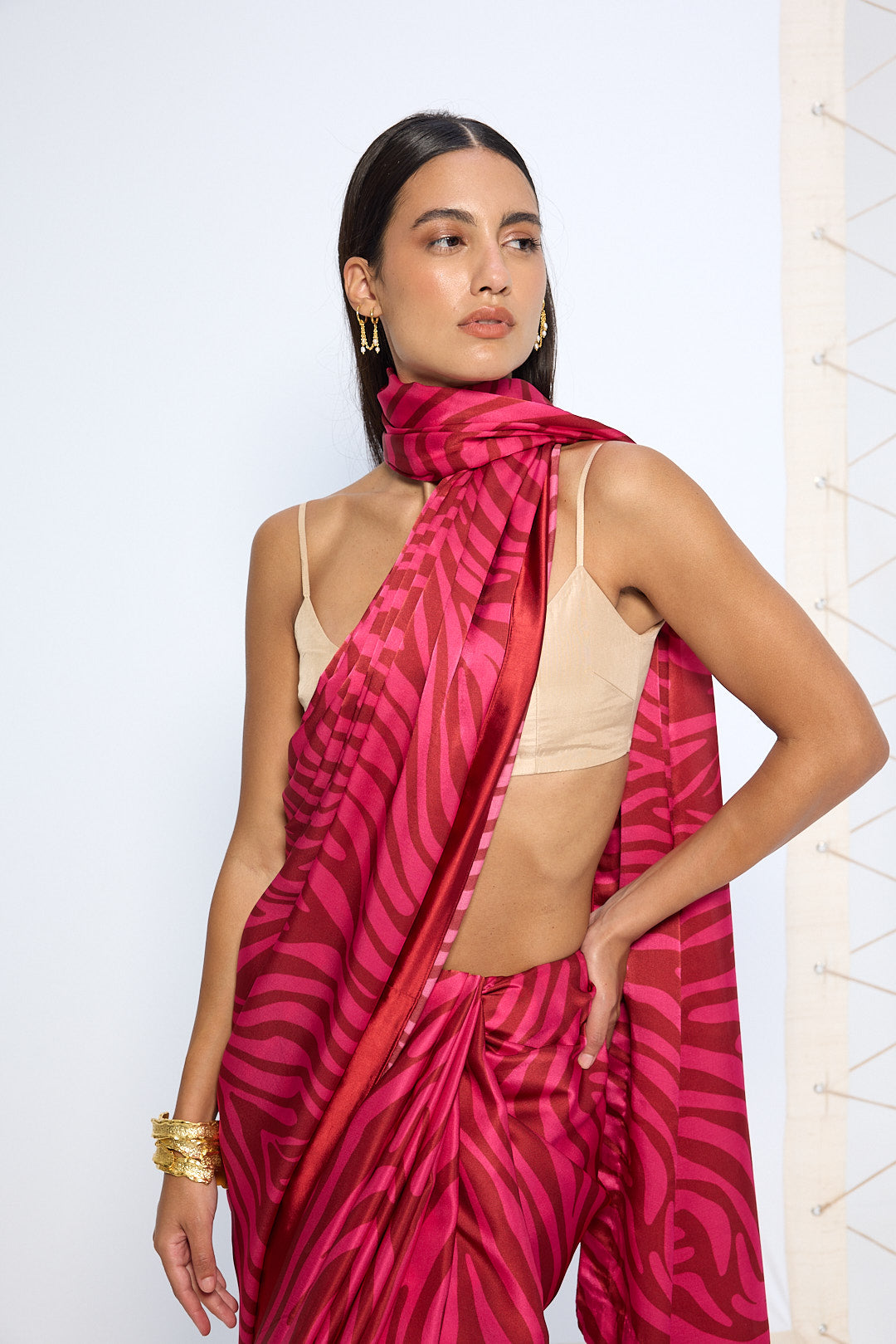Dare to redefine tradition. This handwoven pure silk Sari in a vibrant pink hue showcases bold zebra-inspired patterns for a striking visual appeal. Perfect for cocktail nights, destination weddings, or festive soirées, it demands attention with every drape.