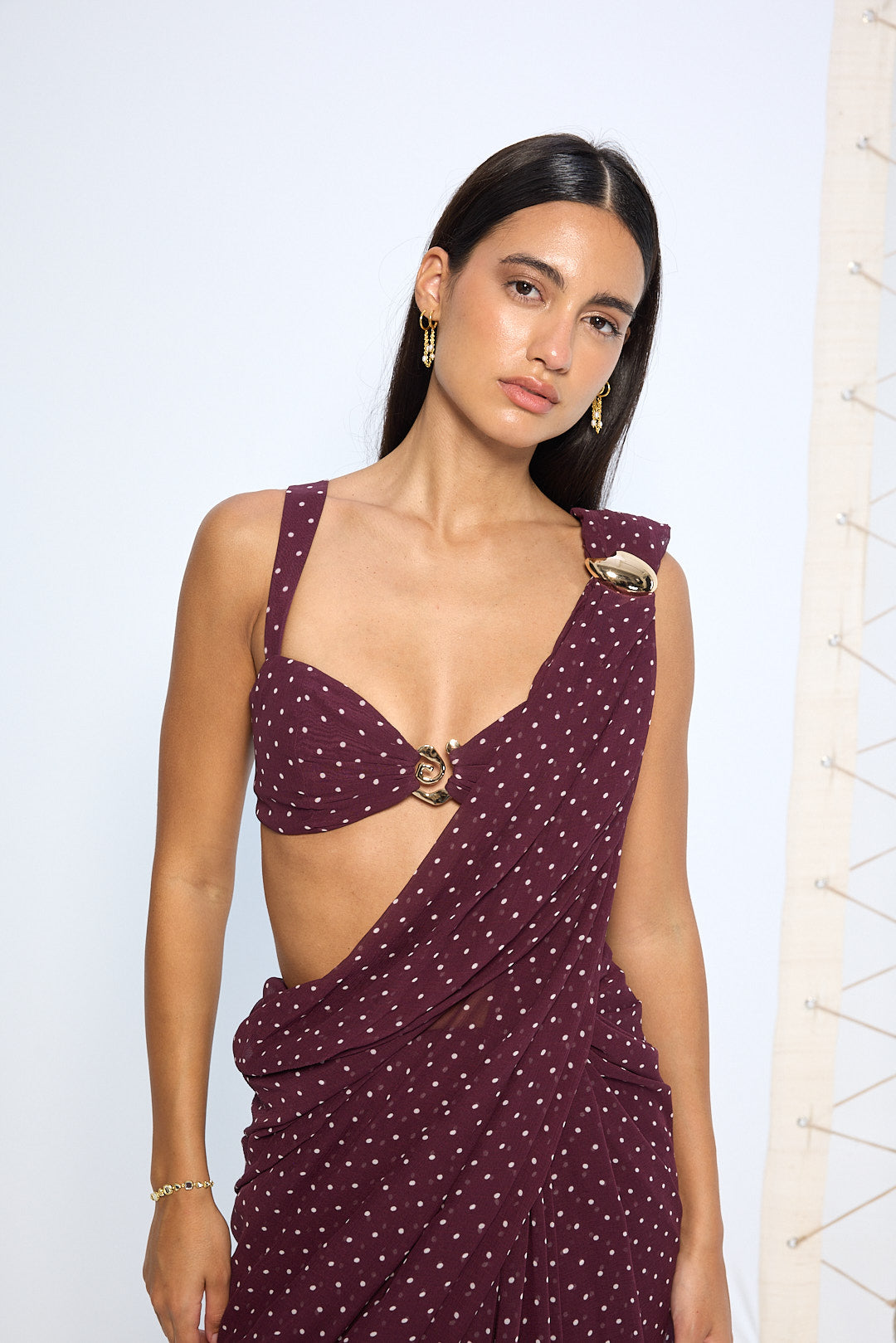 A playful reimagination of classic polkas. This maroon chiffon sari dotted in white is designed for movement and ease. A gold brooch at the shoulder secures the pallu while inviting creative draping. From festive nights to contemporary gatherings it adapts with flair. It comes with a maroon polka dot print blouse is cut in fluid chiffon, finished with a sweetheart neckline and fine shoulder straps.