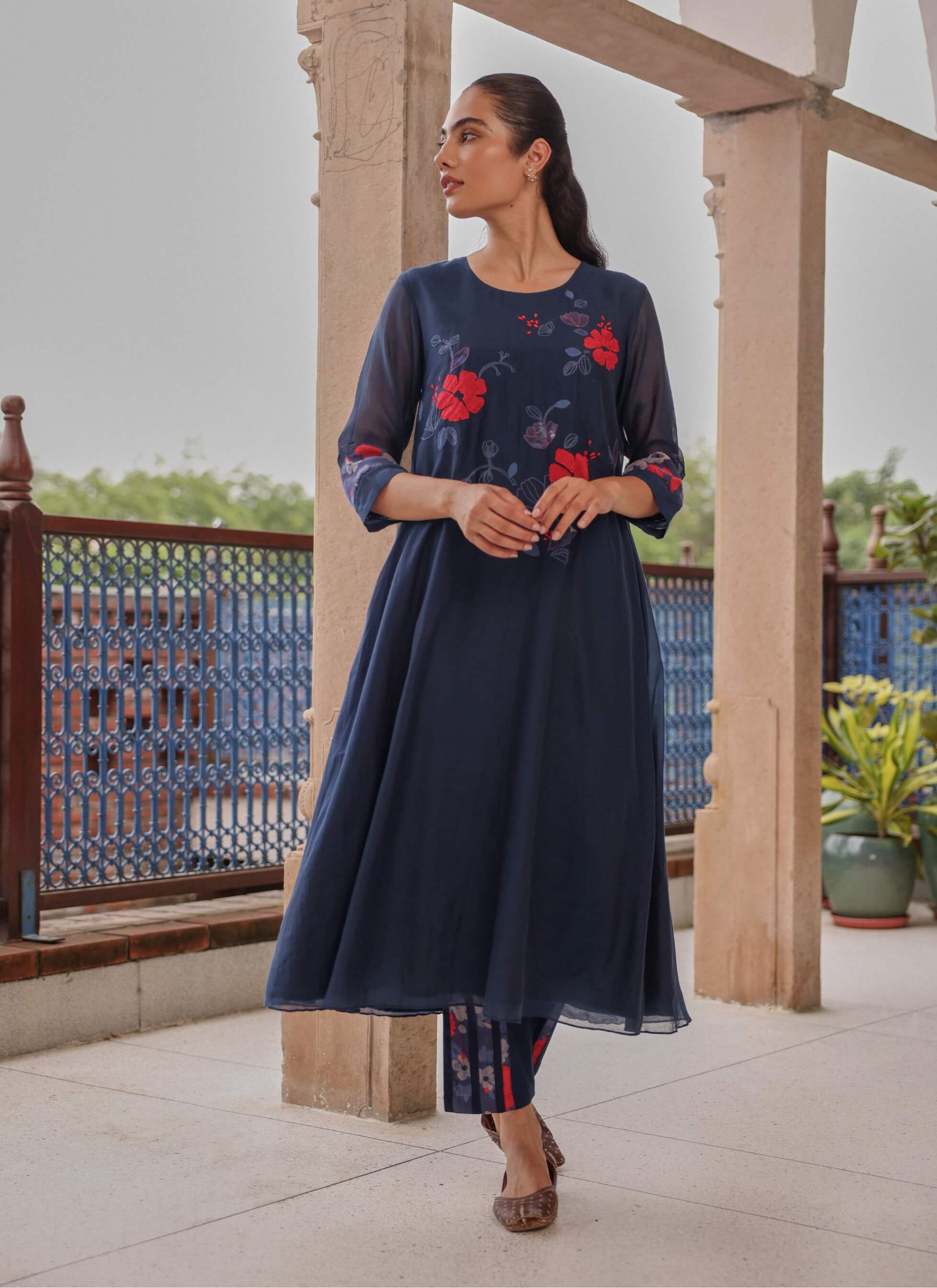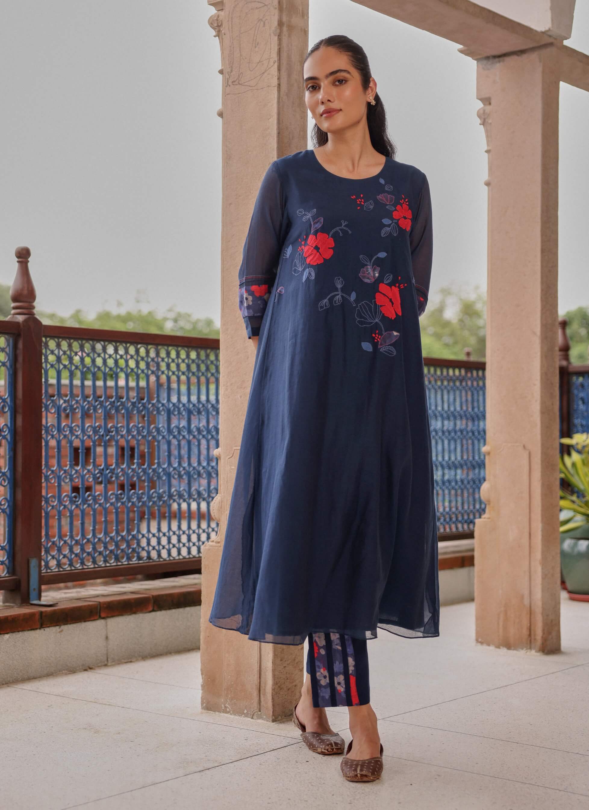 A poetic interplay of texture and hue, the Indigo Appliqué Bloom co-ord set celebrates artisanal charm. Crafted from soft muslin cotton, the tunic features delicate appliqué floral motifs, each petal adding depth and character to the ensemble. Paired with matching pants, this set balances comfort and sophistication effortlessly. Perfect for daytime soirees, festive luncheons, or casual celebrations, it radiates understated elegance. The breathable fabric and relaxed silhouette ensure all-day ease, while the intricate appliqué elevates the look to a modern classic. Step into an ensemble where artisanal detail meets timeless style.