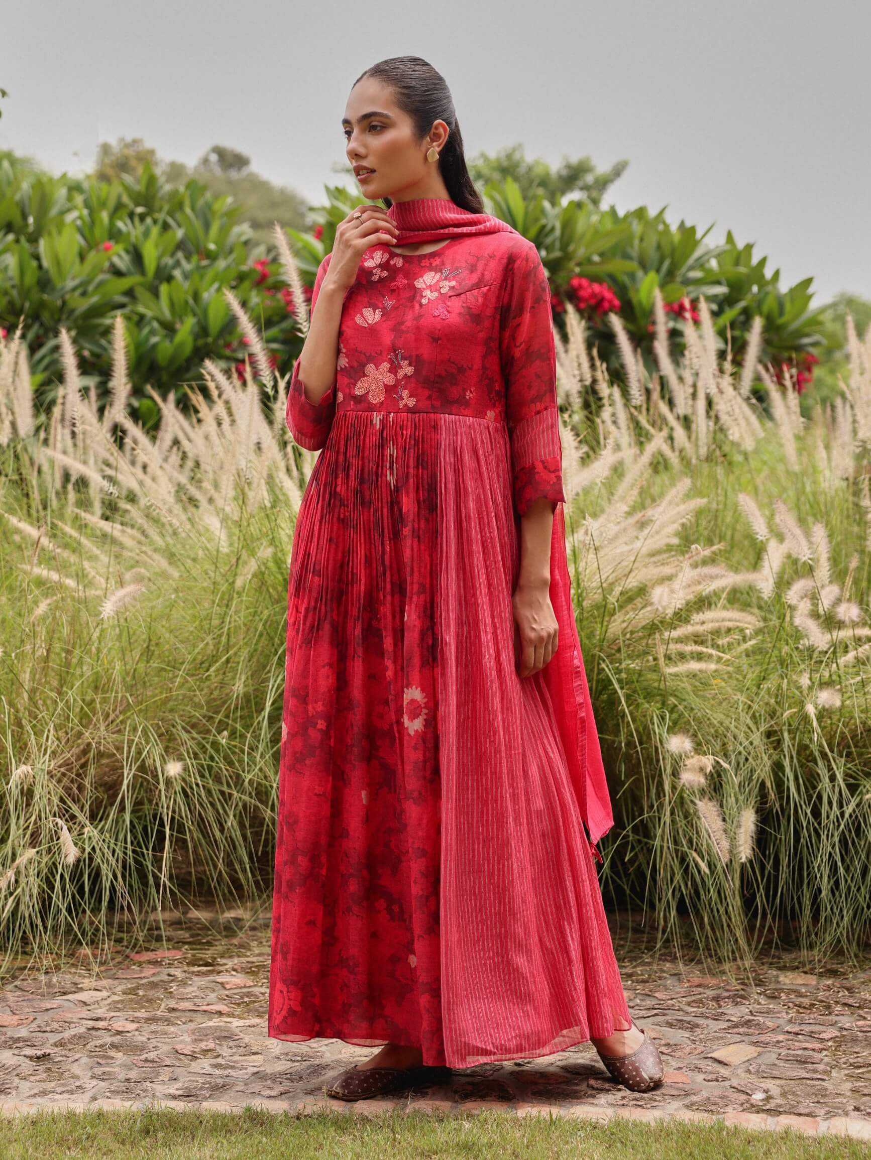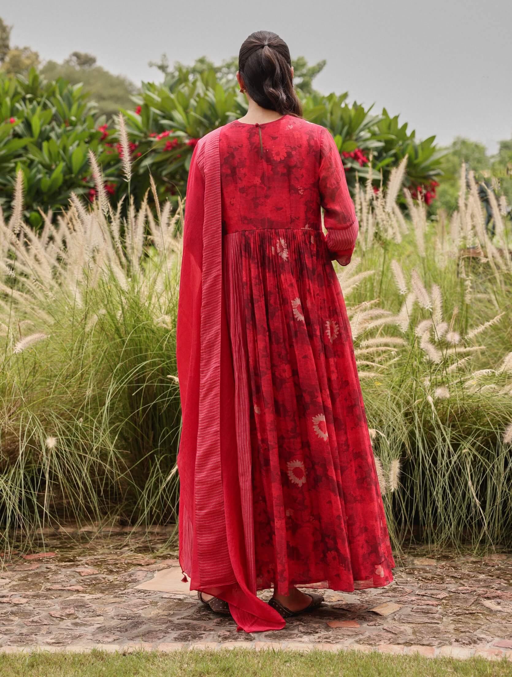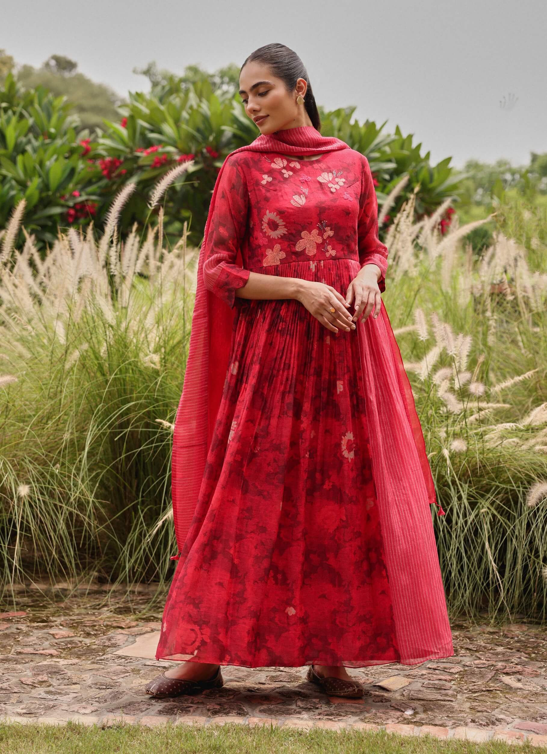 The rosewood embroidered anarkali brings a soft burst of florals to your festive wardrobe. Printed blooms on the kurta and sleeves are elevated with delicate thread embroidery on the bodice, while gathered panels create a flowy, graceful silhouette. It is paired with a matching dupatta, finished with striped borders and signature tassels, offering an effortlessly elegant festive look.