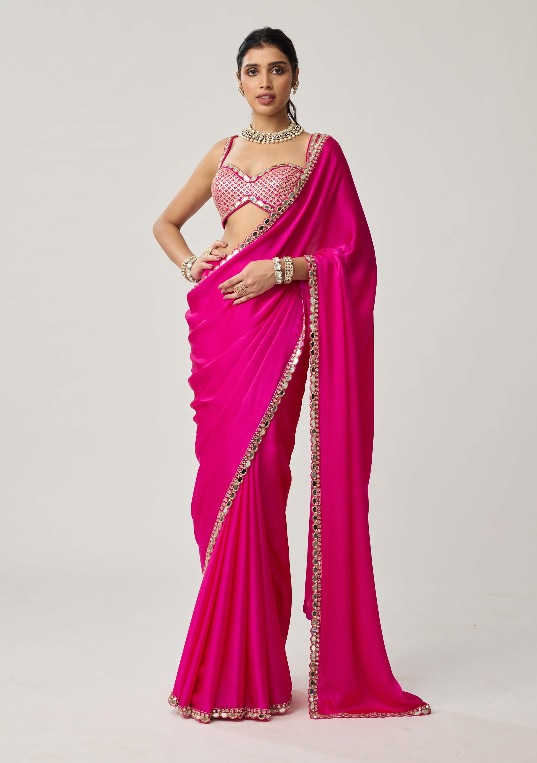 Bursting with festive vibrance, this fuchsia satin sari dazzles with hand-embroidered gota and real mirrors. The elbow-sleeve blouse infuses a traditional edge, making it perfect for haldi, mehendi, or pre-wedding rituals. A timeless celebration of color, craft, and charisma.