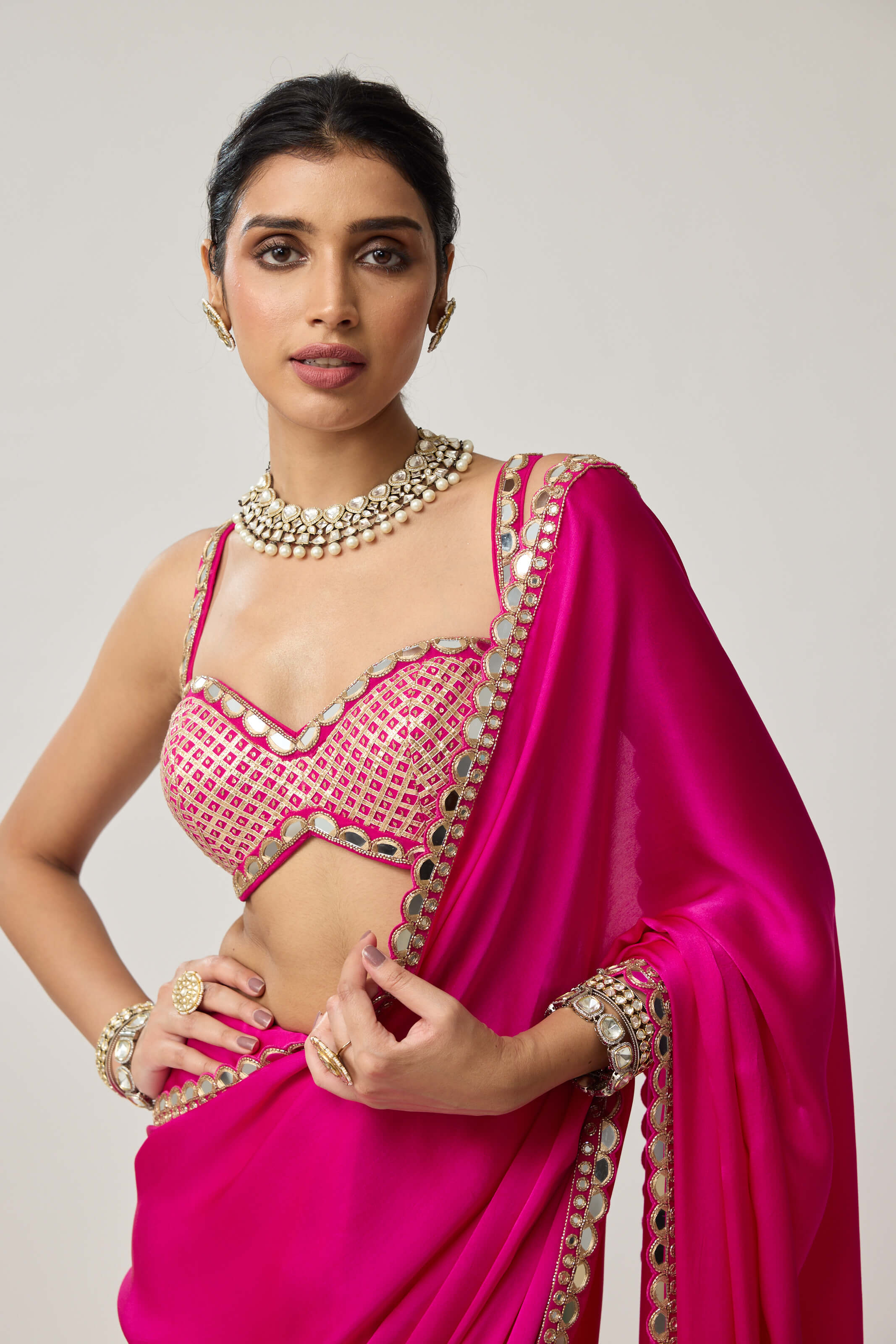 Fuchsia pink gota satin sari and blouse