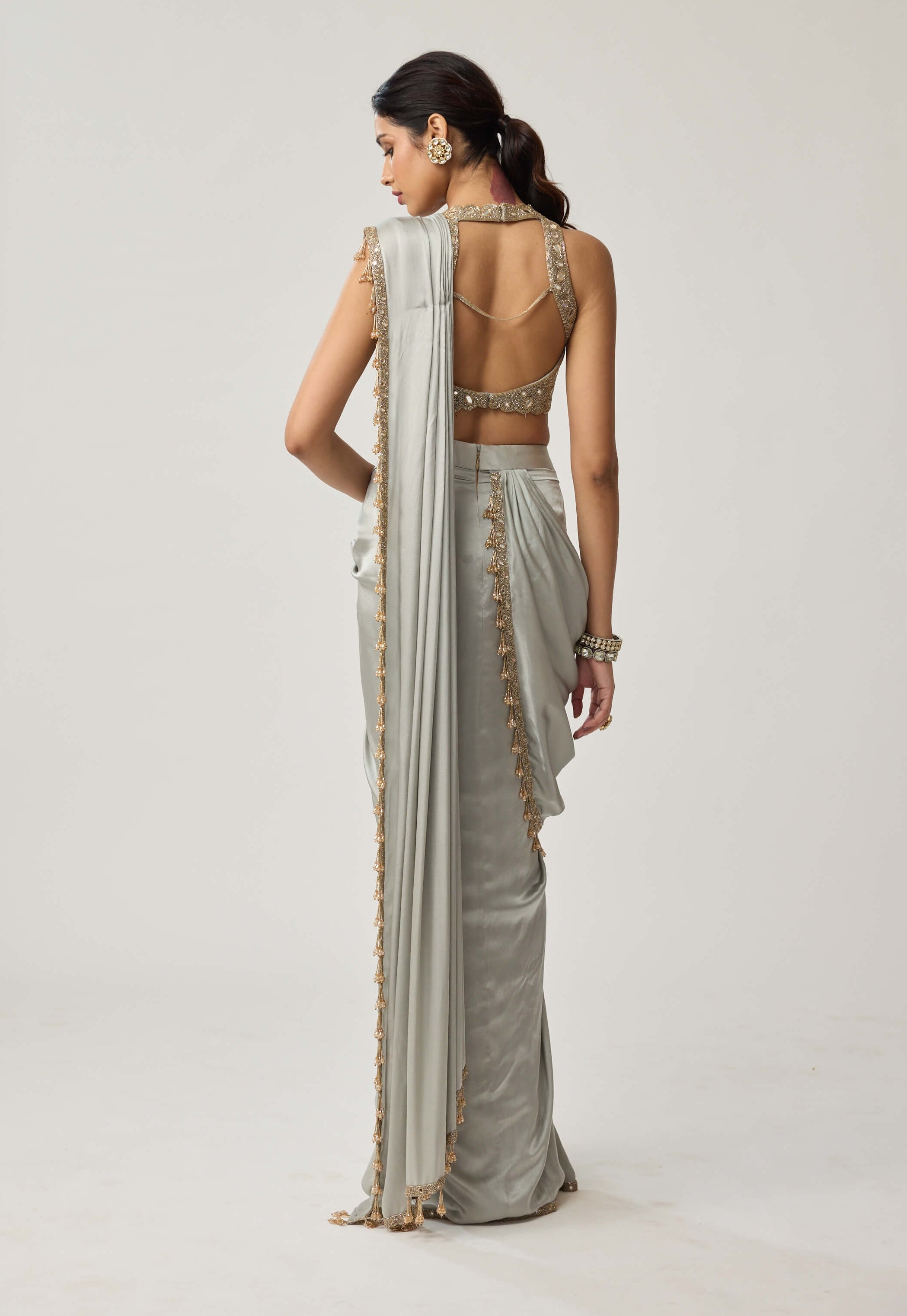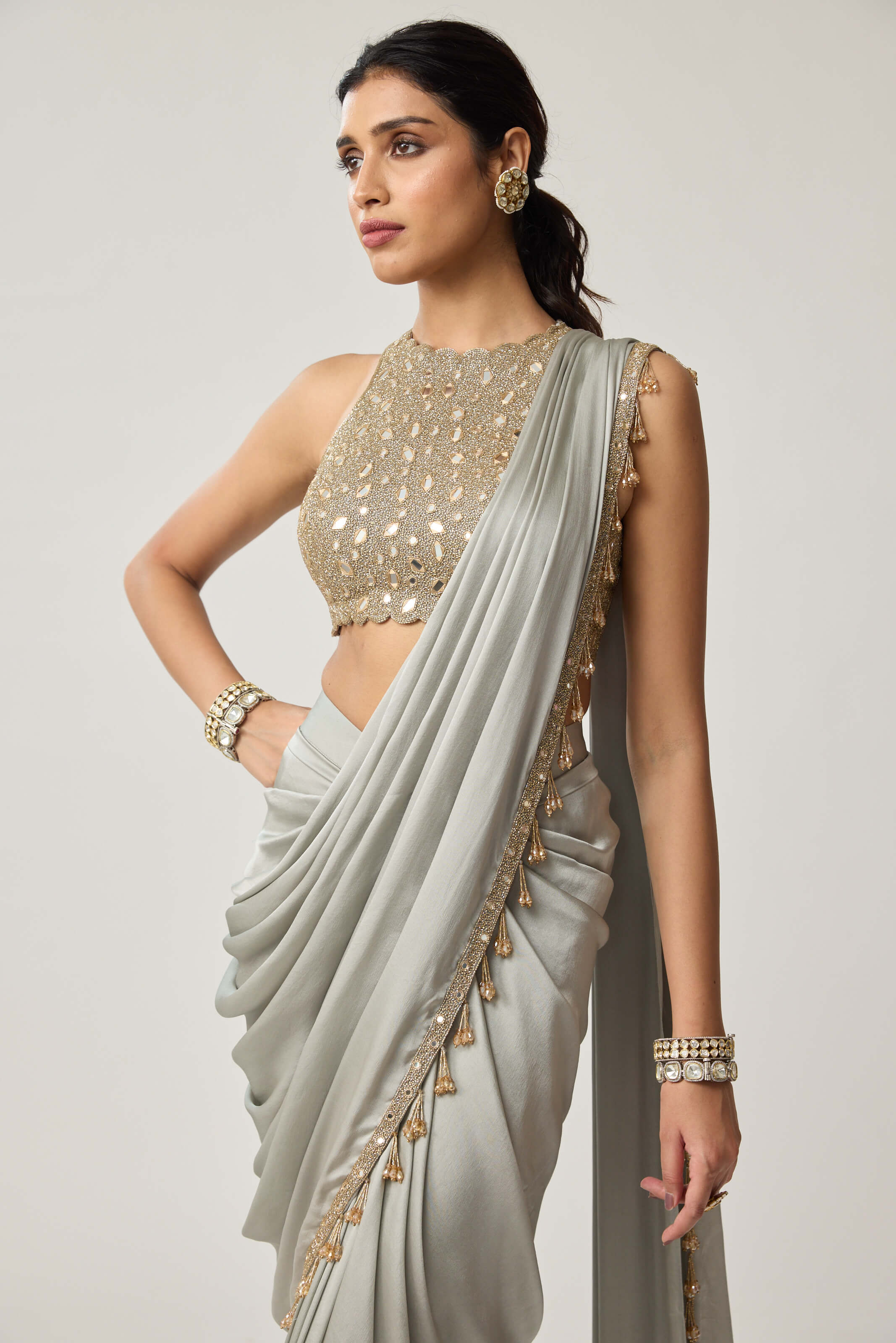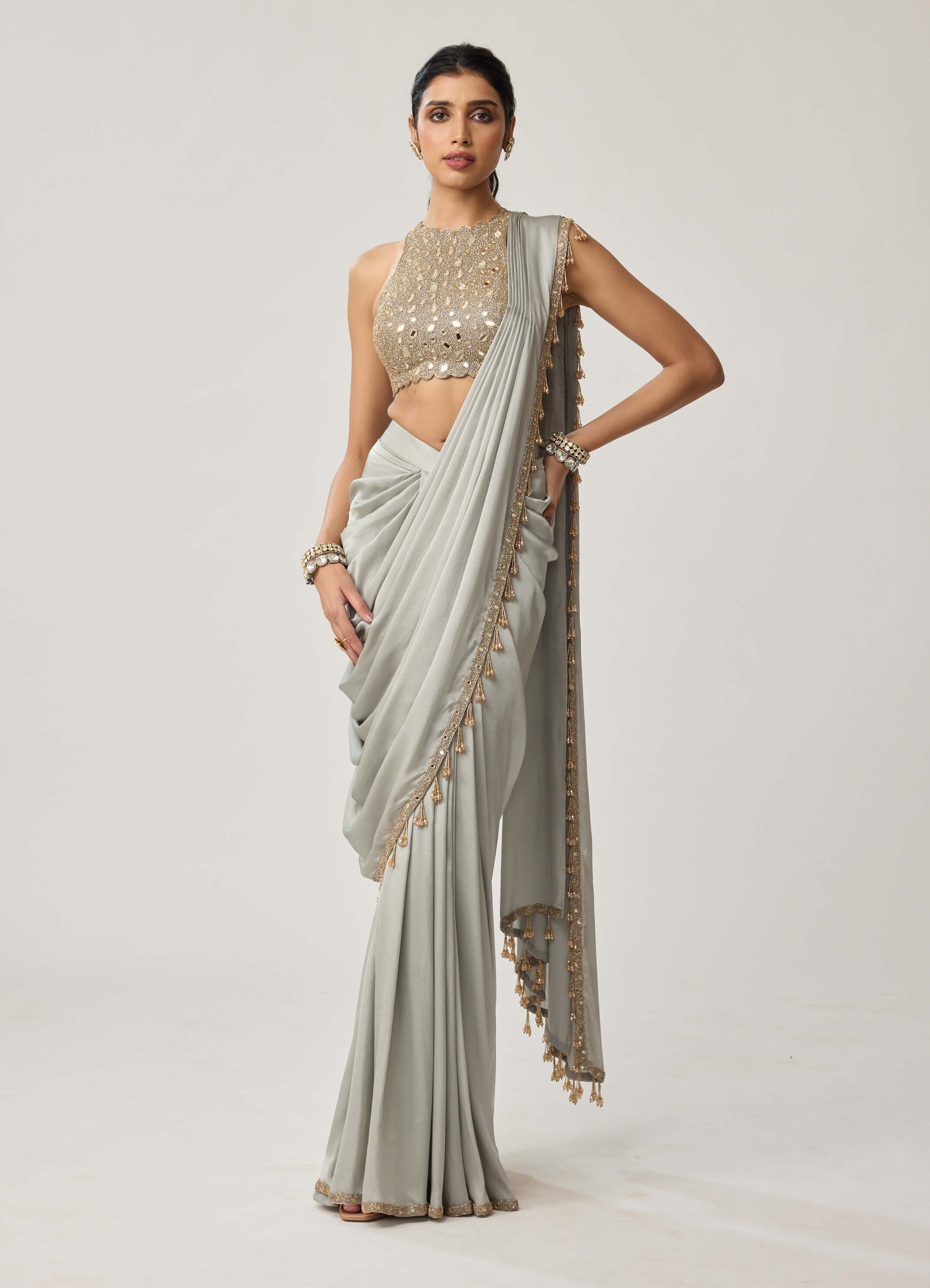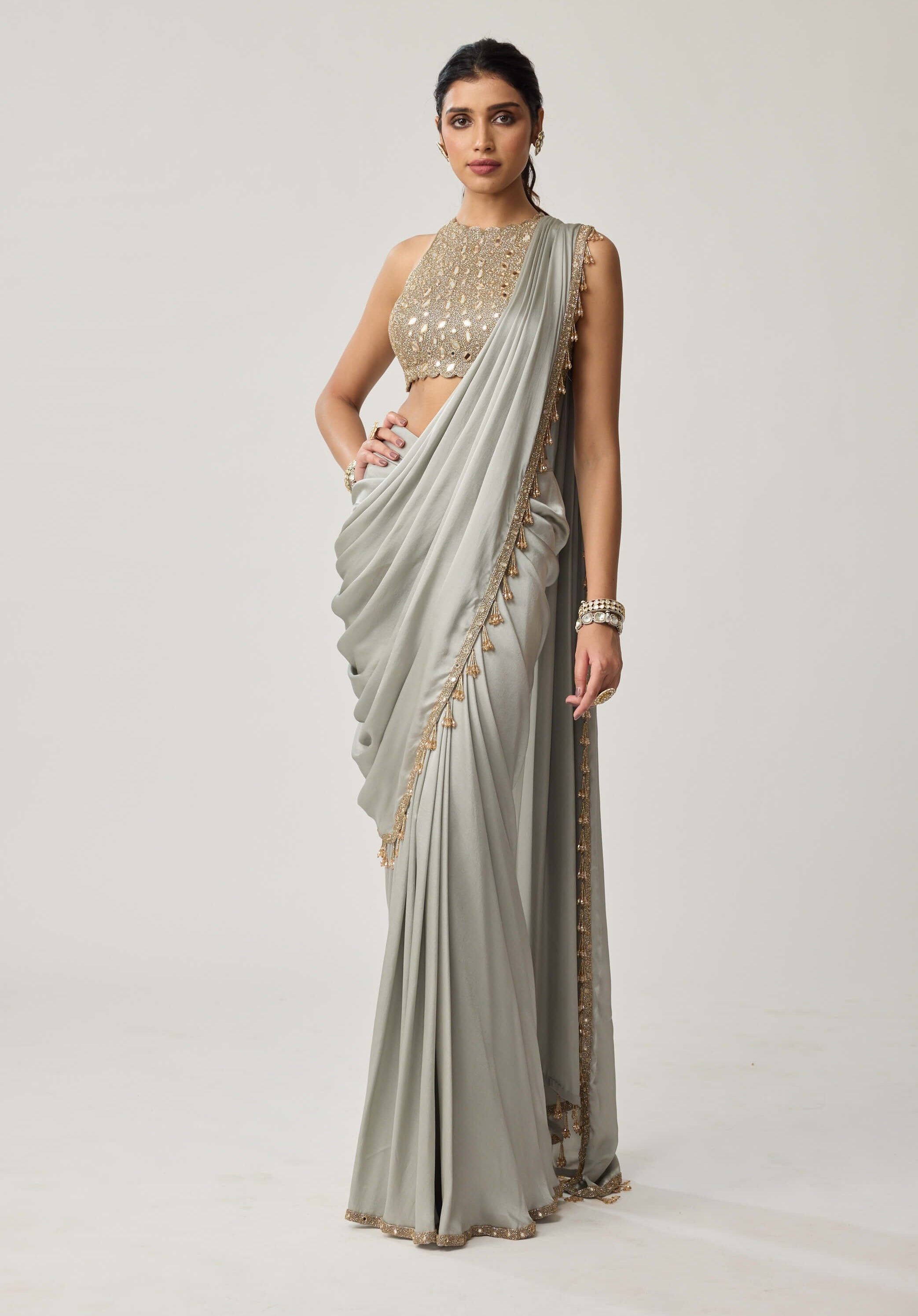 Soft hues meet radiant craftsmanship in this powder gray georgette sari, delicately hand-embroidered with real mirrors. The sleeveless blouse enhances its refined aesthetic, creating a silhouette that feels weightless yet grand. Ideal for twilight receptions, festive soirées, or elegant weddings steeped in subtle luxury.