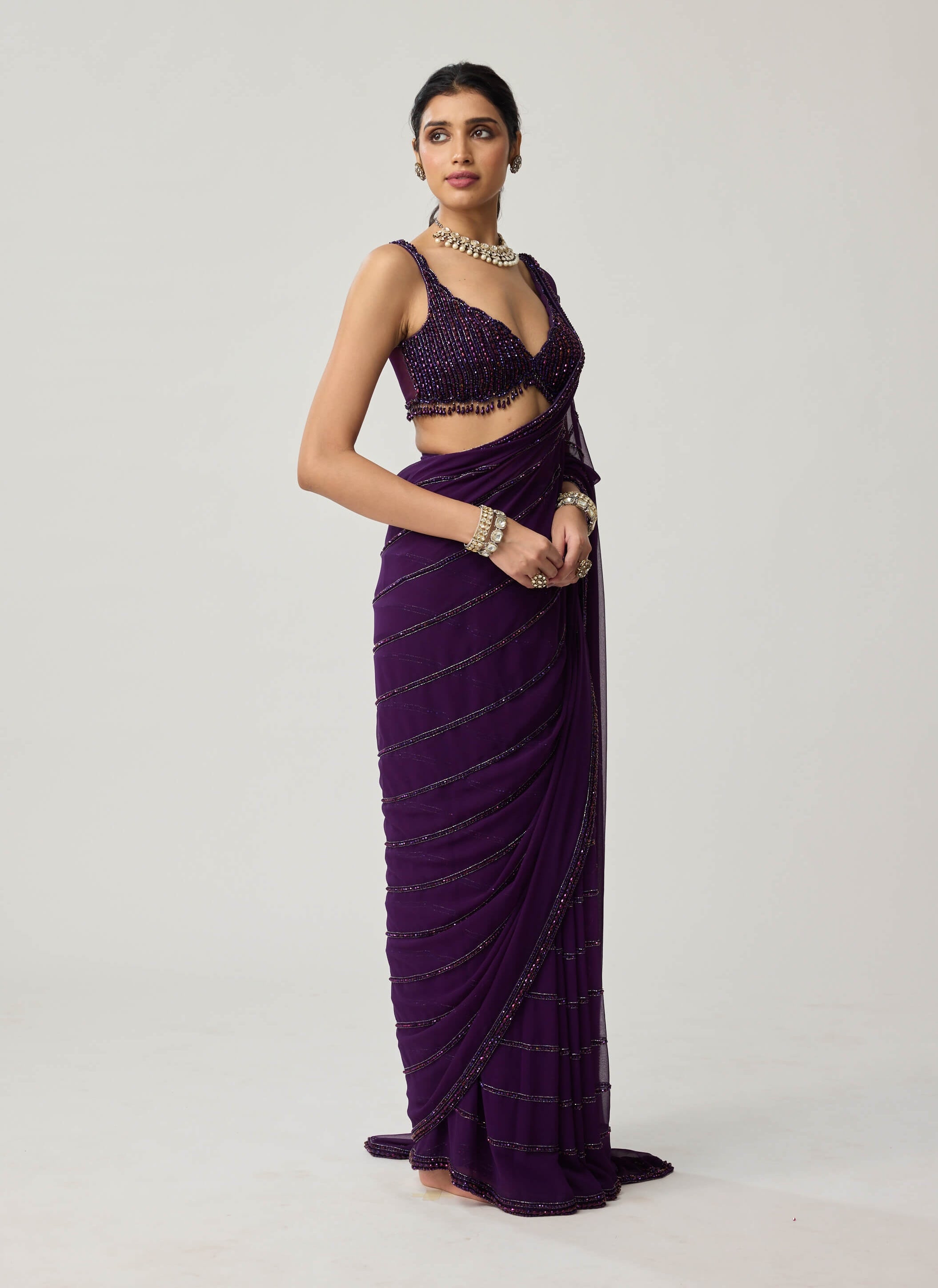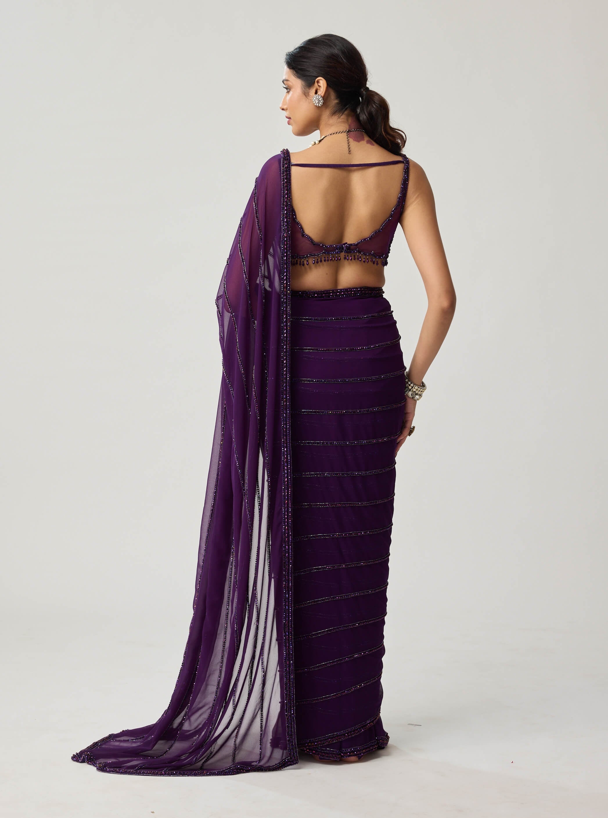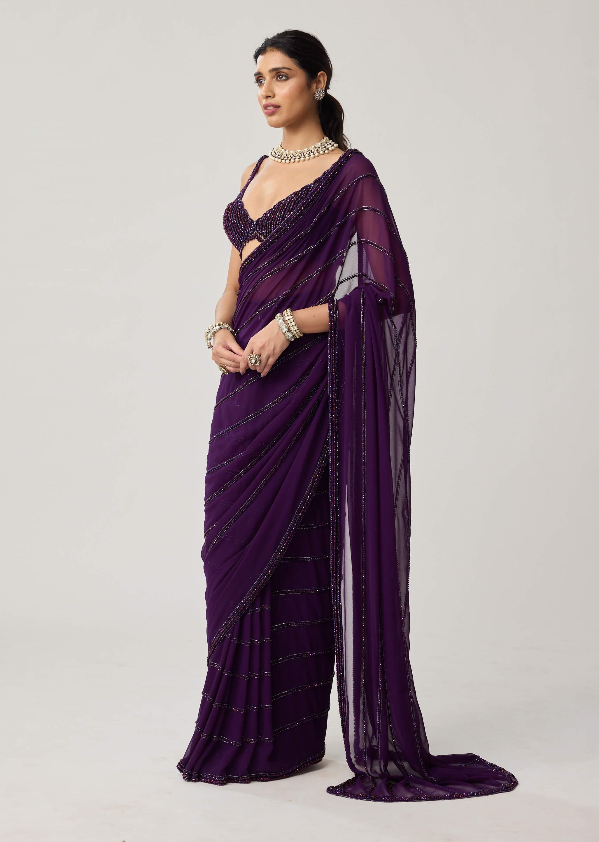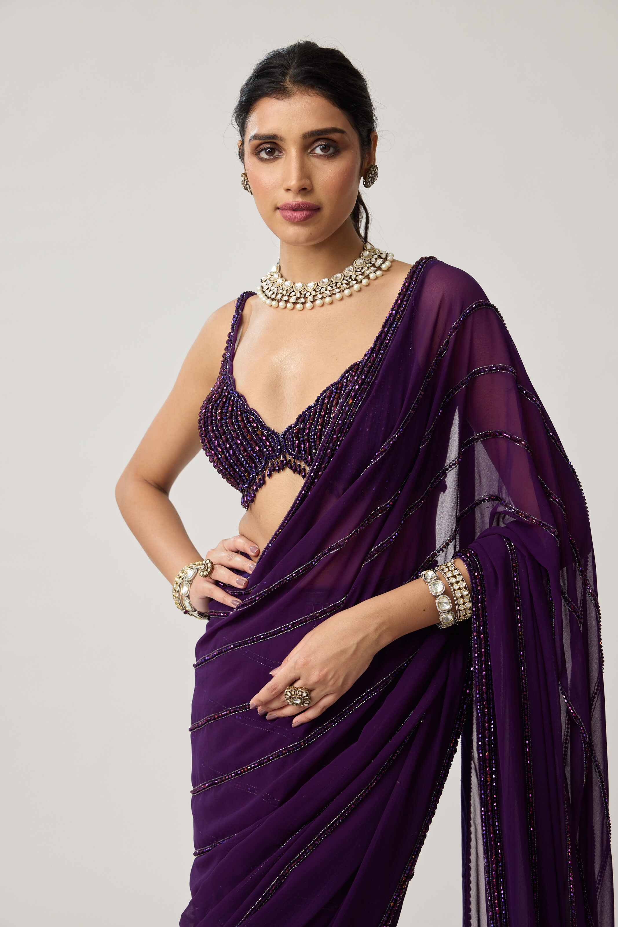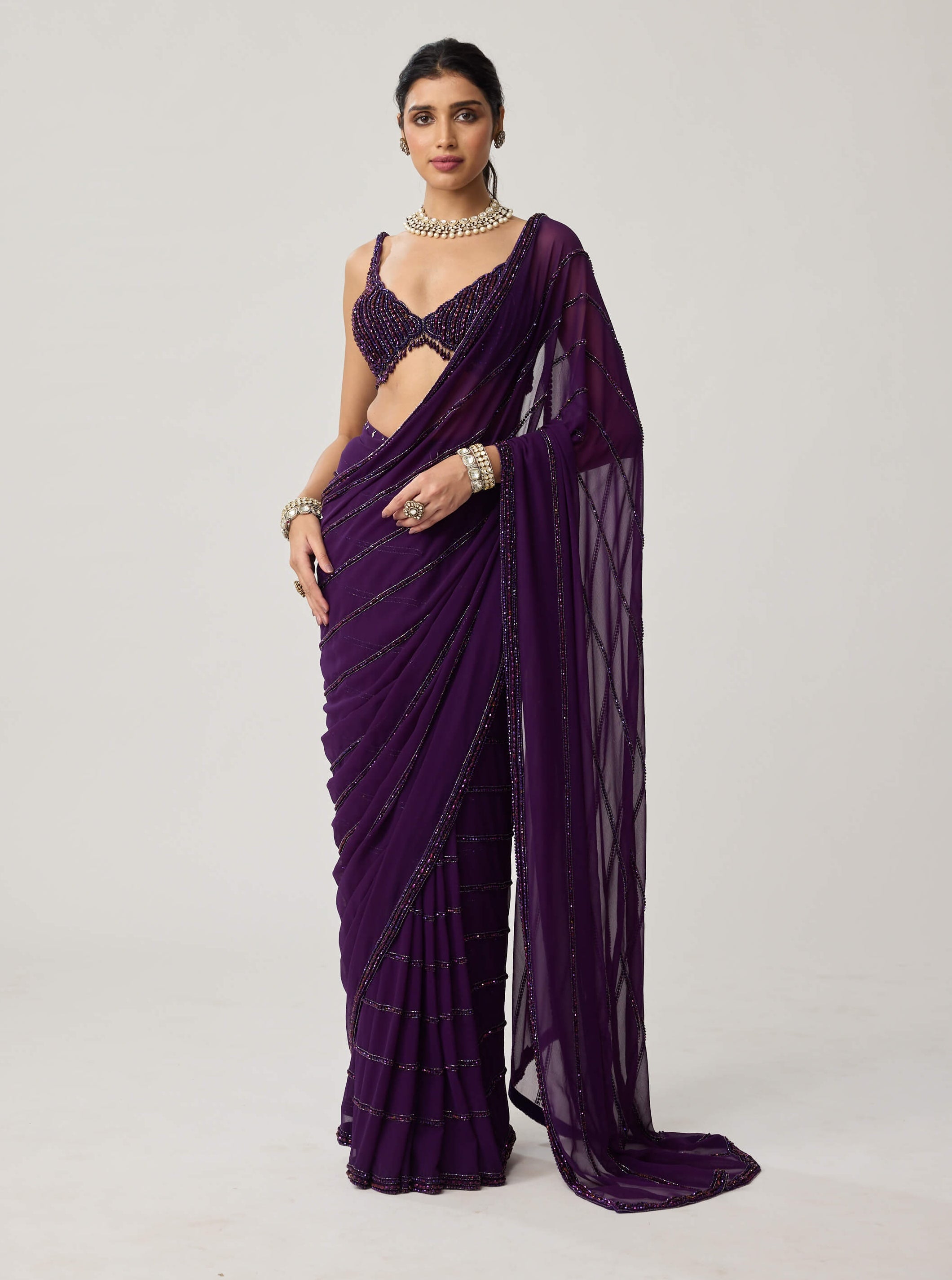Dazzling in depth and hue, this royalty purple georgette sari is adorned with crystal embroidery that captures celestial brilliance. The sleeveless blouse echoes its sparkle, creating a look both glamorous and refined. Ideal for cocktail receptions or festive nights that invite sophistication.