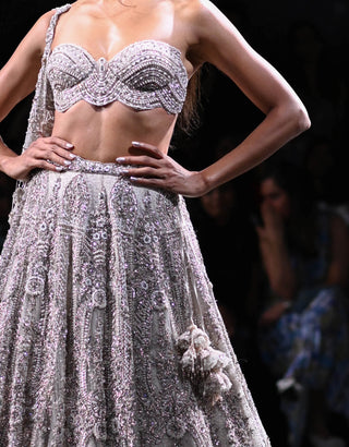 Unveil your bridal elegance in this dusty ivory shimmer tulle lehenga, exquisitely adorned with pearl and crystal encrusted details. The lehenga features captivating gold hand embroidery along the border. It is paired harmoniously with a pearl and crystal bustier blouse, a main cutwork embroidered shimmer tulle dupatta, and a light shimmer tulle veil dupatta. This ensemble is a masterpiece of opulence and tradition, ensuring you radiate unmatched charm and beauty on your special day.
