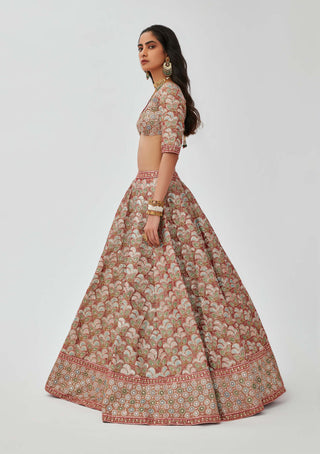 The rust tissue appliqued and heavy embellished tissue kali lehenga is a breathtaking piece of art. The intricate applique work and heavy embellishments create a captivating visual appeal. The broad border adds a touch of grandeur to the ensemble, while the matching blouse and two dupattas complete the look with elegance. This attire is perfect for those seeking a blend of traditional charm and contemporary style. With its rich rust color and exquisite craftsmanship, this lehenga is sure to make a striking impression at any special occasion or celebration.