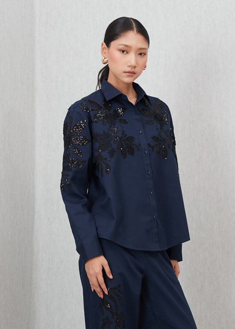 Modern refinement meets textured detailing in the aster buttondown shirt, crafted in deep navy cotton twill with tonal black applique floral motifs. The slightly oversized silhouette balances structure with ease, allowing a relaxed yet defined shape. Suitable for evening dinners, semi-formal occasions, or day-to-night events, this shirt pairs seamlessly with tailored trousers or casual chinos, offering understated statement style.