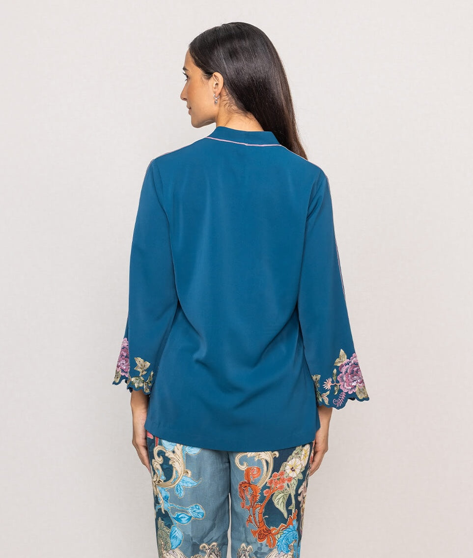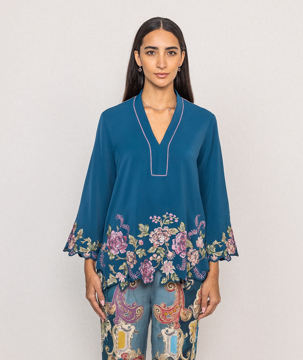 Featuring the asterra blouse in deep blue hue brings in floral work with punch and precision. Cut from stella crepe, the silhouette stays sharp while the hemline blooms with contrast embroidery in plum, blush, and fern green. The scalloped edges trace the print, giving the whole piece shape without extra weight. A stitched v-placket finishes the neckline with no buttons, no extras, just straight impact.