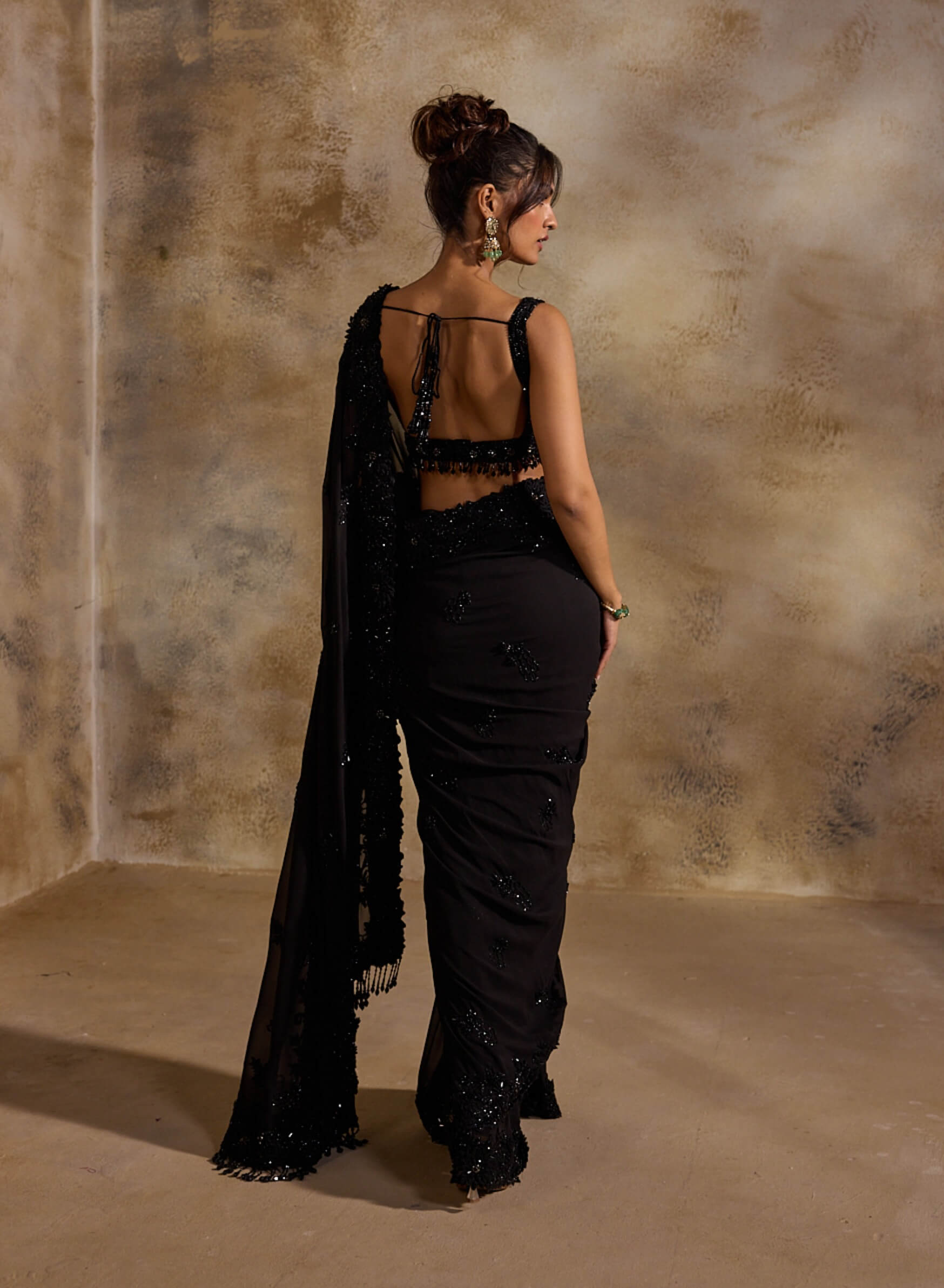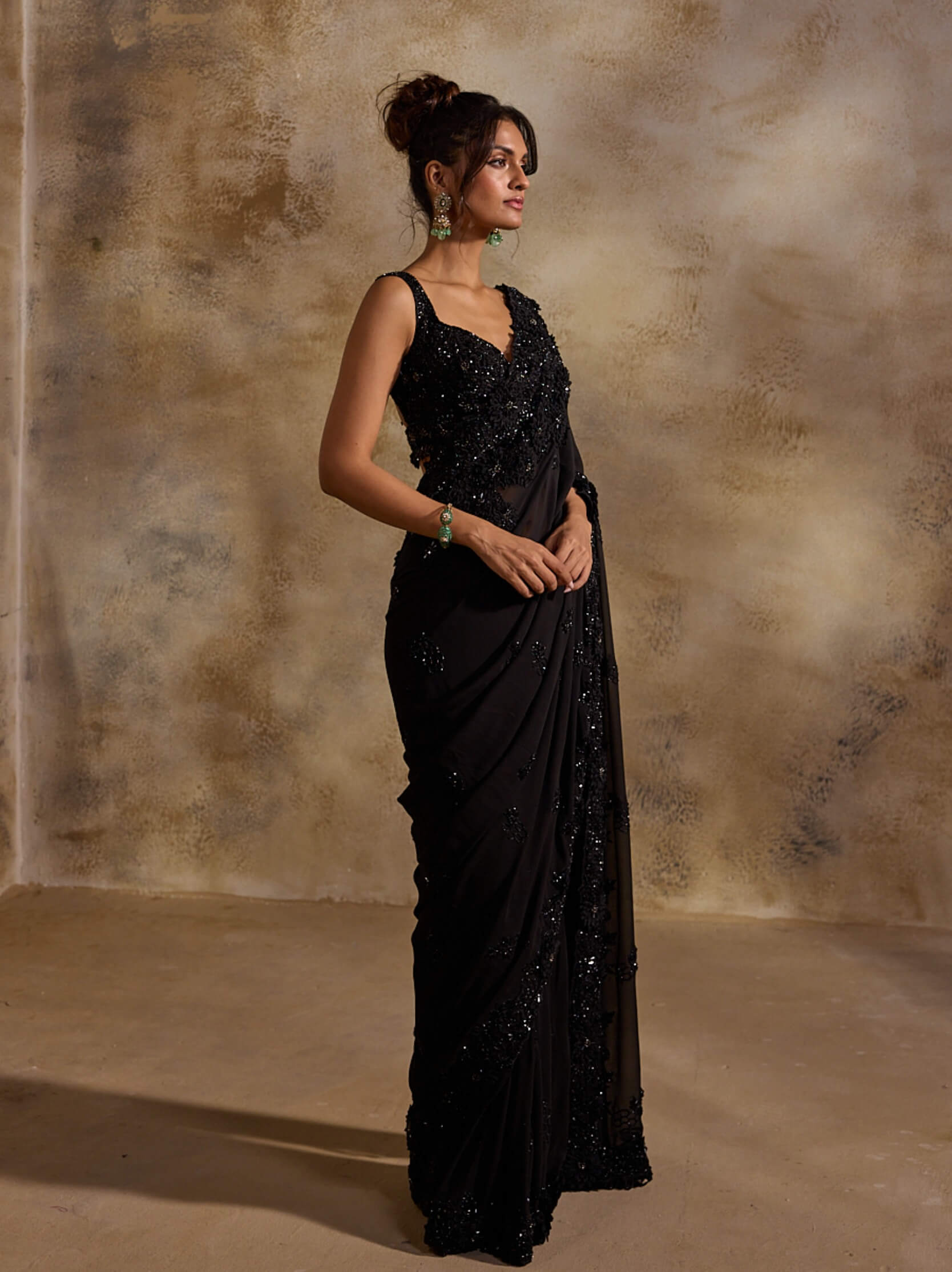 A dark allure of couture elegance defines this black georgette sari, illuminated with tonal sequins, beads and crystals for a refined monochrome shimmer. Fluid, striking and timeless, it’s crafted for cocktail nights, reception evenings and glamorous celebratory events.