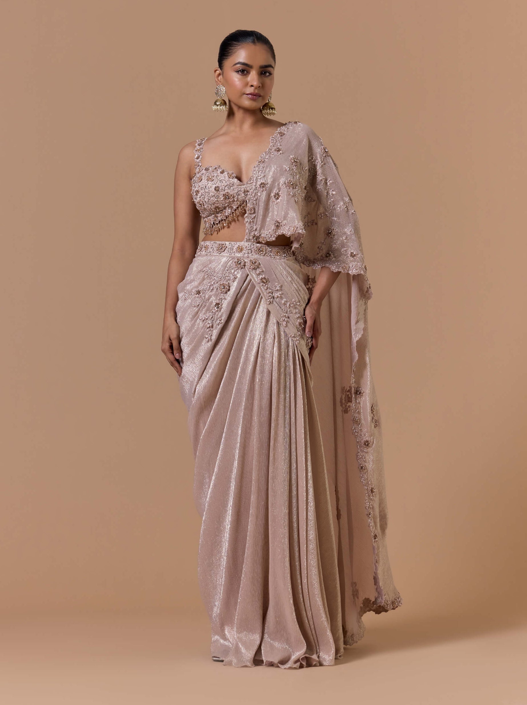 Soft blush chiffon transforms into delicate luxury in this pre-draped sari with a bralet blouse adorned with 3D florals, resham, beads, sequins and crystals—an elegant choice for mehendi ceremonies, brunch weddings and festive soirées.