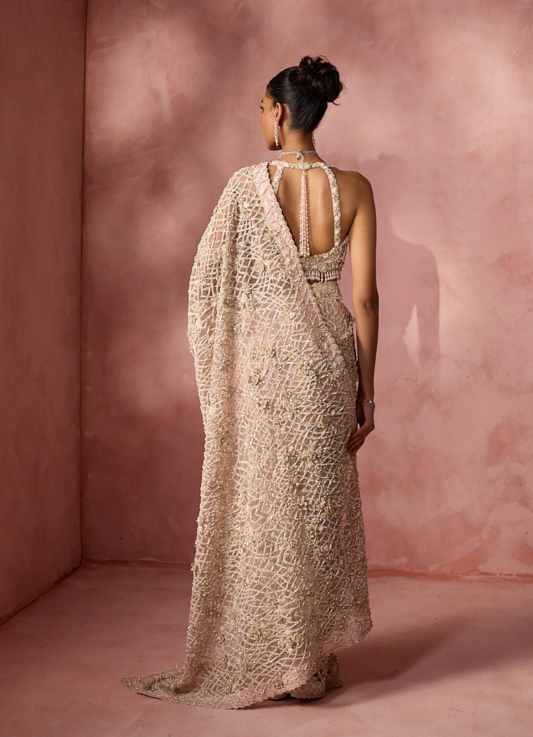 A romantic blush-pink glow illuminates this net sari, embroidered in an intricate jaal of tonal beads, sequins and crystals for soft opulence. Graceful, feminine and refined, it’s ideal for receptions, cocktail nights and elevated festive gatherings.