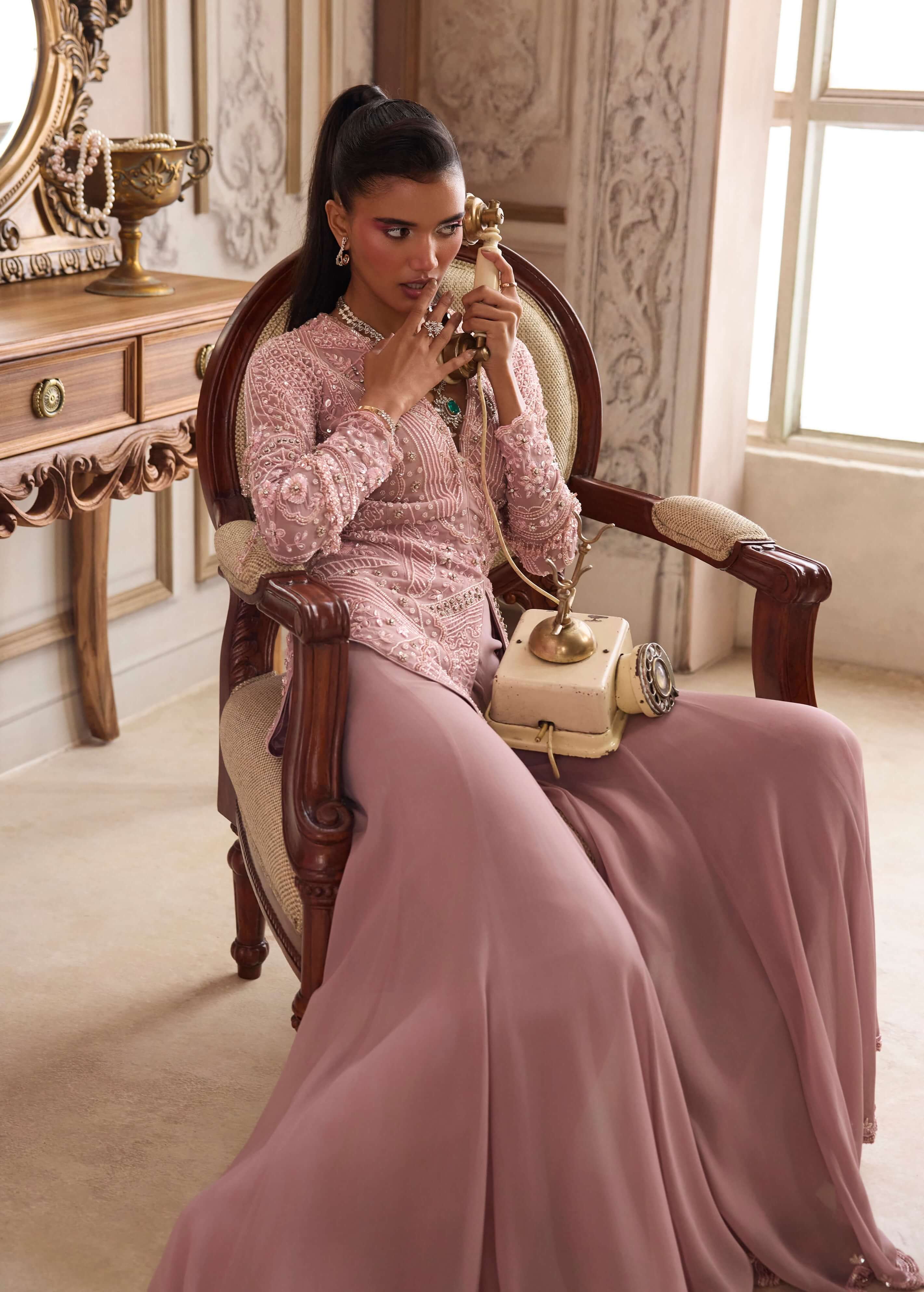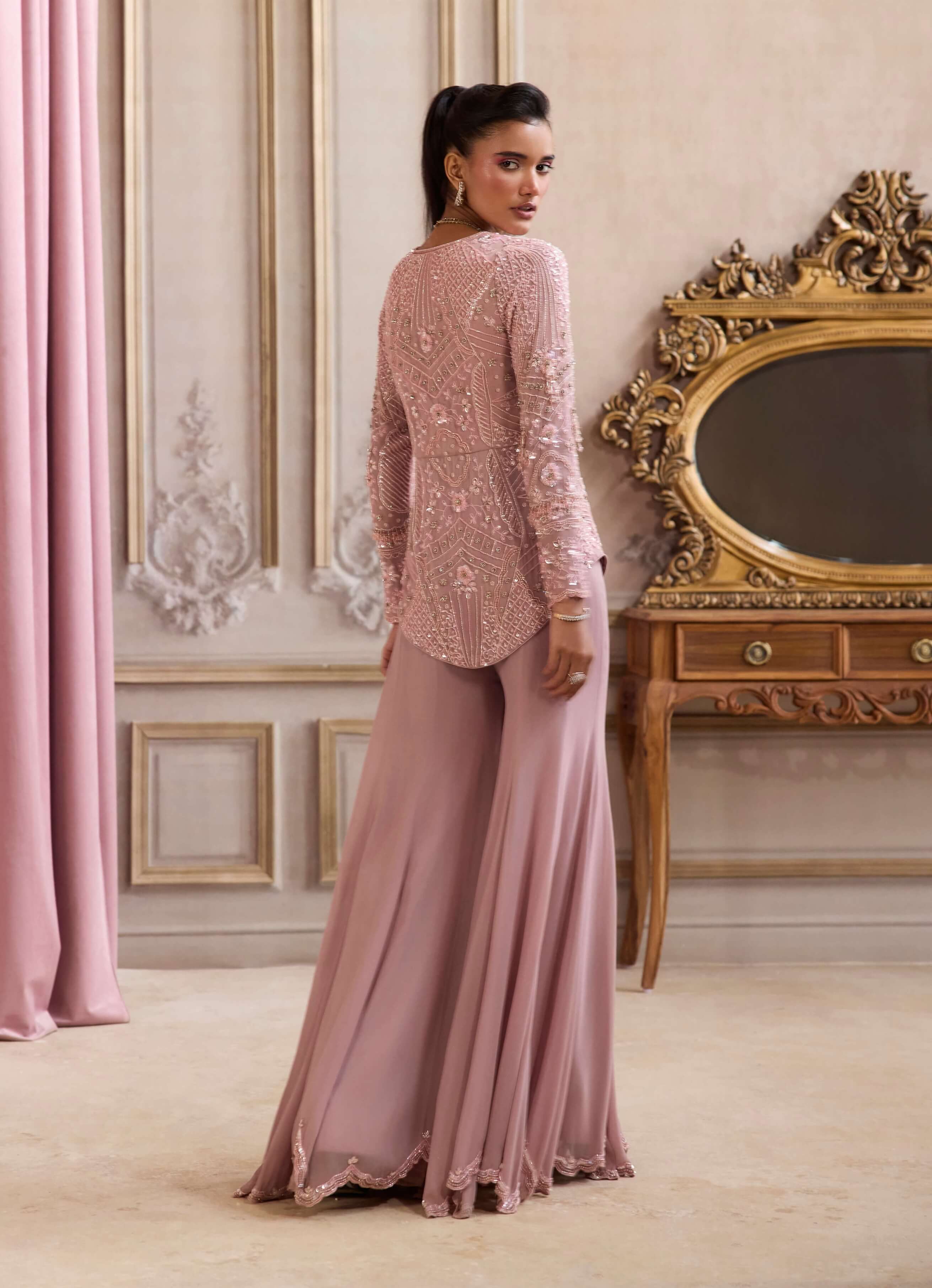 An ode to minimal opulence, this champagne georgette peplum ensemble is intricately hand-embroidered with pearls, sequins, and beads. The silhouette merges traditional craft with a contemporary rhythm, paired with kalidar pants delicately embroidered along the hem. Fluid yet refined, it embodies timeless sophistication.