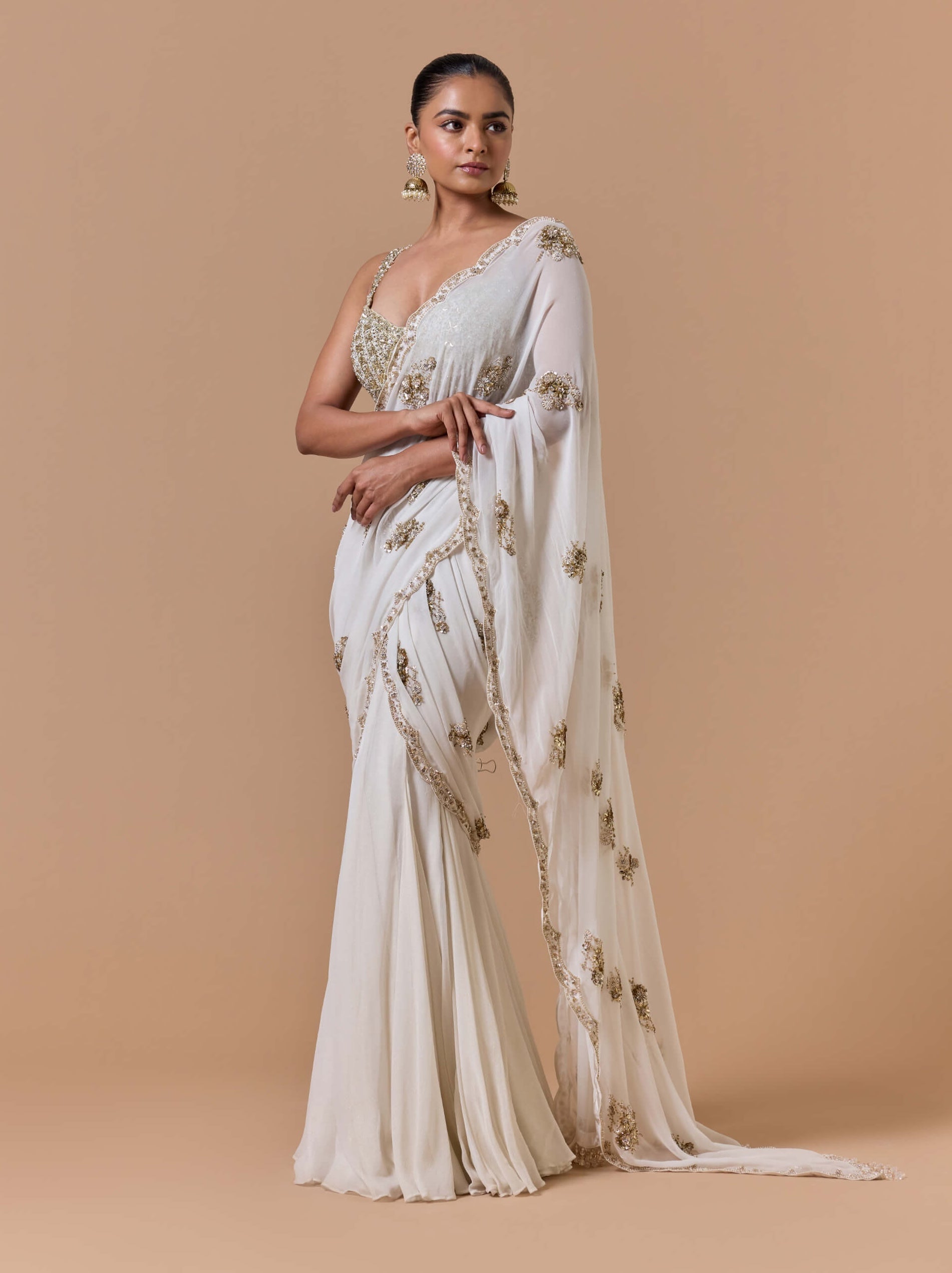 Golden-tinged cream luxury radiates in this shimmer georgette pre-draped sari with a scalloped palla and strappy blouse, perfect for cocktail evenings, receptions and grand festive gatherings.