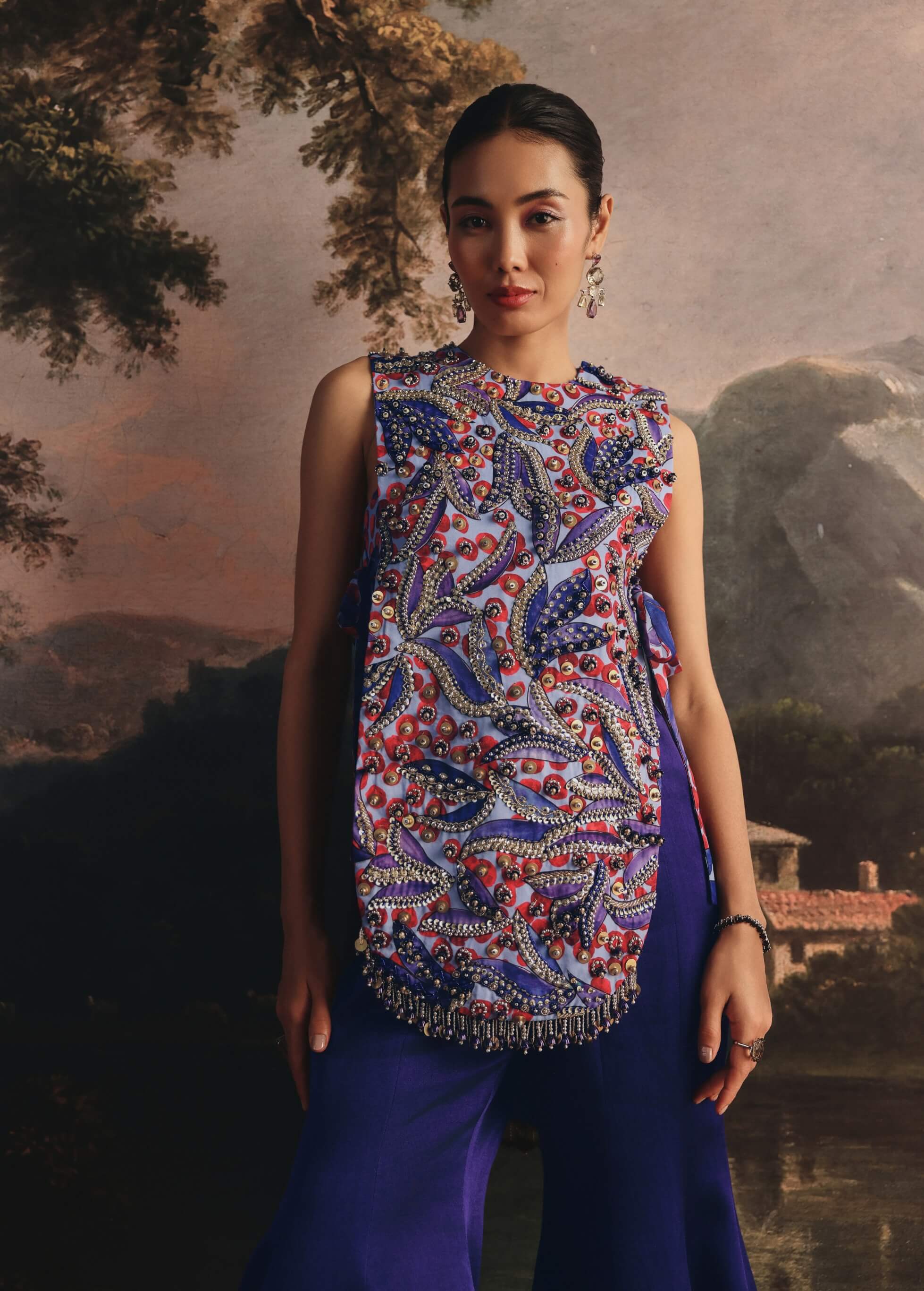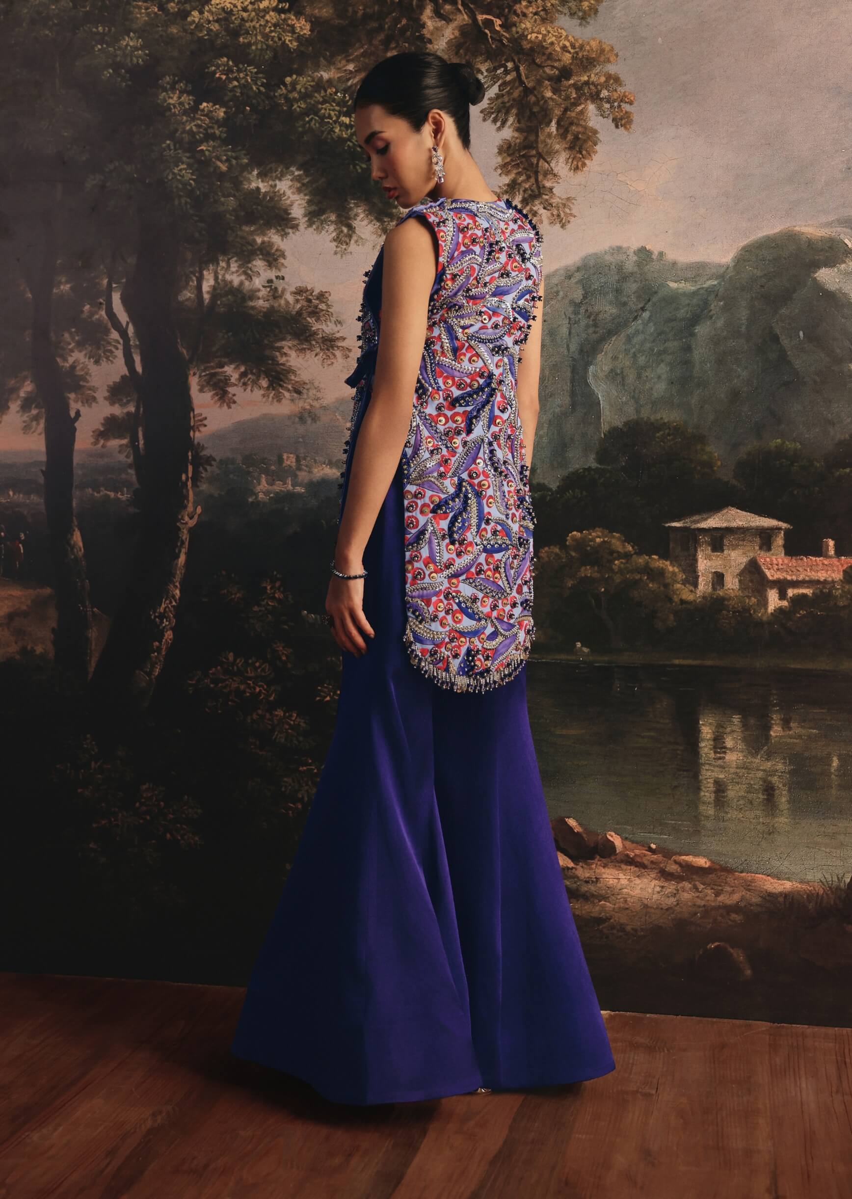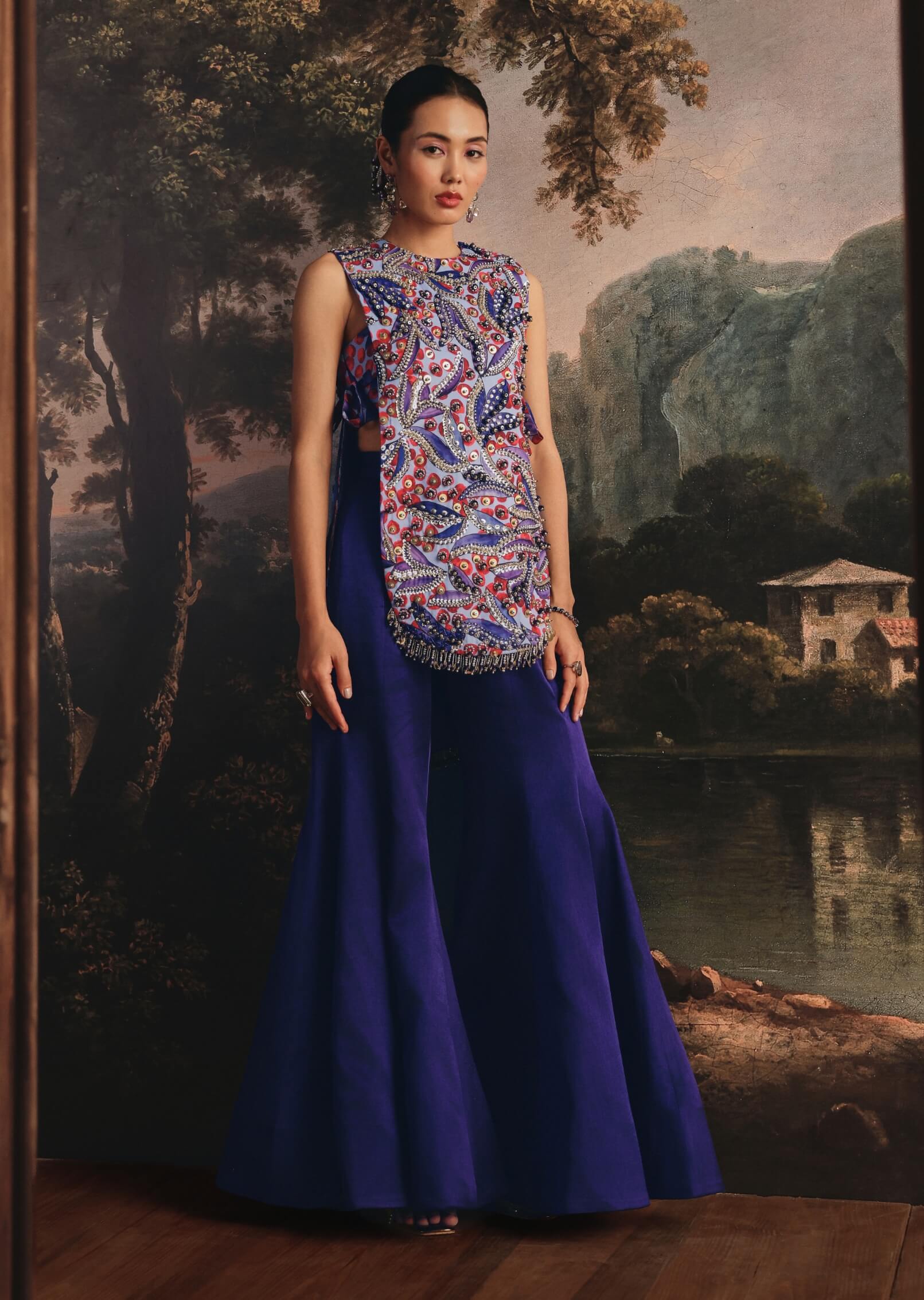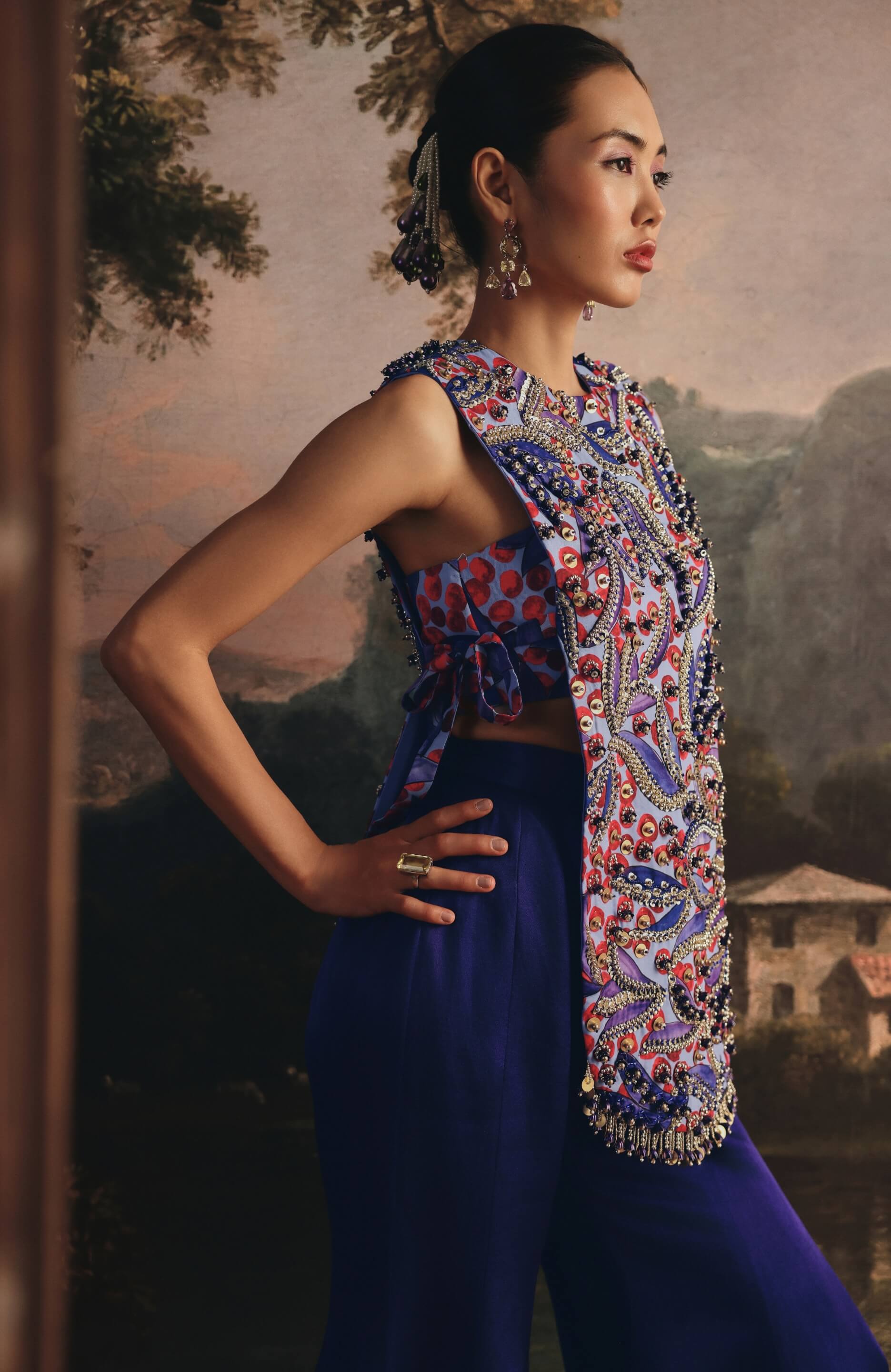 Chic and unapologetic, this deep purple set pairs bell-bottom pants with a hand-embroidered printed jacket and bustier. Coin and bead embellishments add textural intrigue, crafting a balance between structure and glamour — ideal for festive soirées with an editorial edge.
