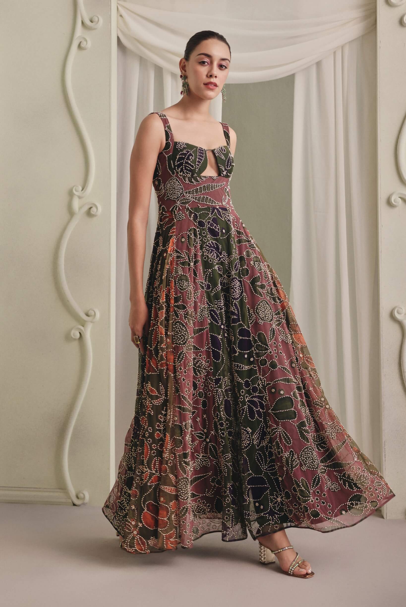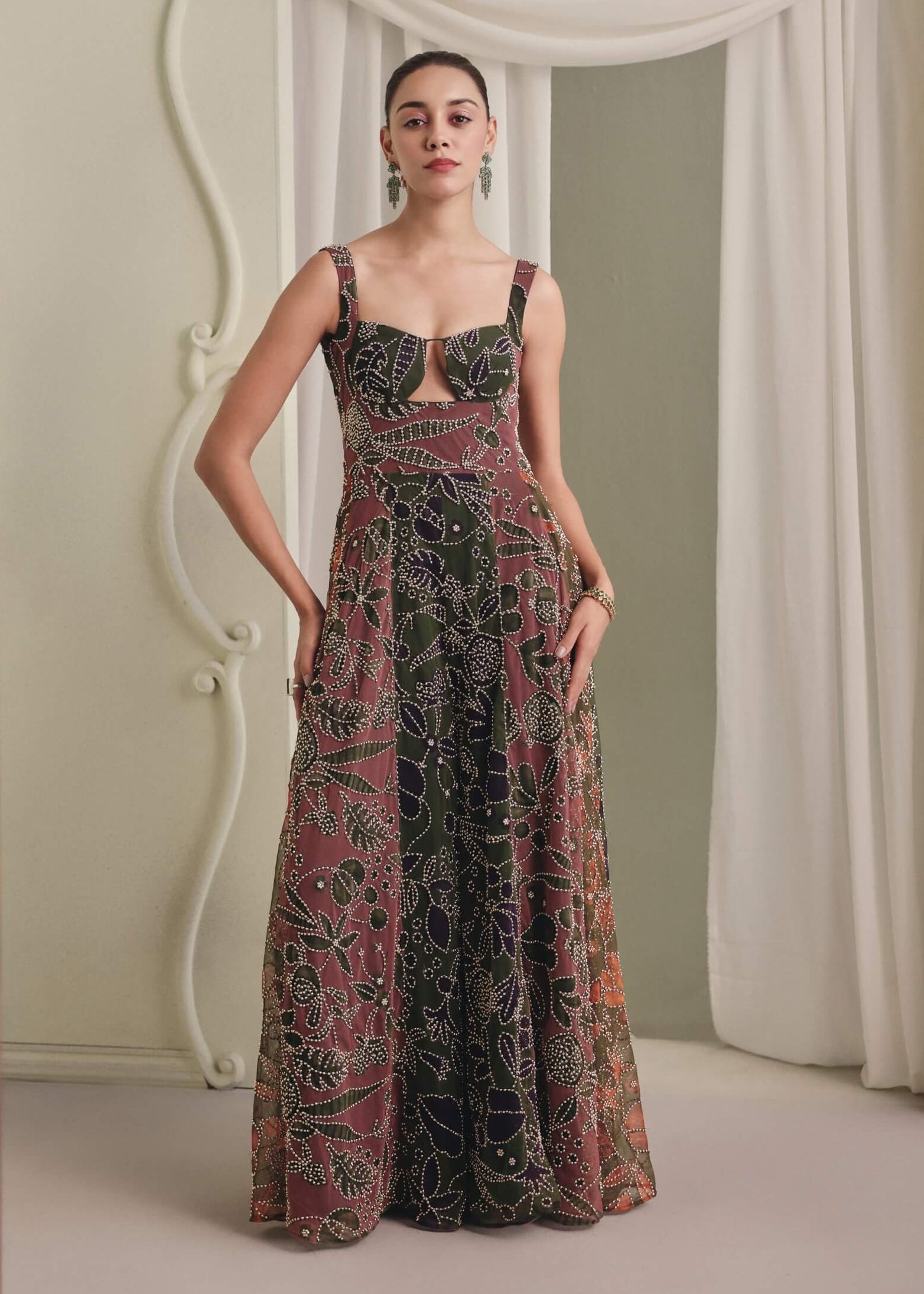 A disco-inspired jumpsuit that channels modern glamour — featuring a sculpted bodice, flared legs, and iridescent hues of wine and olive. Designed to catch every light, it’s an unapologetically bold choice for high-octane evenings.
