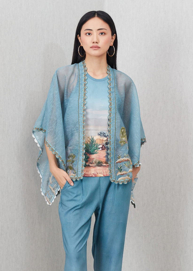 Poetic layering defines the elle blouse set, combining a racerback tank with a sheer teal dhaka linen blouse. The open-front silhouette features intricate thread embroidery illustrating landscapes and florals, finished with scalloped multicolor borders. Perfect for refined day outings, layered evening dinners, or casual gallery strolls, this set exudes quiet sophistication with a narrative touch.