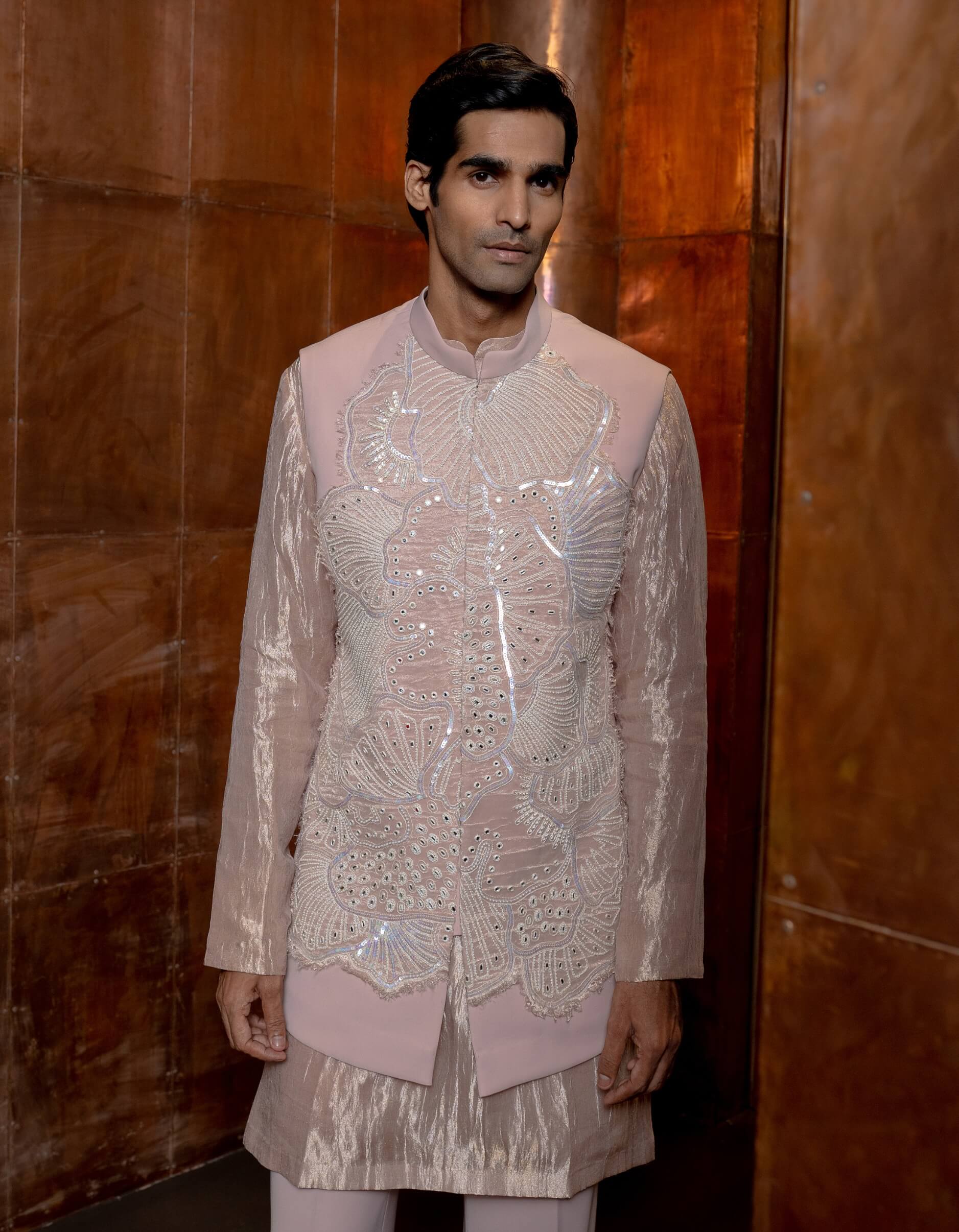 The elvor jacket set delivers a refined balance of structure and fluidity with its indo-crepe bandi and tailored pants, elevated by a tissue-silk kurta in powder pink. The combination brings depth, texture, and modern festive flair. Perfect for mehendi afternoons, engagement functions, or destination weddings, this ensemble offers ease without compromising elegance. Its tonal harmony and elevated tailoring make it ideal for celebrations that call for relaxed sophistication. A contemporary favourite for the modern groom’s entourage.