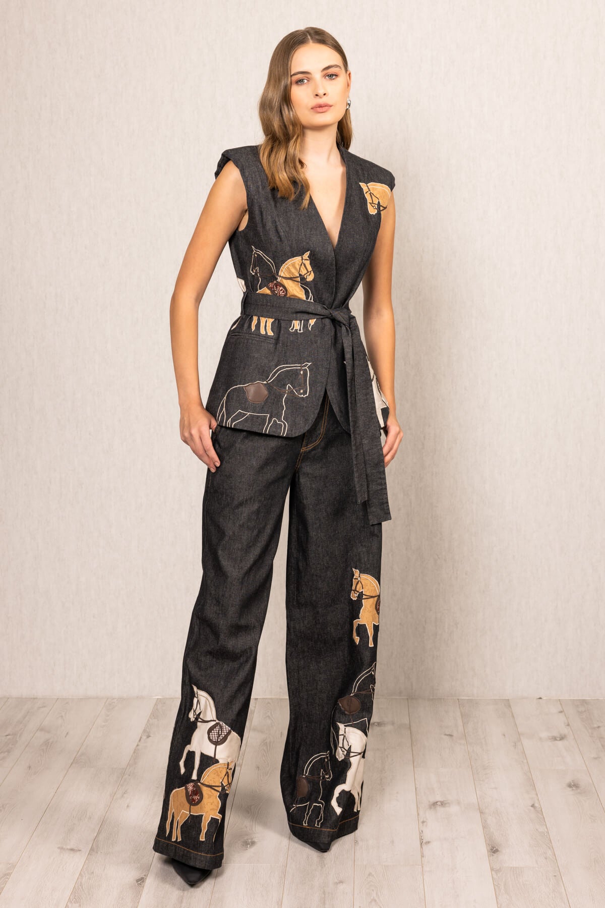 The fable wide leg jeans redefine statement denim. Crafted in black with a high-rise waist, they’re adorned with horse appliqué embroidery along the legs. The wide-legged silhouette flows with clean lines, balancing structure and flair. Designed for stylish brunches, casual evenings, or paired with the vega waist coat for a complete story.