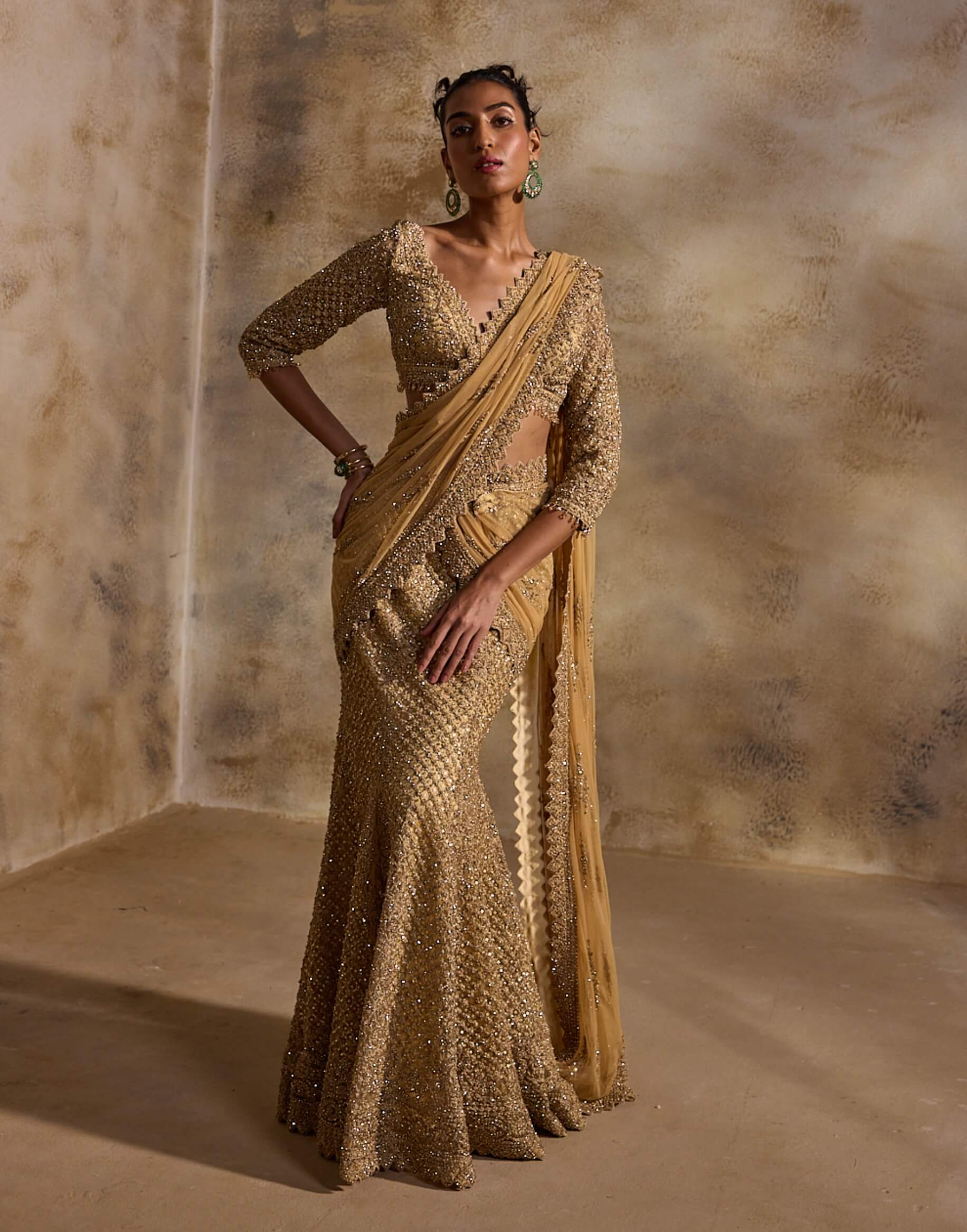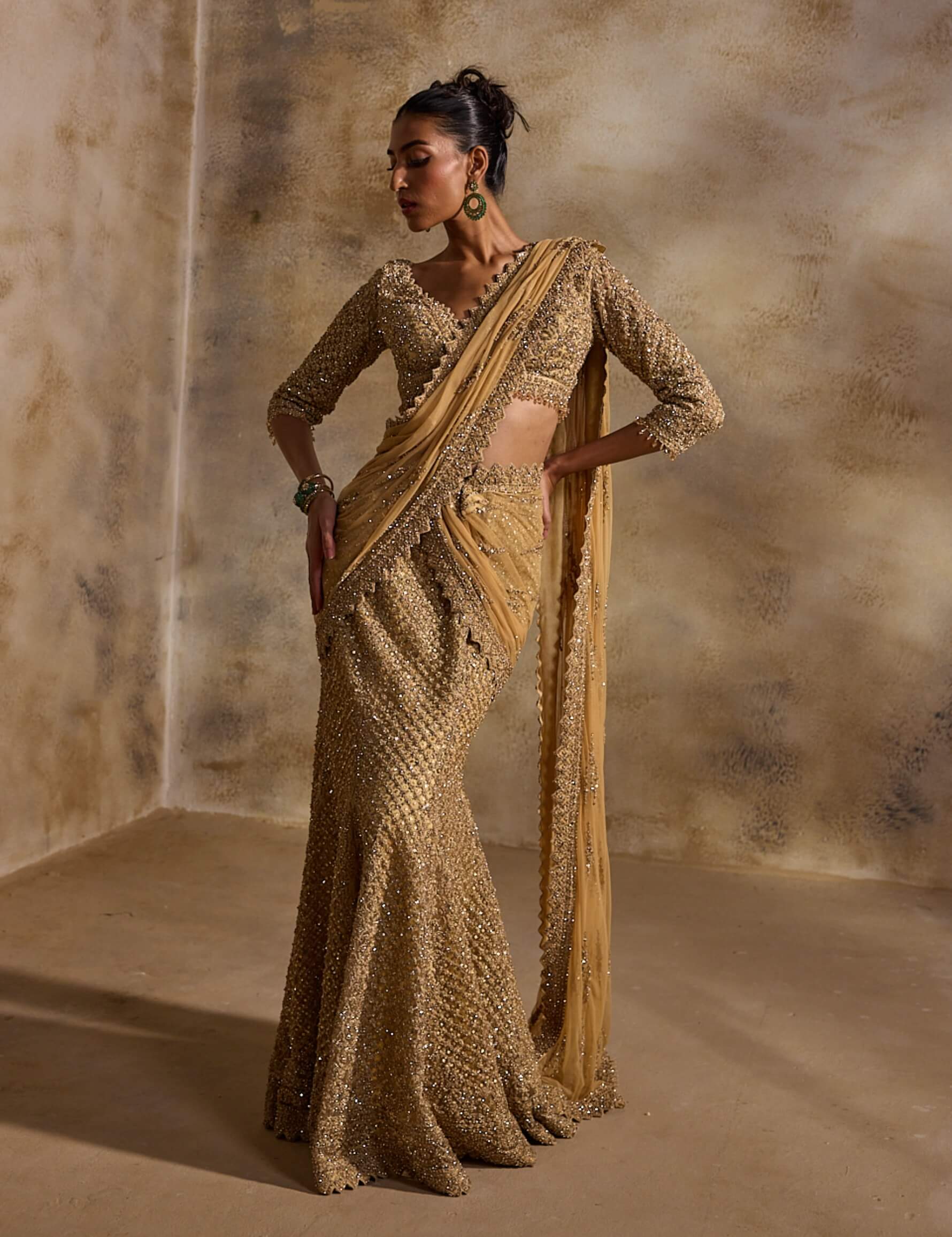 A romantic blush-pink glow illuminates this net sari, embroidered in an intricate jaal of tonal beads, sequins and crystals for soft opulence. Graceful, feminine and refined, it’s ideal for receptions, cocktail nights and elevated festive gatherings.