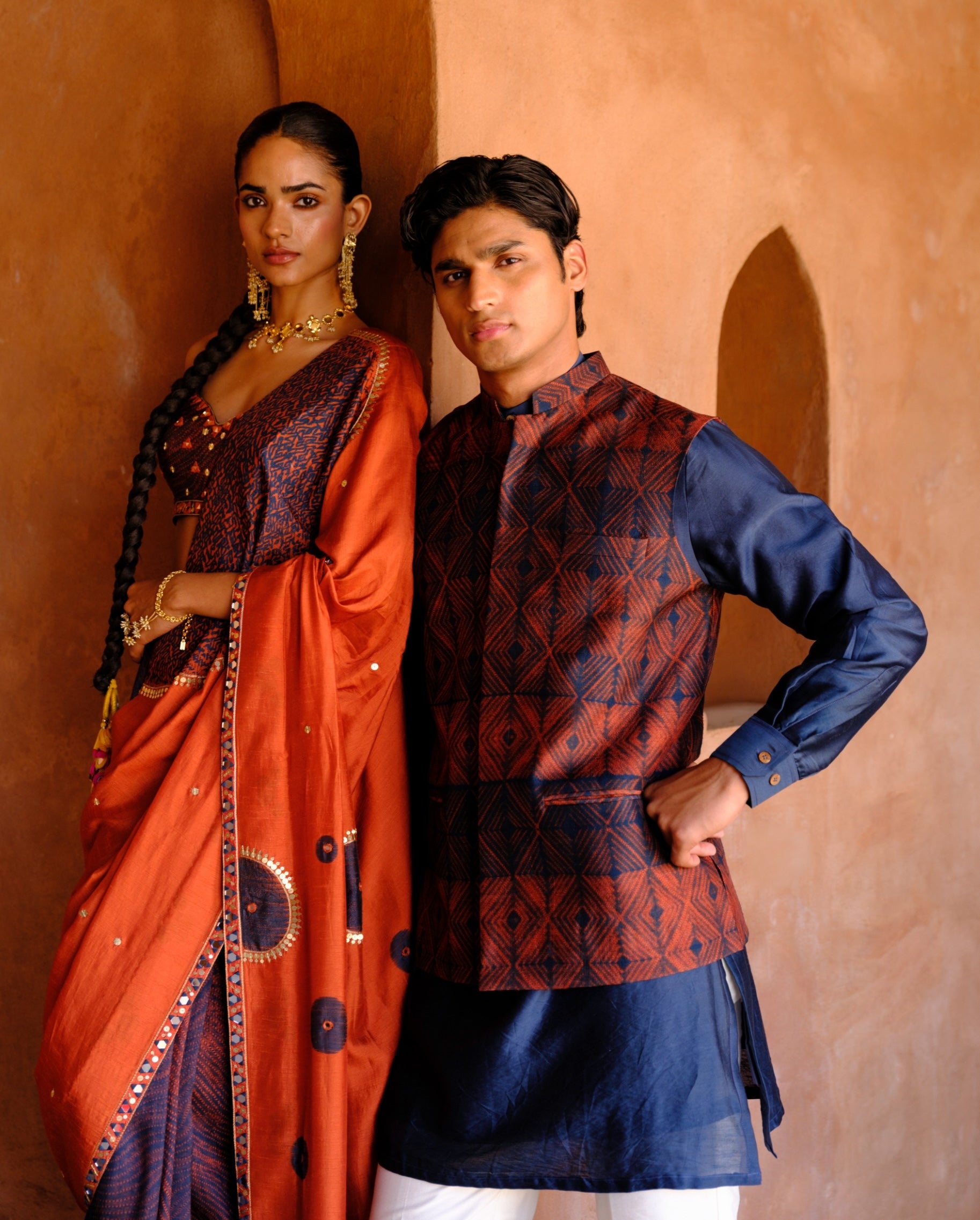 A statement in effortless sophistication, the inaaya bundi set pairs a printed dupion silk bundi with a solid chanderi silk kurta and cotton silk pants. The contrast between the textured bundi and the fluid kurta creates a balanced, refined silhouette. Perfect for festive evenings, intimate celebrations, and wedding festivities, this ensemble offers a modern take on classic indian menswear.
