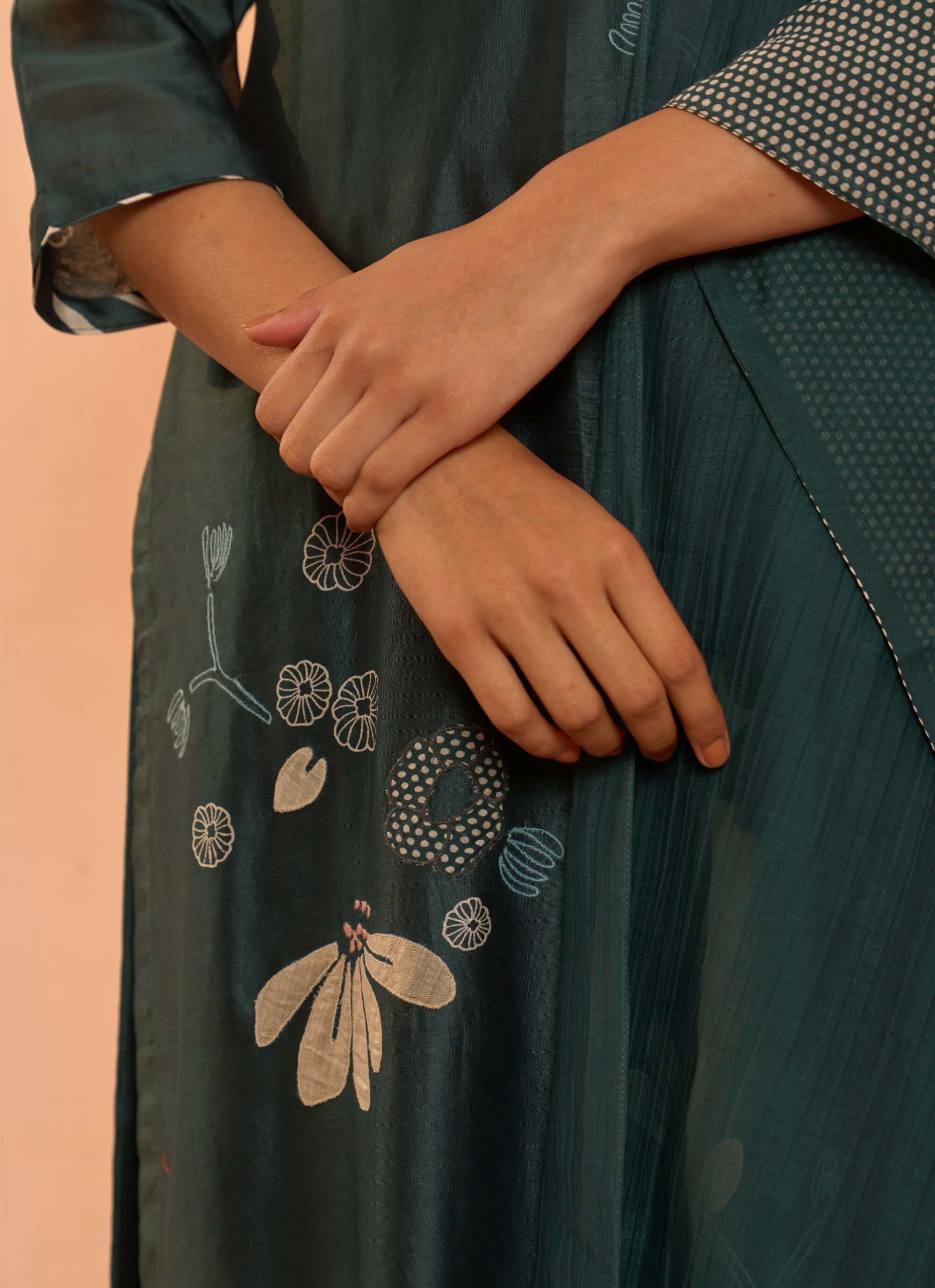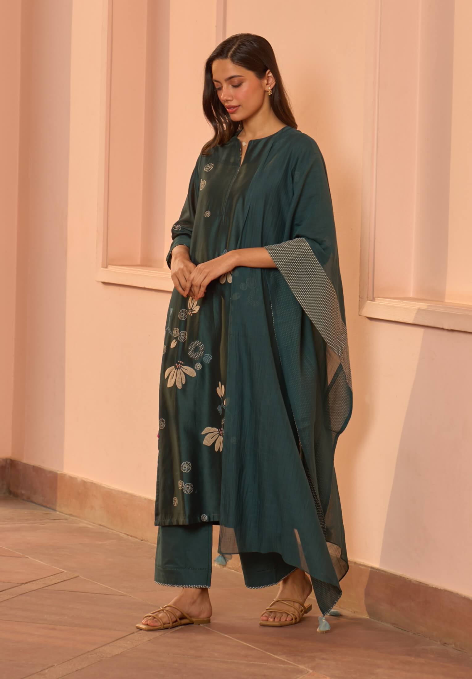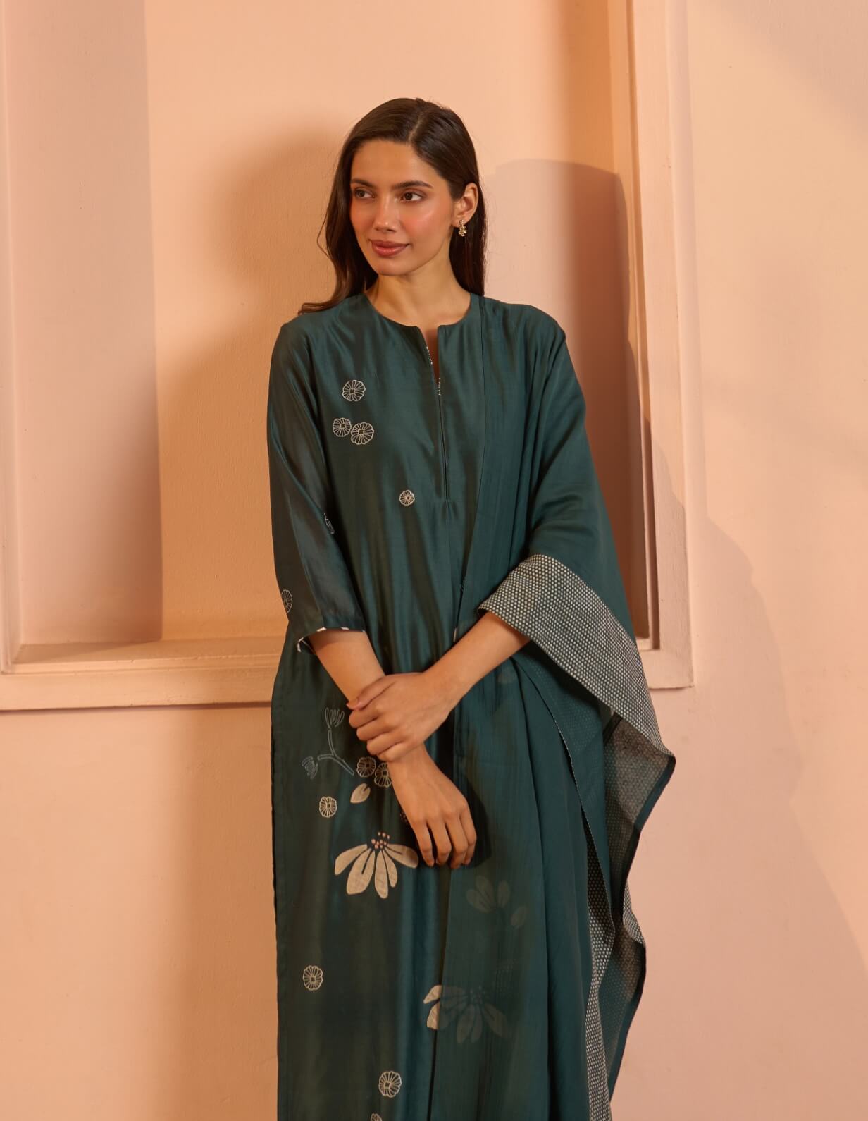 Intricate embroidery brings depth to this calming jade kurta set. Tailored for comfort with a refined modern finish. A timeless ensemble rooted in craftsmanship.
