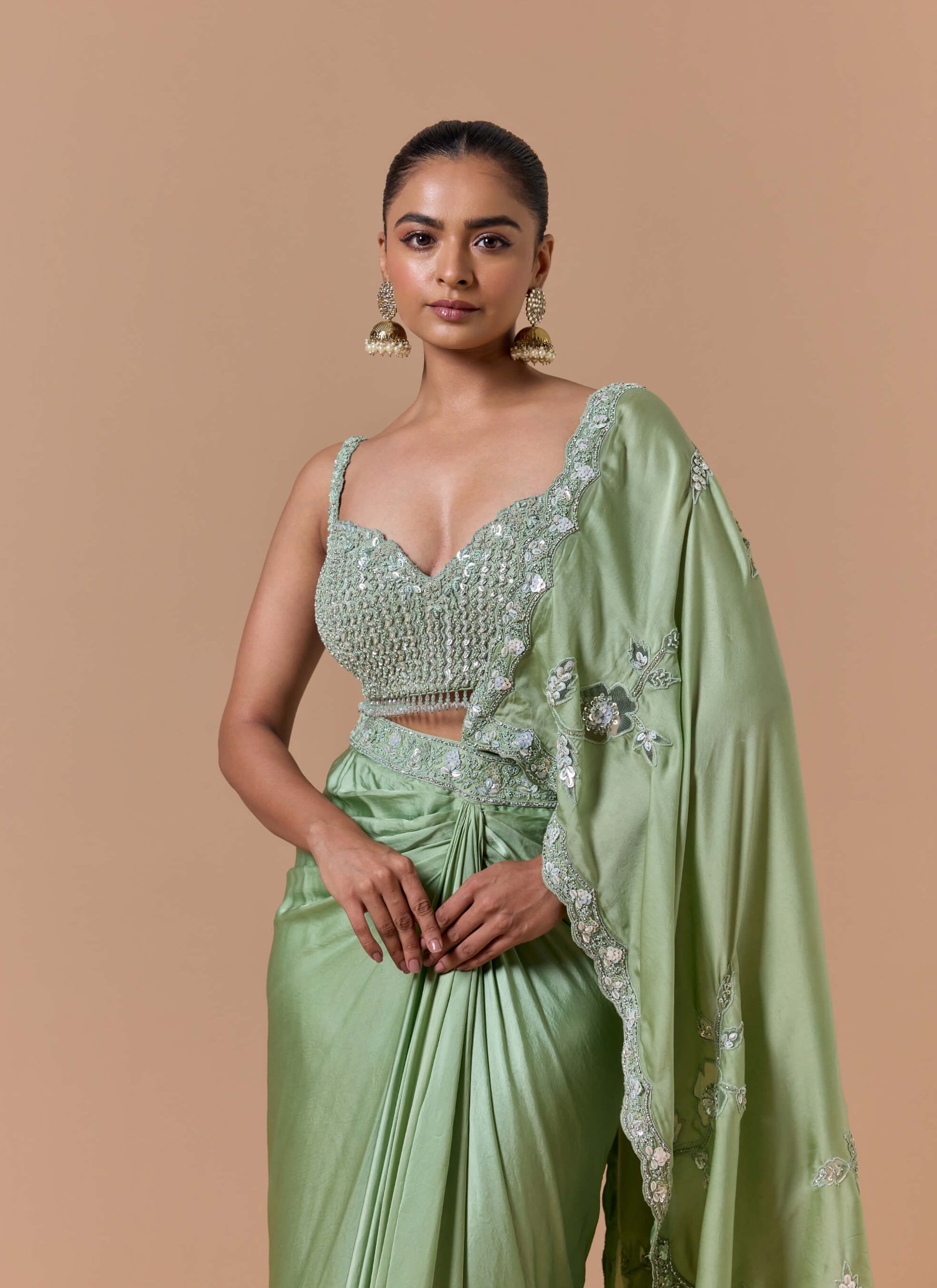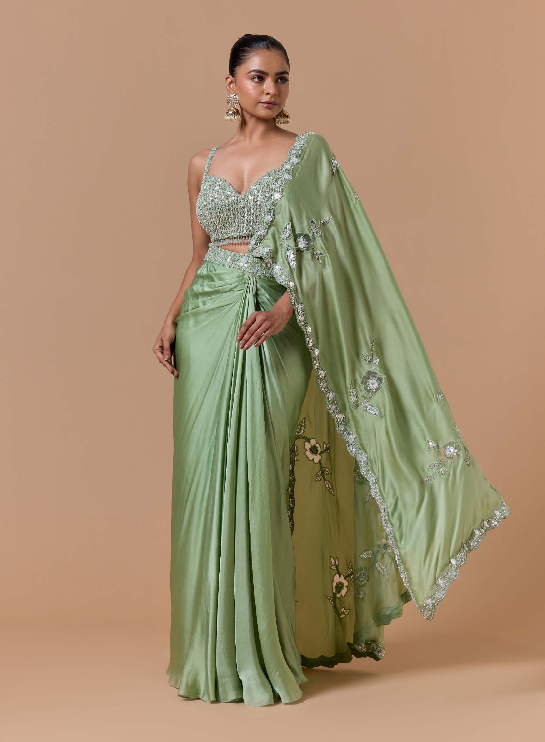 Emerald elegance comes alive in this jade-green satin pre-draped sari with net floral appliqué on the palla and a fully embroidered blouse accented with metallics, beads and sequins—ideal for receptions, evening weddings and celebratory occasions.