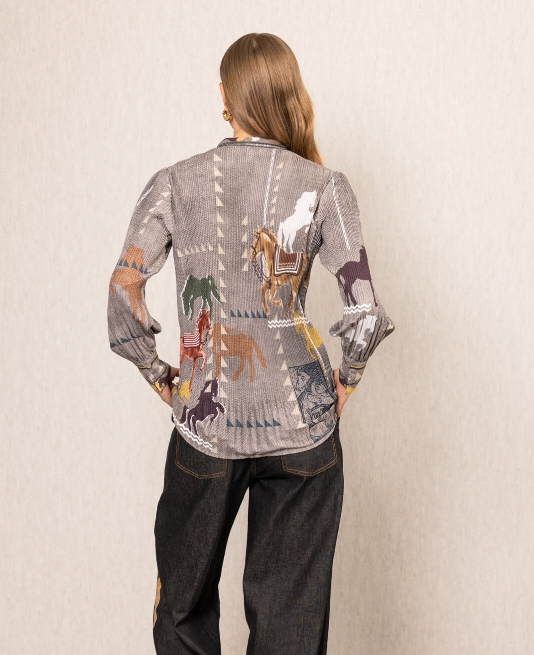 The knight pleated shirt redefines classics with heatset crepe in multi tones. Soft pleats and a pointed collar meet the irish horse print, inspired by vintage cavalry tapestries. Layered with geometric accents, reins, and saddle motifs, the shirt balances structure with relaxed flow. A statement choice for refined workdays, chic dinners, or transitional styling.