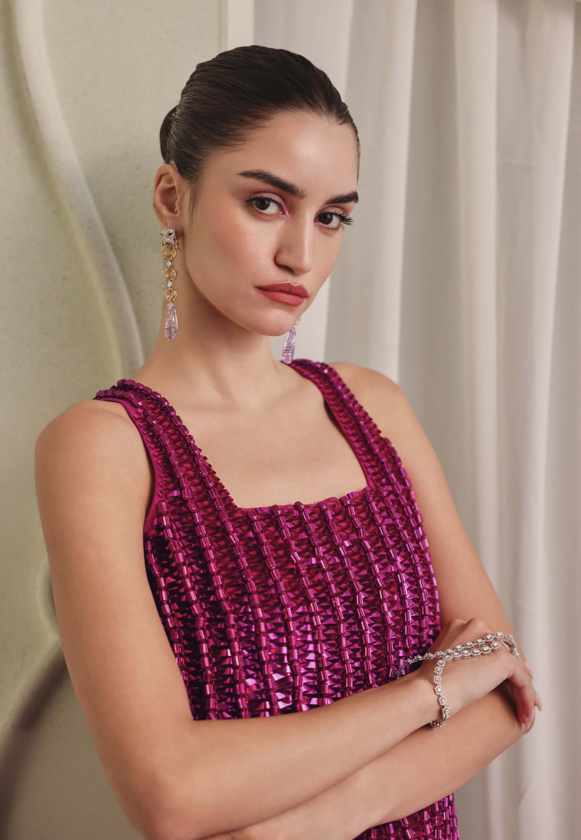 Sculptural and striking, this magenta mini dress shimmers with intricate ribbon-sequin embroidery. With its structured silhouette and bold square neckline, it’s a modern icon for cocktail nights and statement soirées.